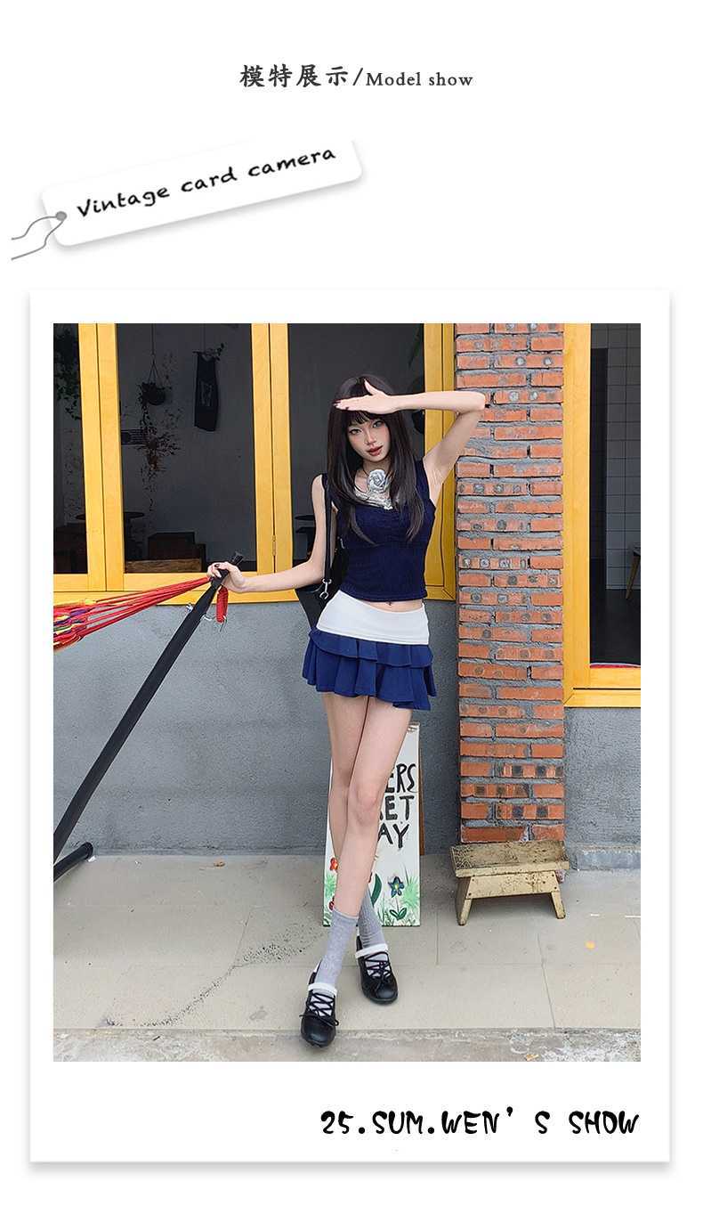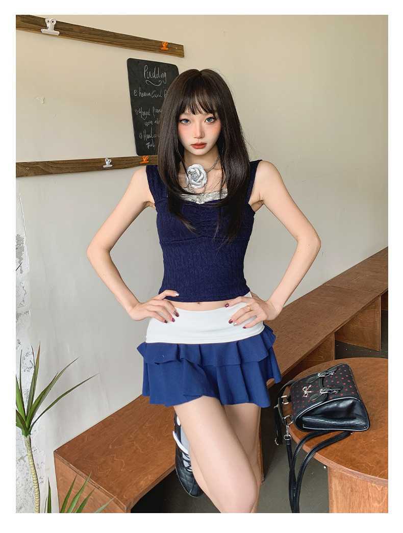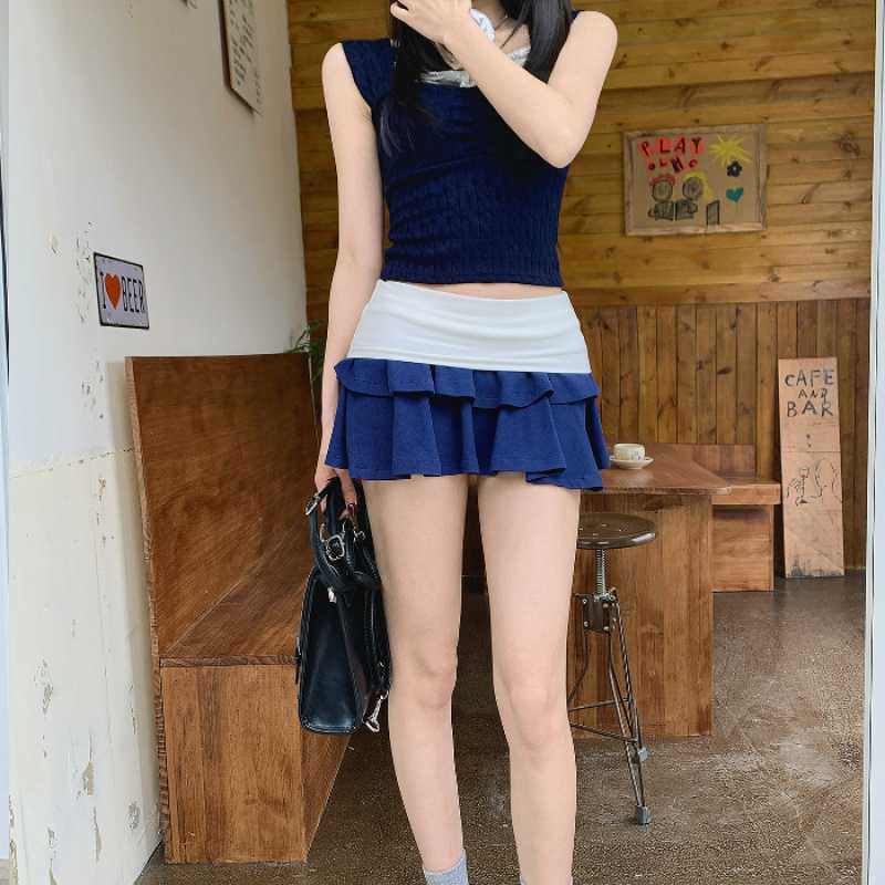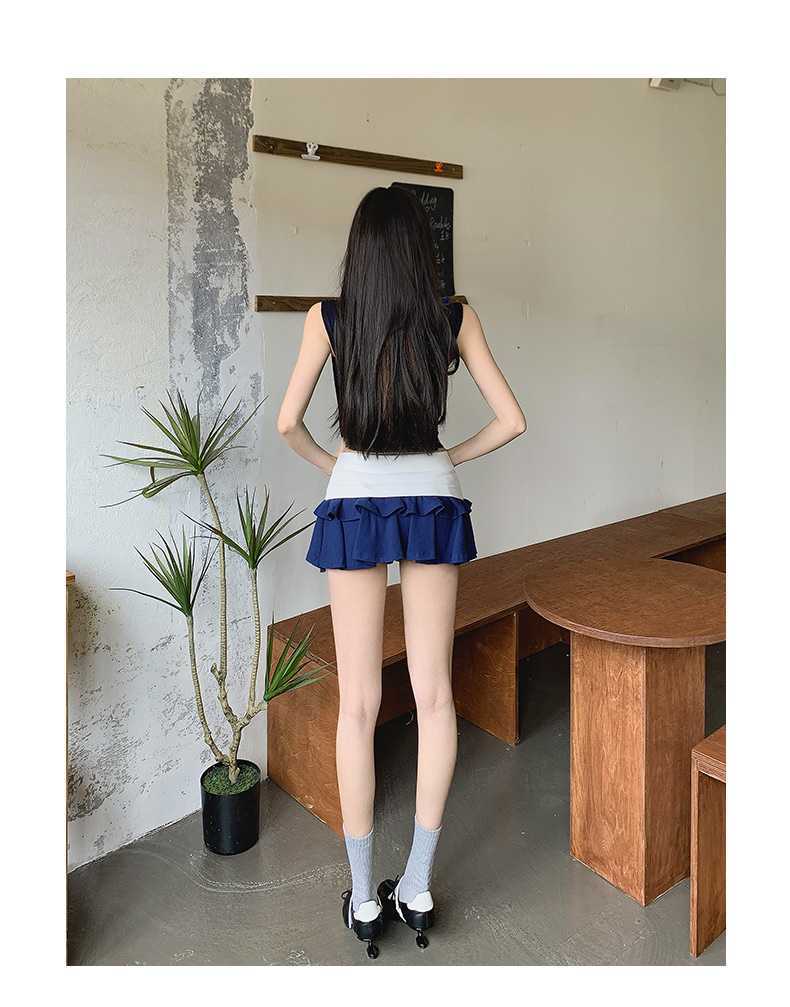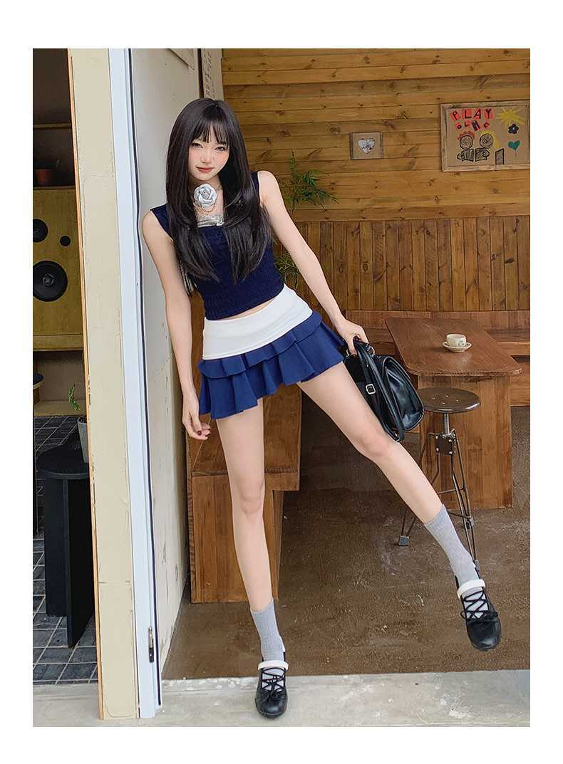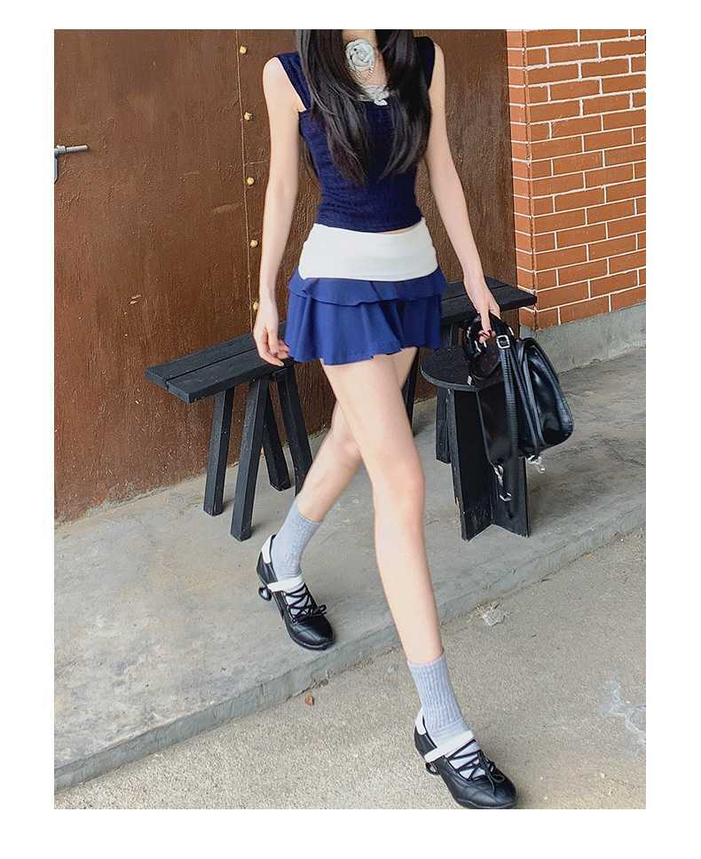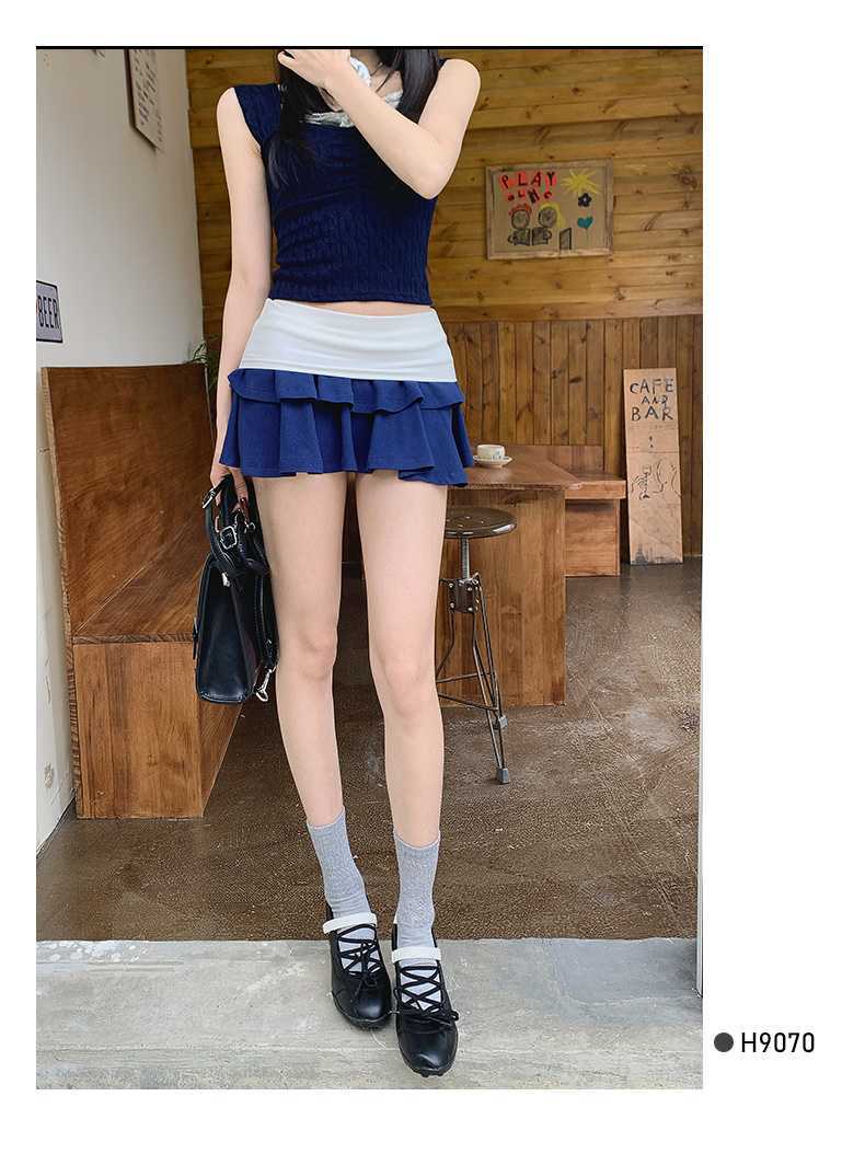 도매 드롭 배송 여름 미국 복고풍 하이 웨이스트 대비 색상 블루 달콤한 핫 소녀 하프 길이 주름 짧은 스커트스토어 가기