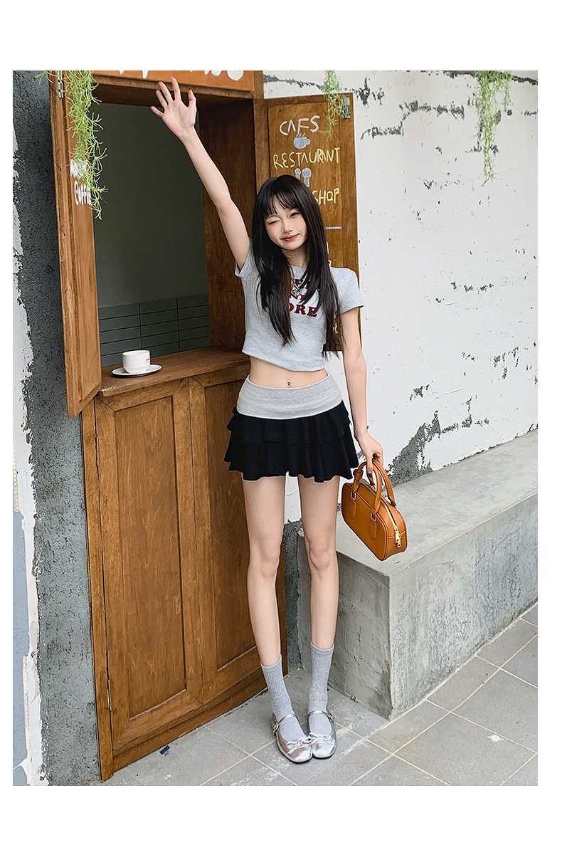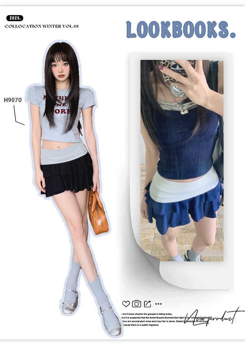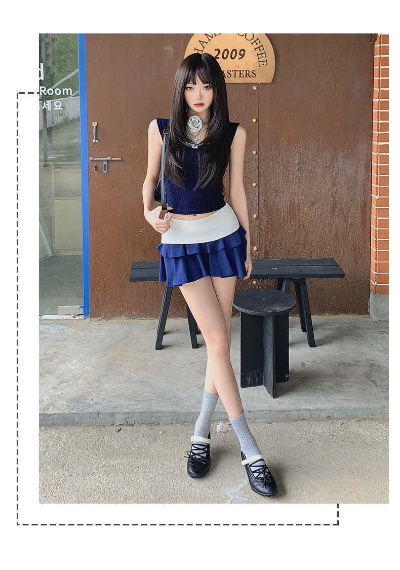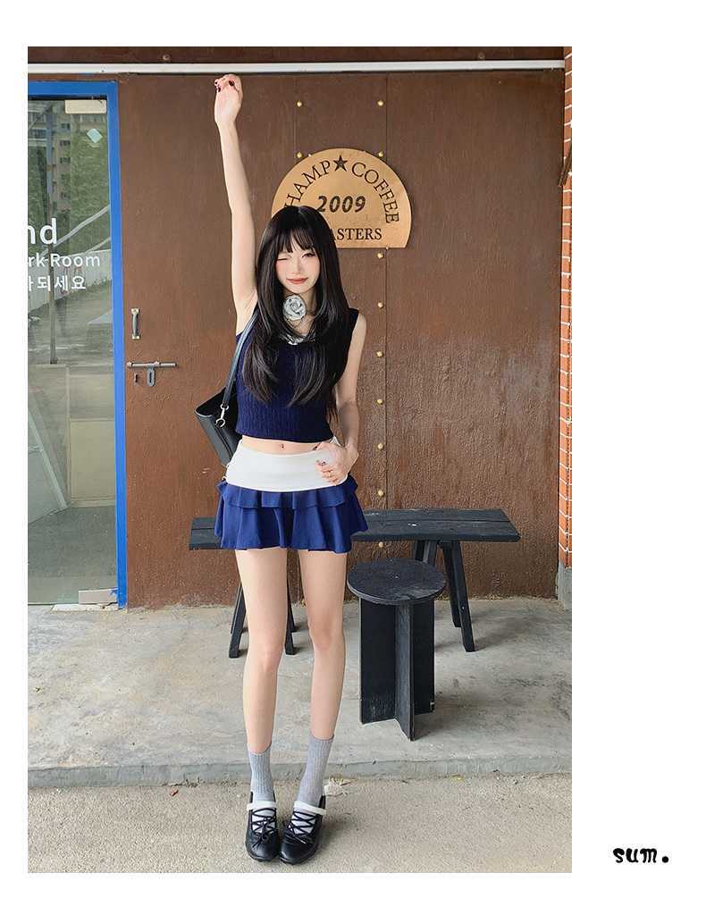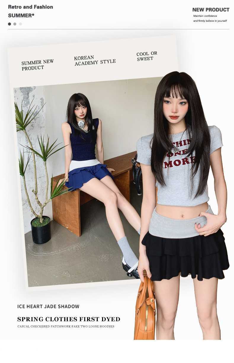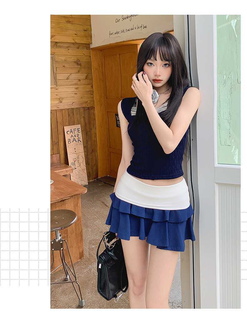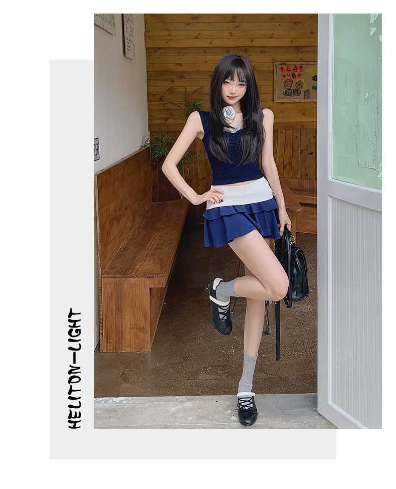 도매 드롭 배송 여름 미국 복고풍 하이 웨이스트 대비 색상 블루 달콤한 핫 소녀 하프 길이 주름 짧은 스커트스토어 가기