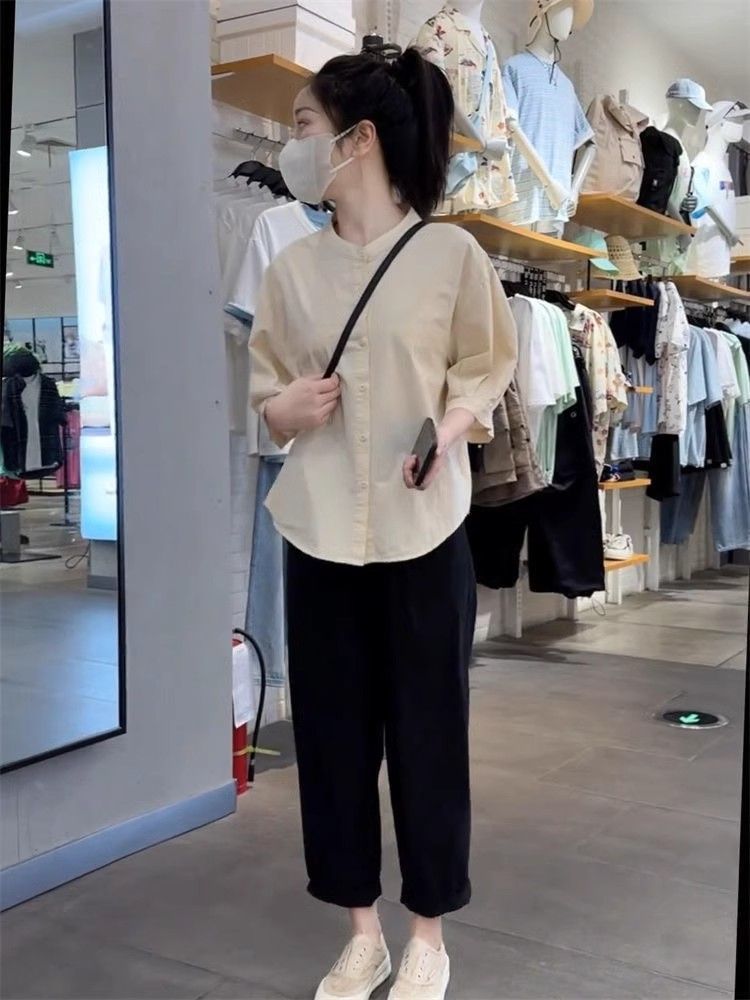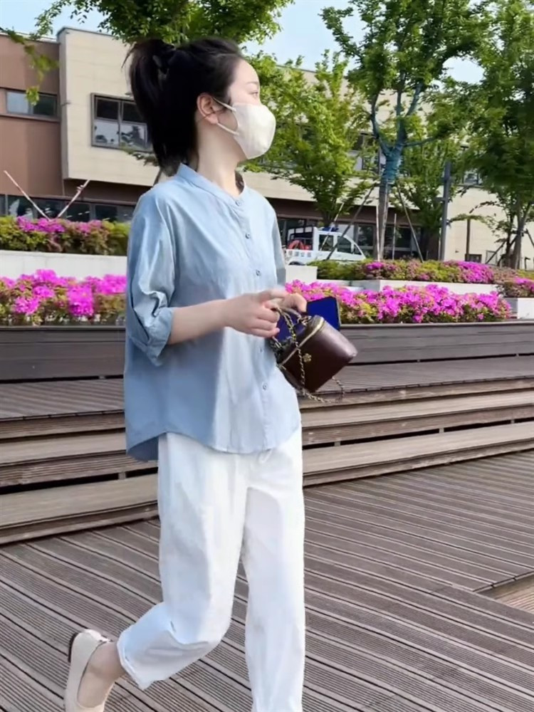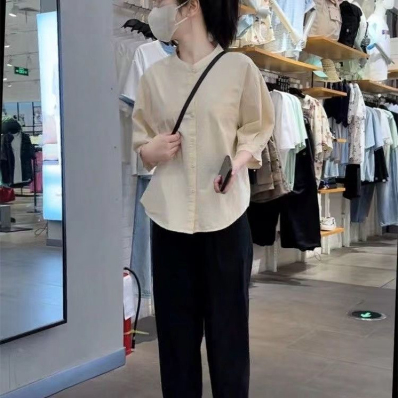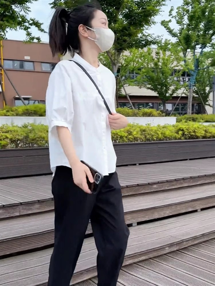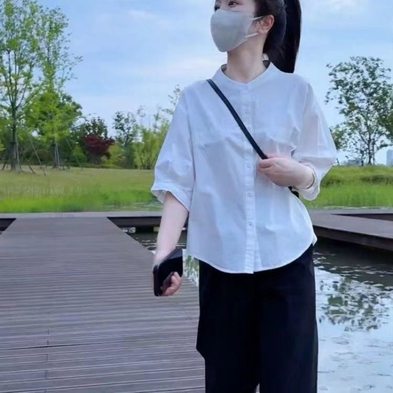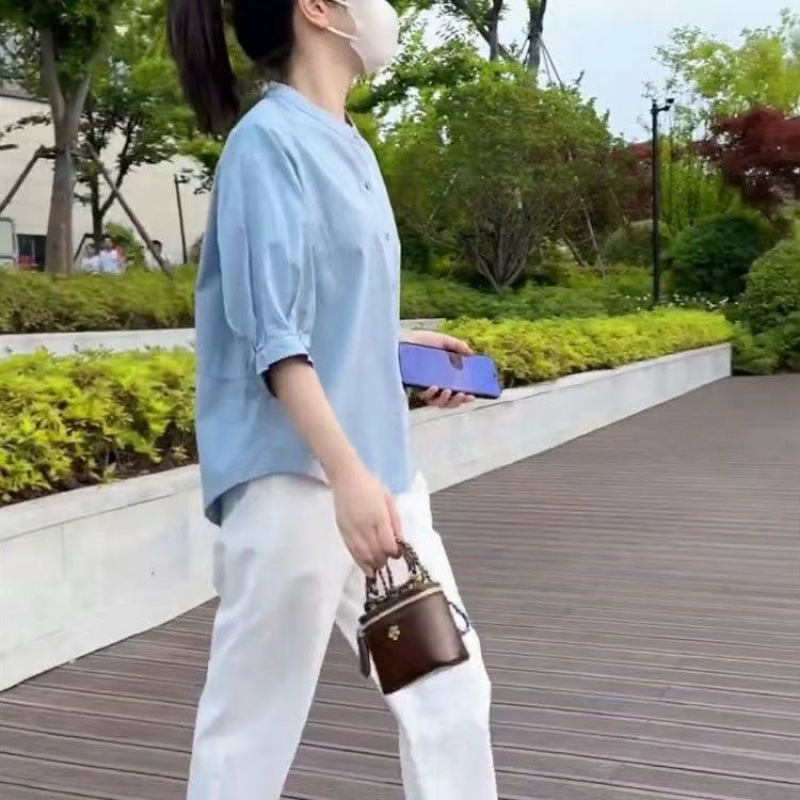 얇은 100 면 둥근 목 중간 소매 느슨한 셔츠 여성의 2025 년 여름 새로운 스타일 벨리 커버 슬리밍 심플한면 셔츠스토어 가기