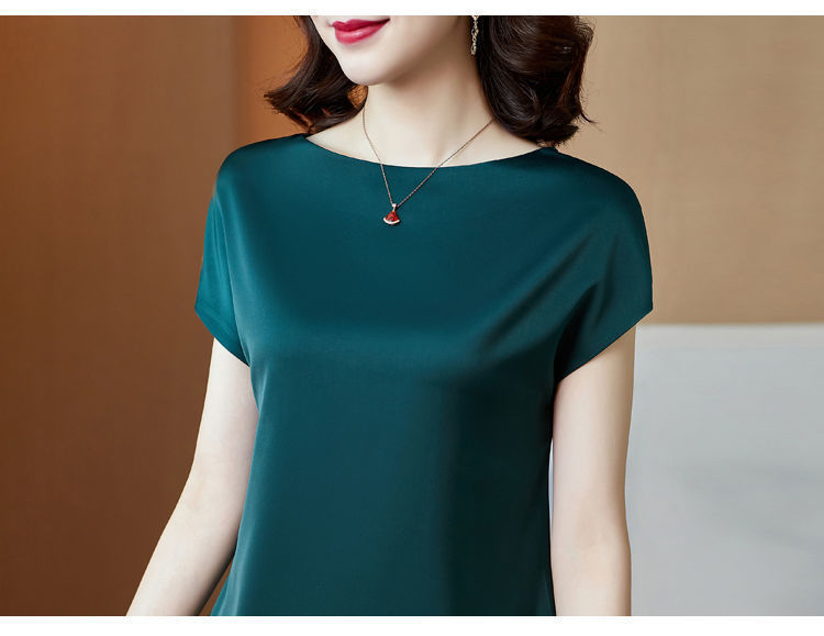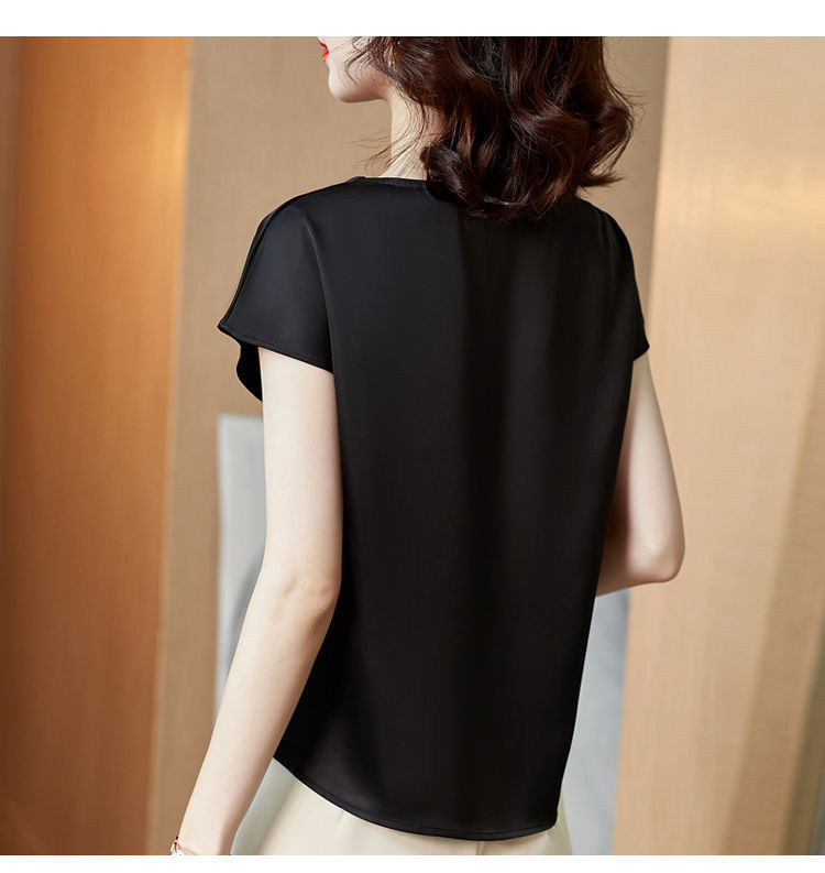 Acetic Acid Fabric Satin 탑 하이 엔드베이스 셔츠 여성의 봄과 여름 실키 웨스턴 스타일 원피스 어깨 반팔 티셔츠