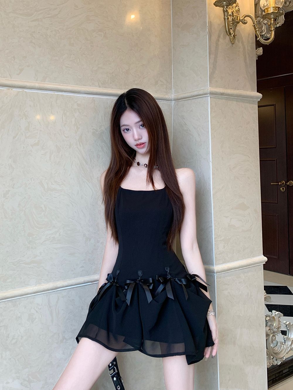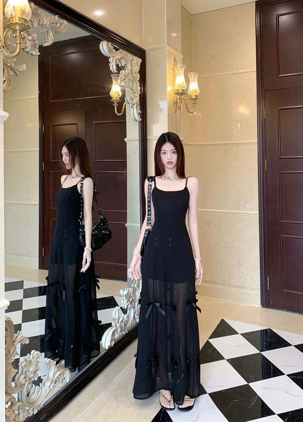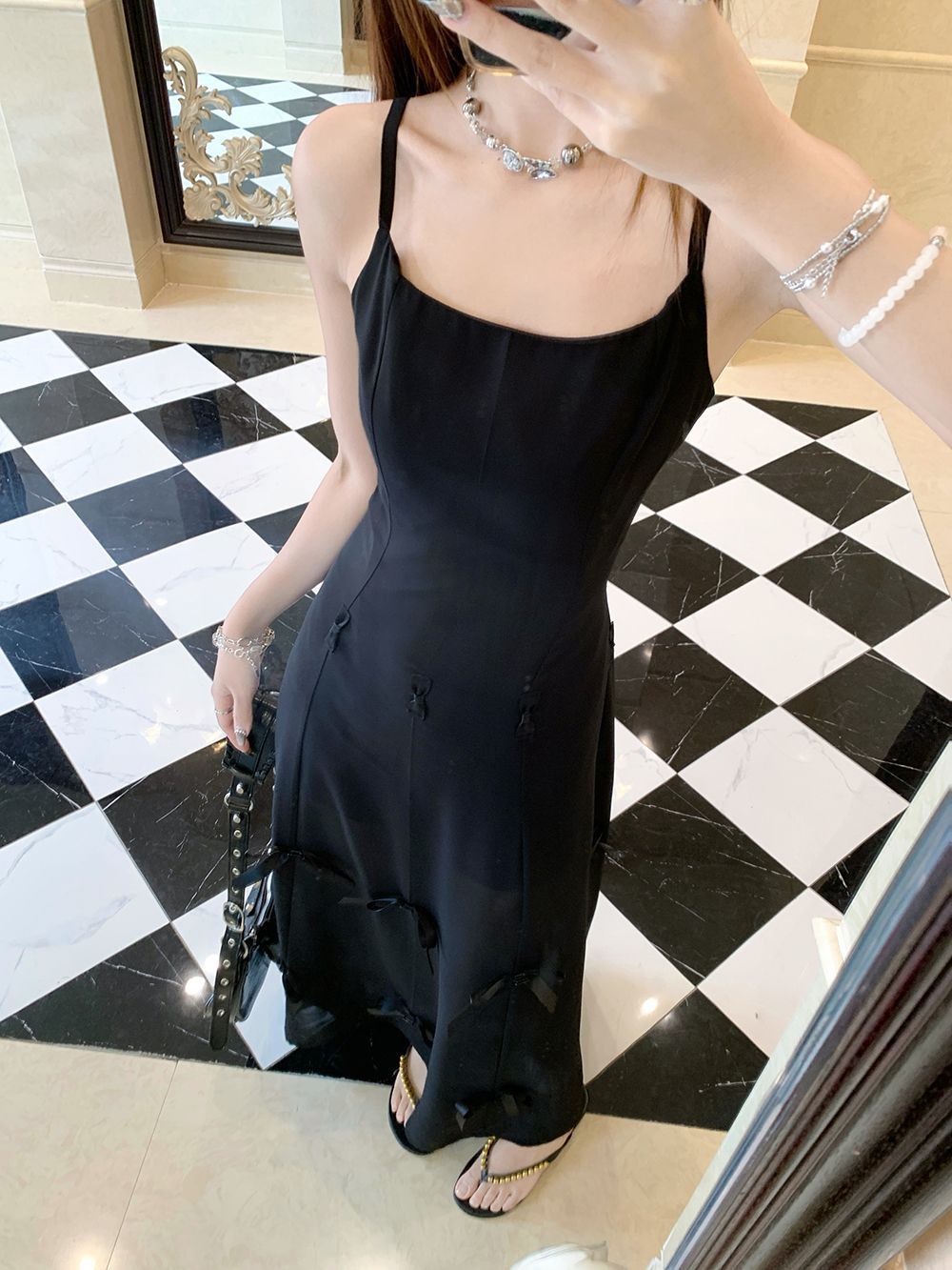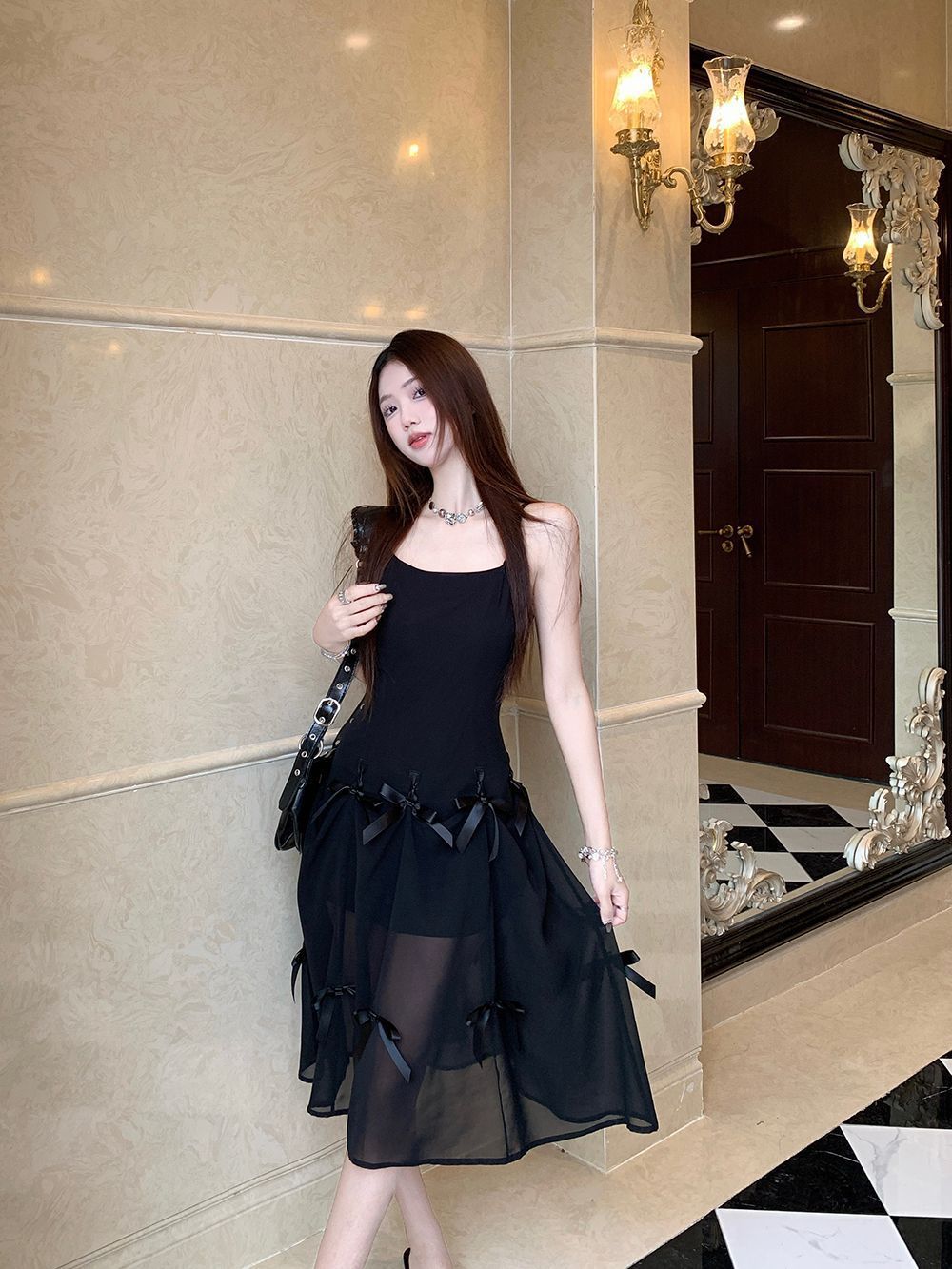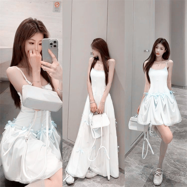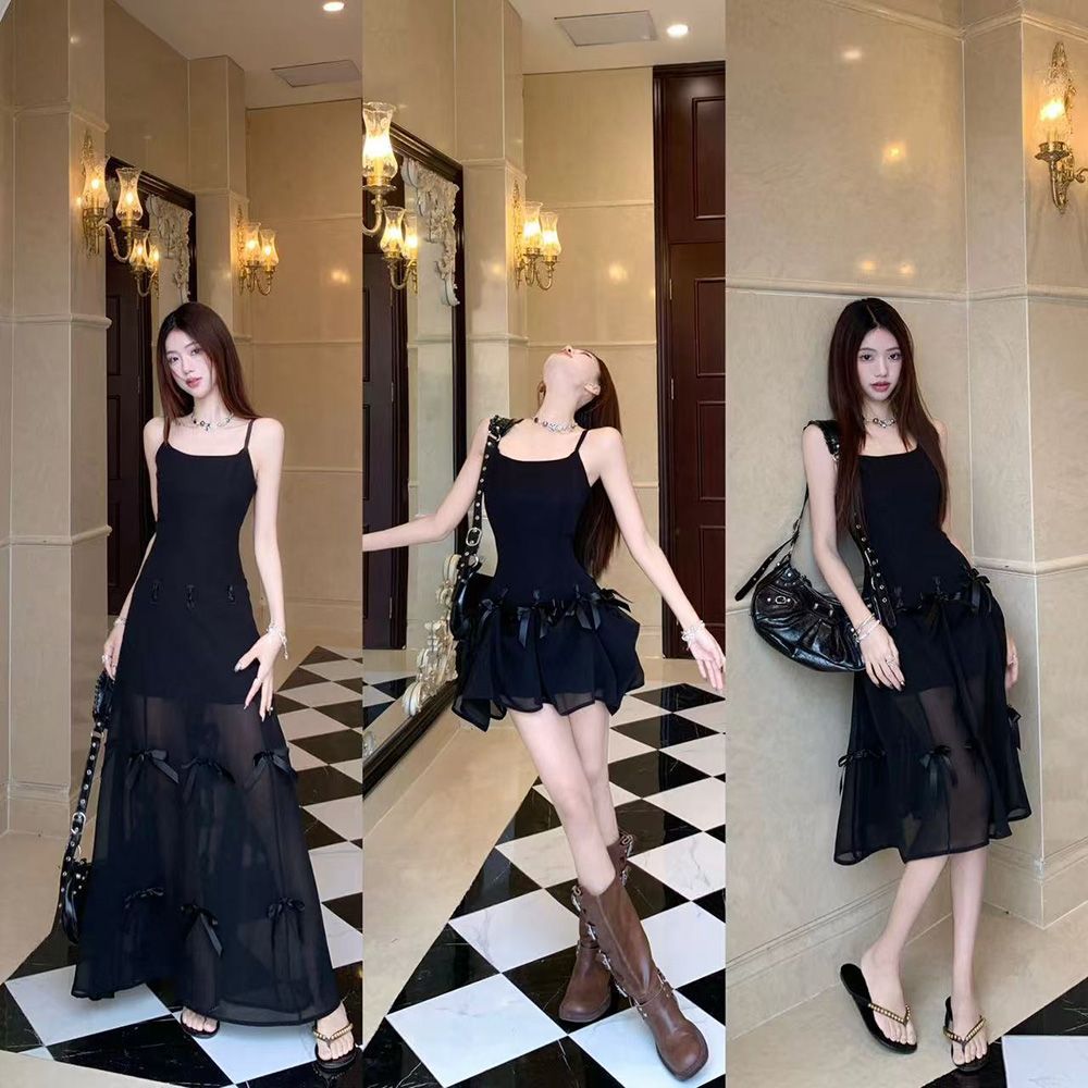 활 우아한 슬리밍 슬링 원피스 여성의 2025 봄과 여름 디자인 센스 더블웨어 슈퍼 요정 허리 슬리밍 긴 원피스스토어 가기