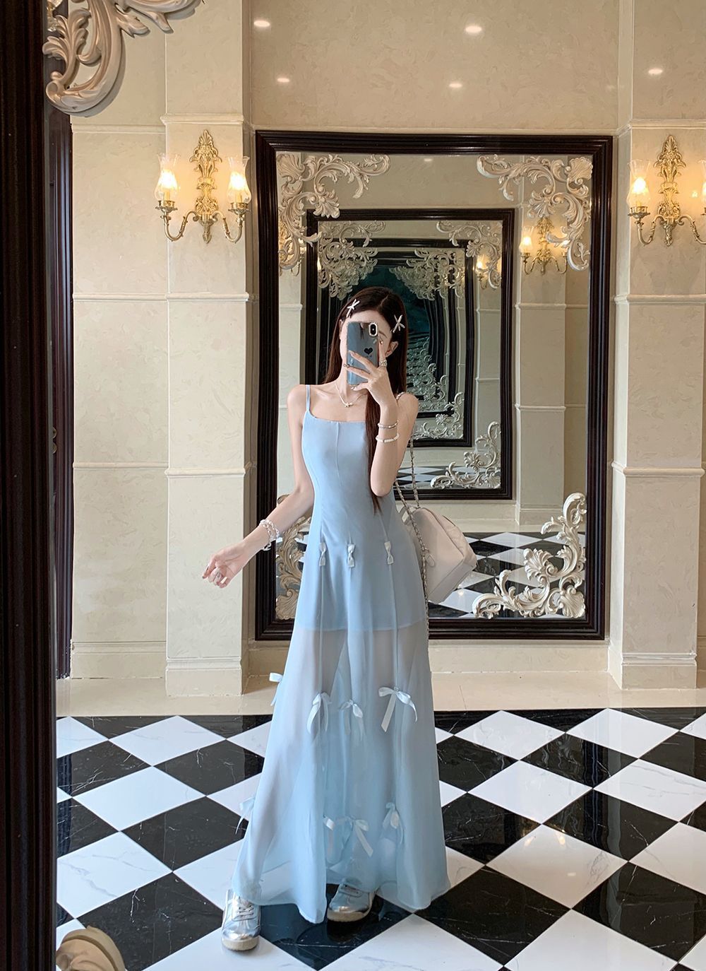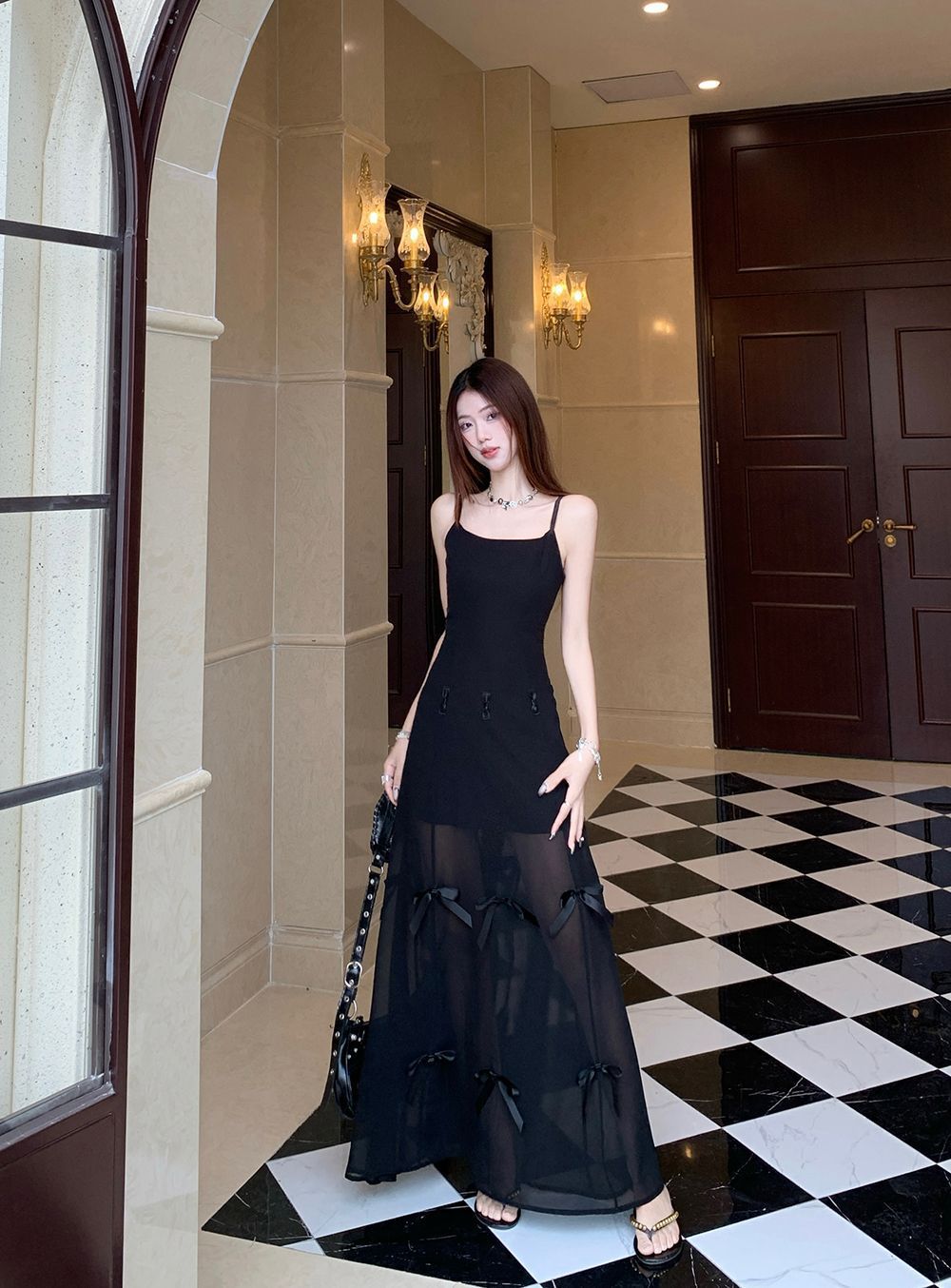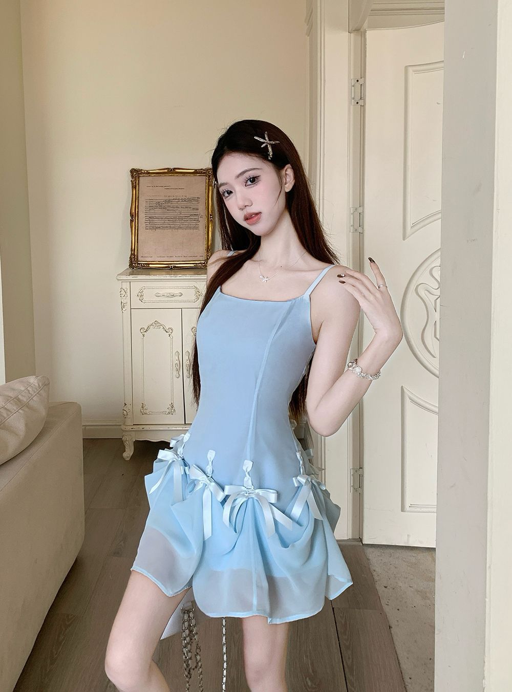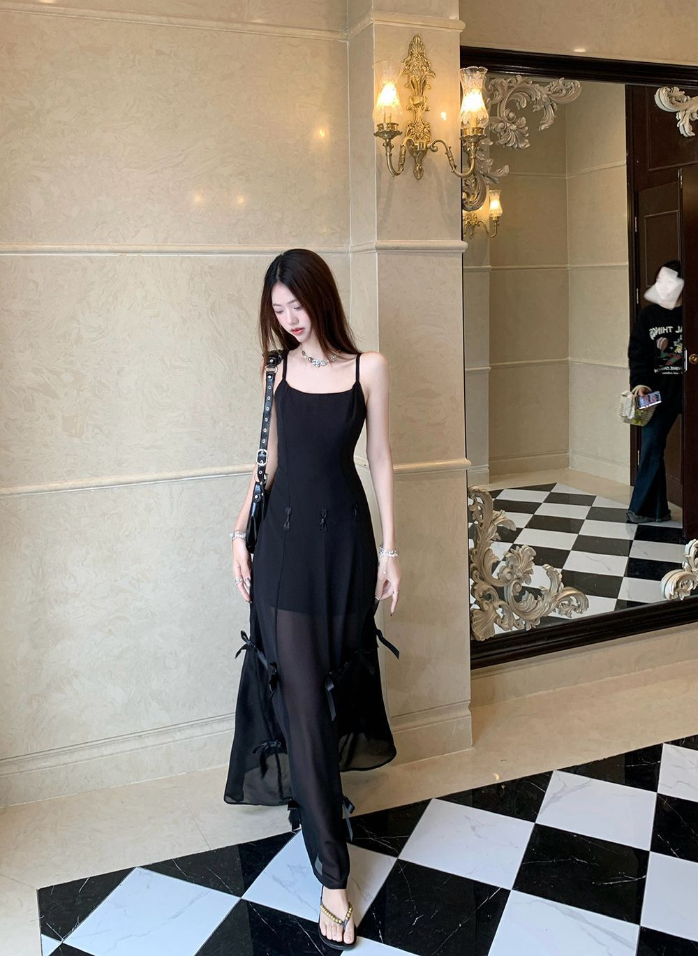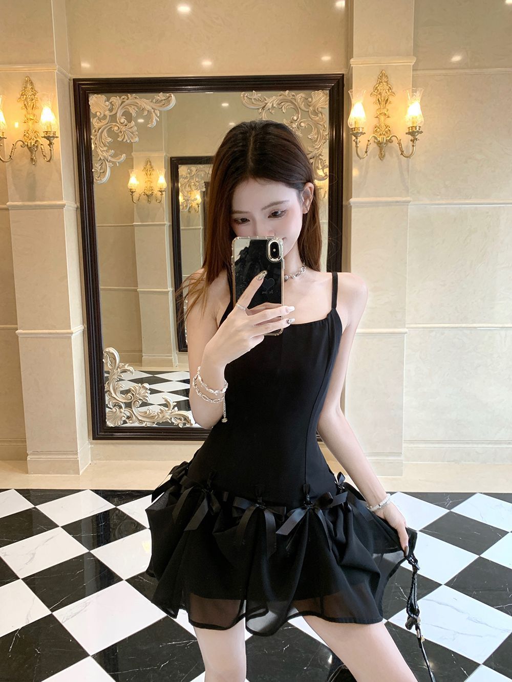 활 우아한 슬리밍 슬링 원피스 여성의 2025 봄과 여름 디자인 센스 더블웨어 슈퍼 요정 허리 슬리밍 긴 원피스스토어 가기
