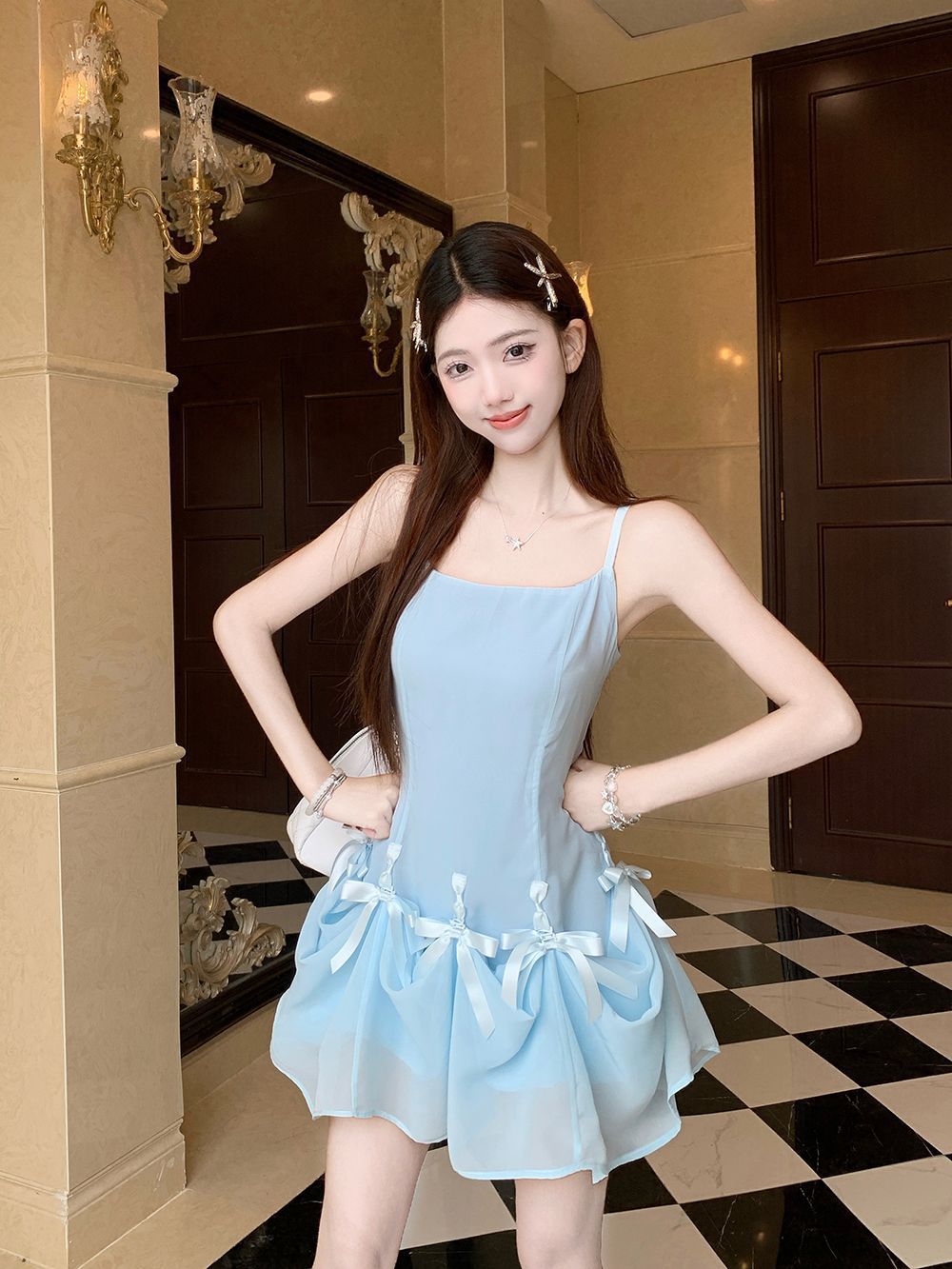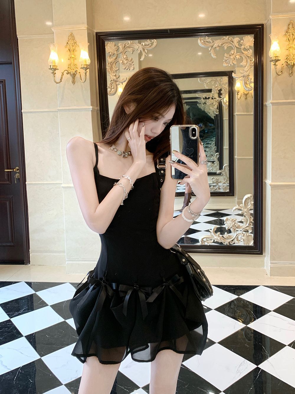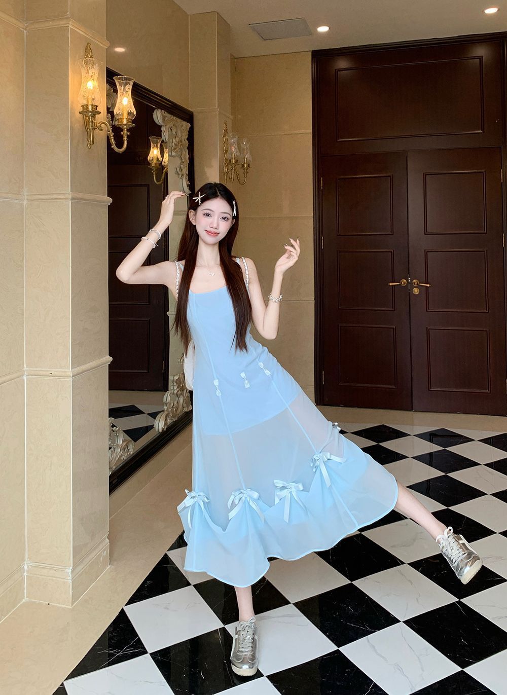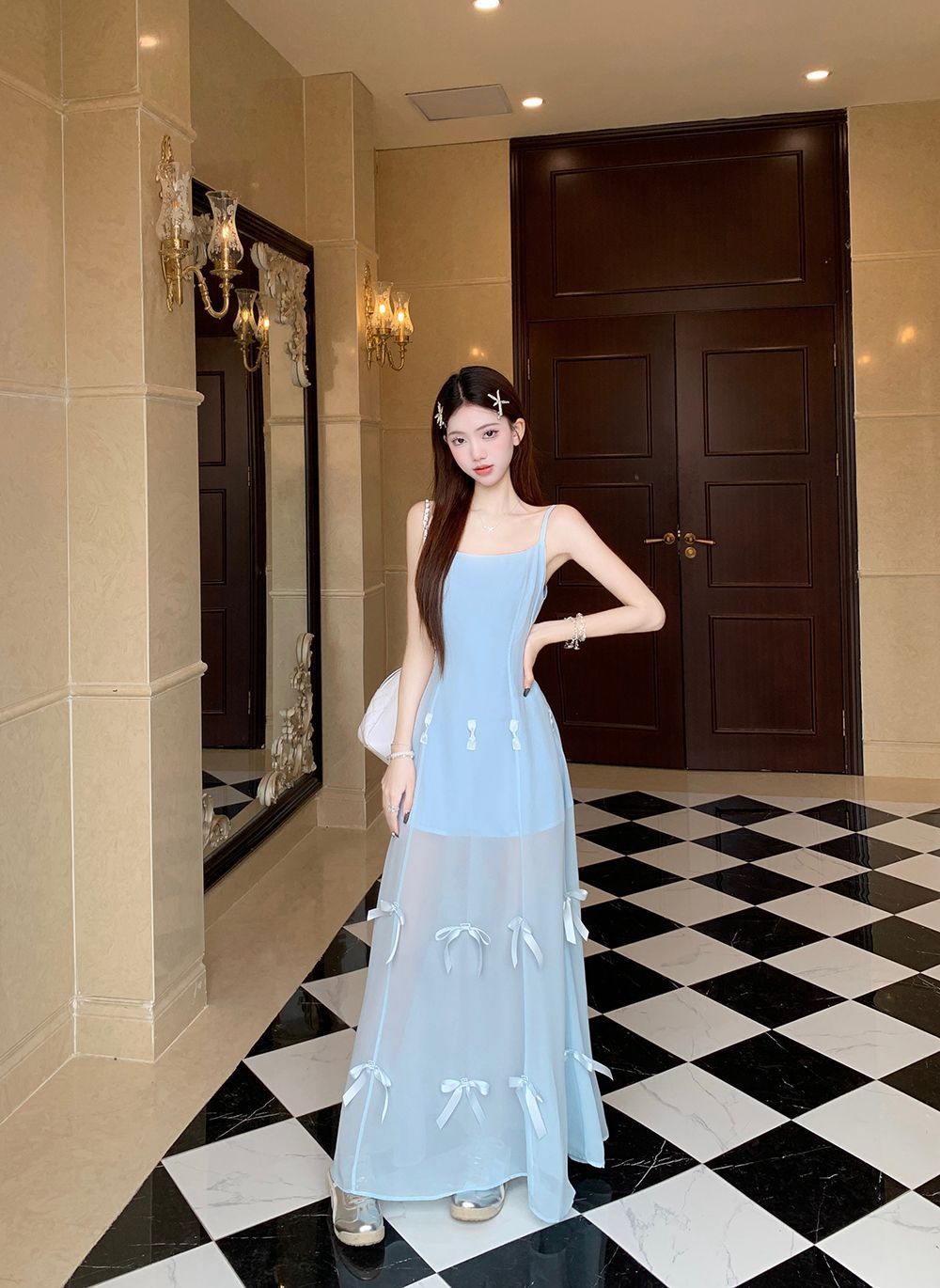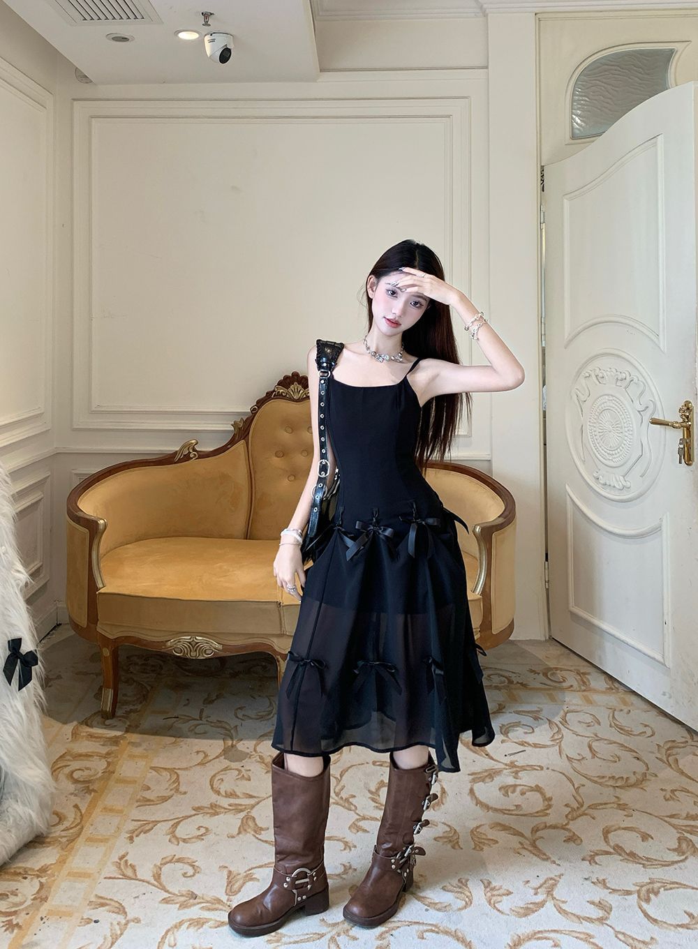 활 우아한 슬리밍 슬링 원피스 여성의 2025 봄과 여름 디자인 센스 더블웨어 슈퍼 요정 허리 슬리밍 긴 원피스스토어 가기