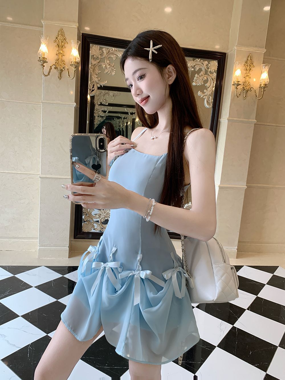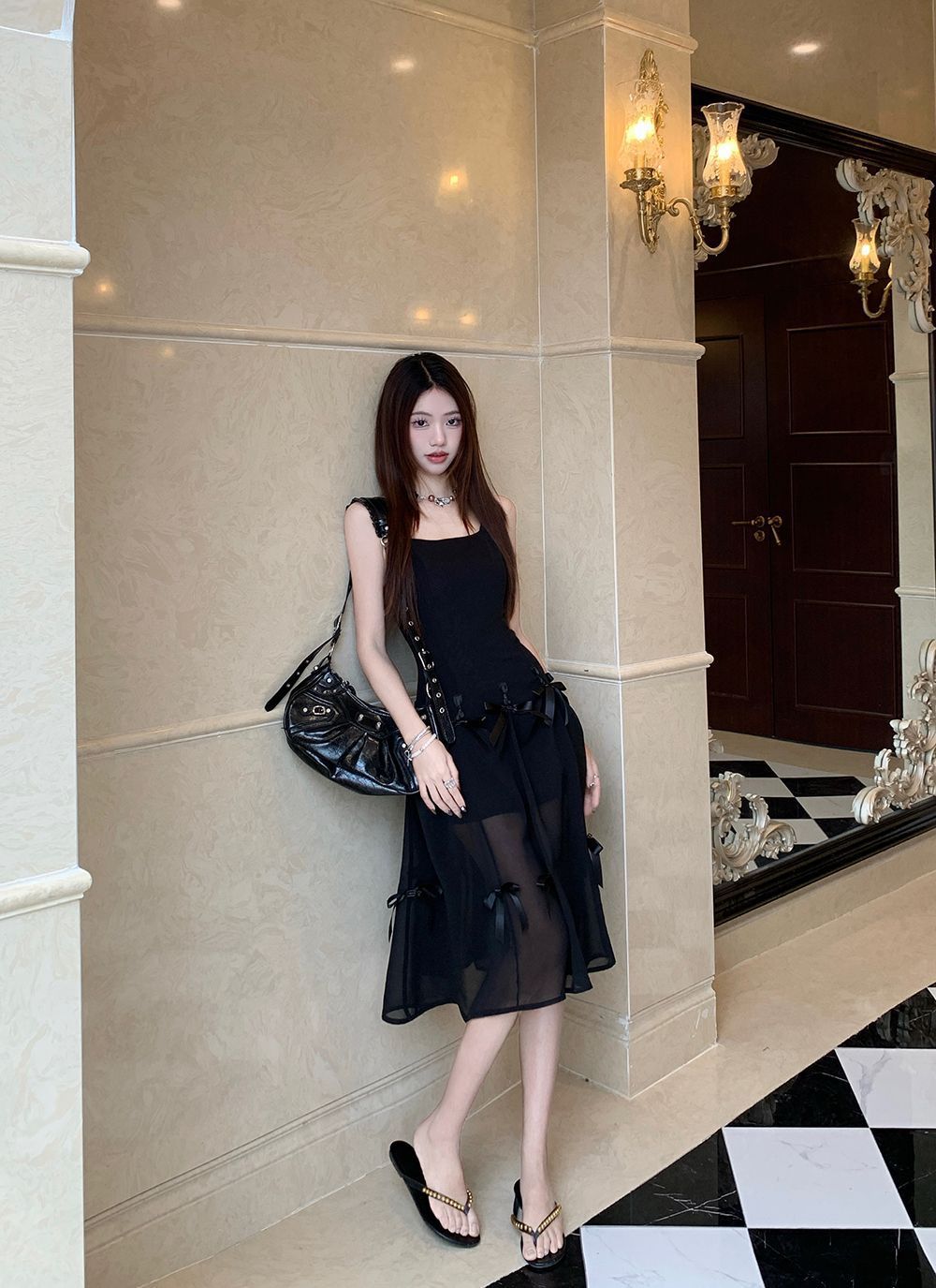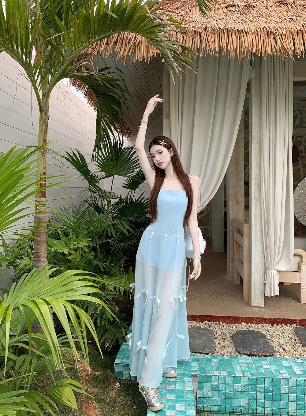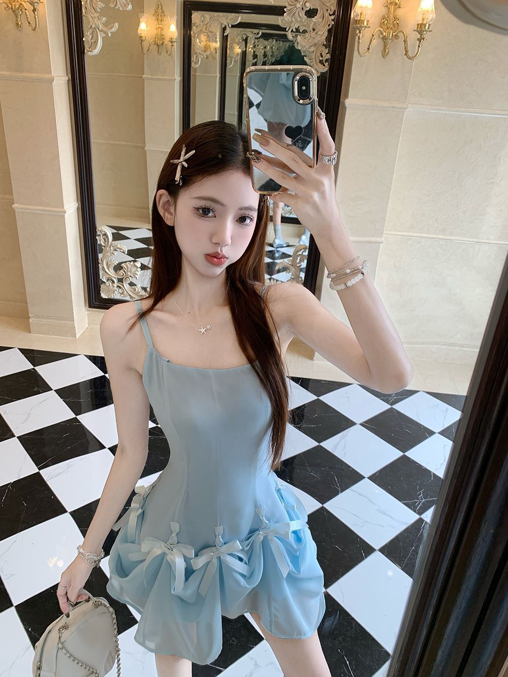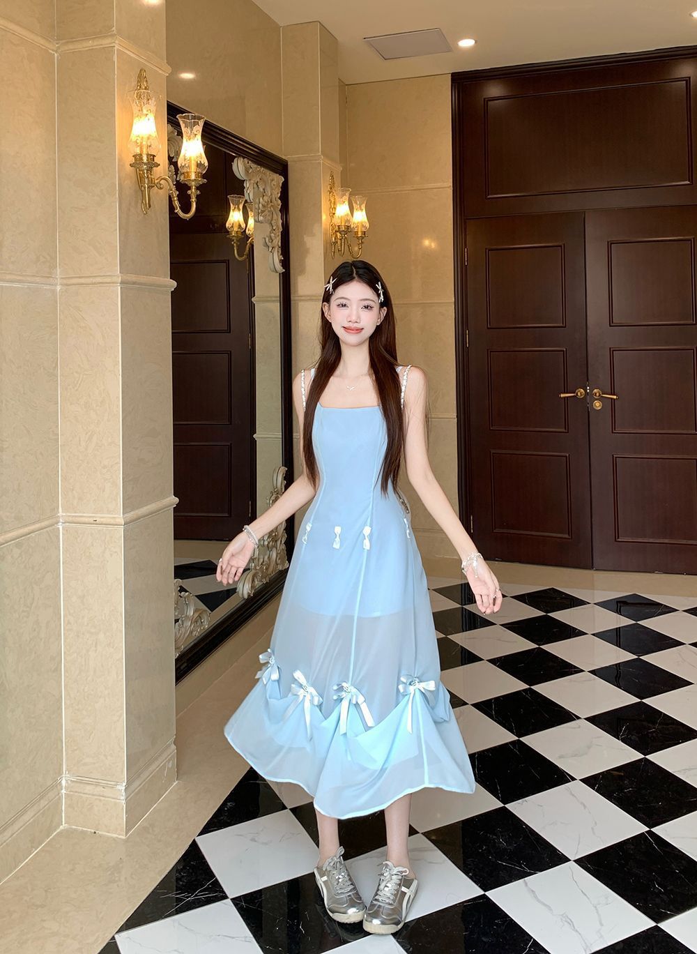 활 우아한 슬리밍 슬링 원피스 여성의 2025 봄과 여름 디자인 센스 더블웨어 슈퍼 요정 허리 슬리밍 긴 원피스스토어 가기