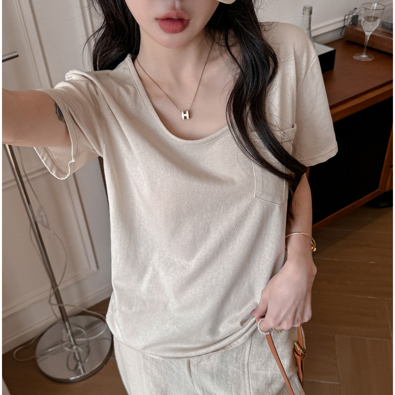 엄격한 선택 느슨한 슬리밍 게으른 스타일 탑 여성의 봄과 여름 2025 새로운 포켓 디자인 눈송이 면 반팔 티셔츠