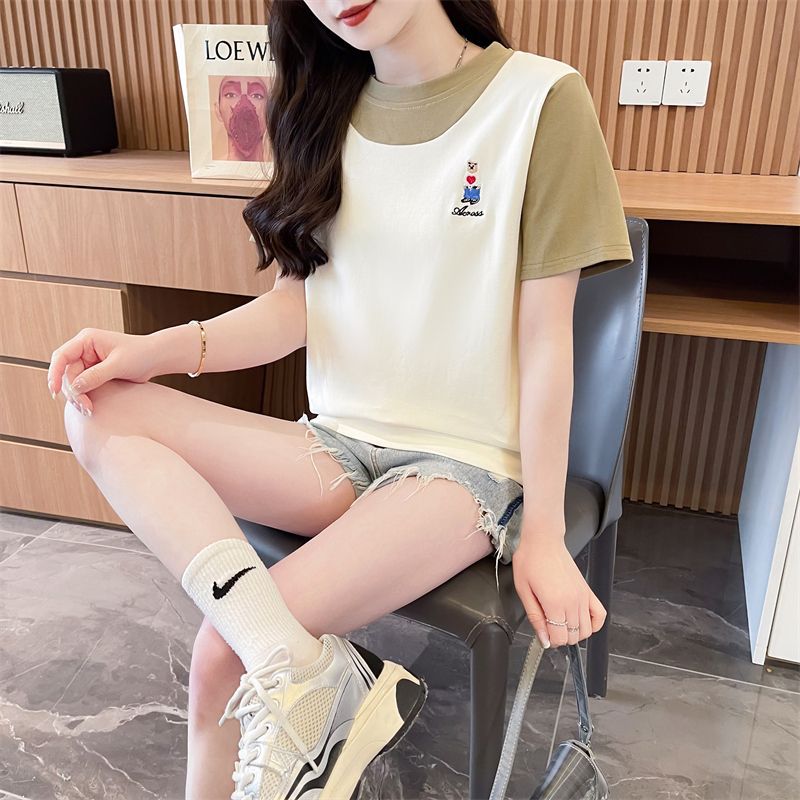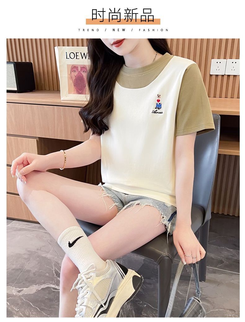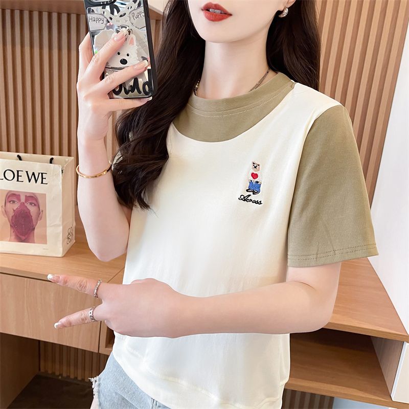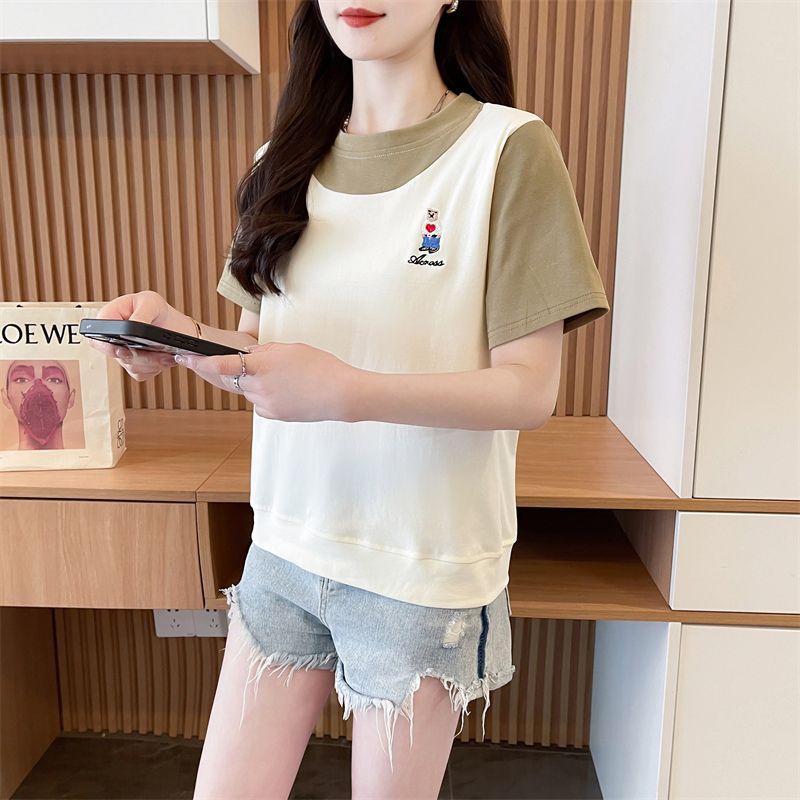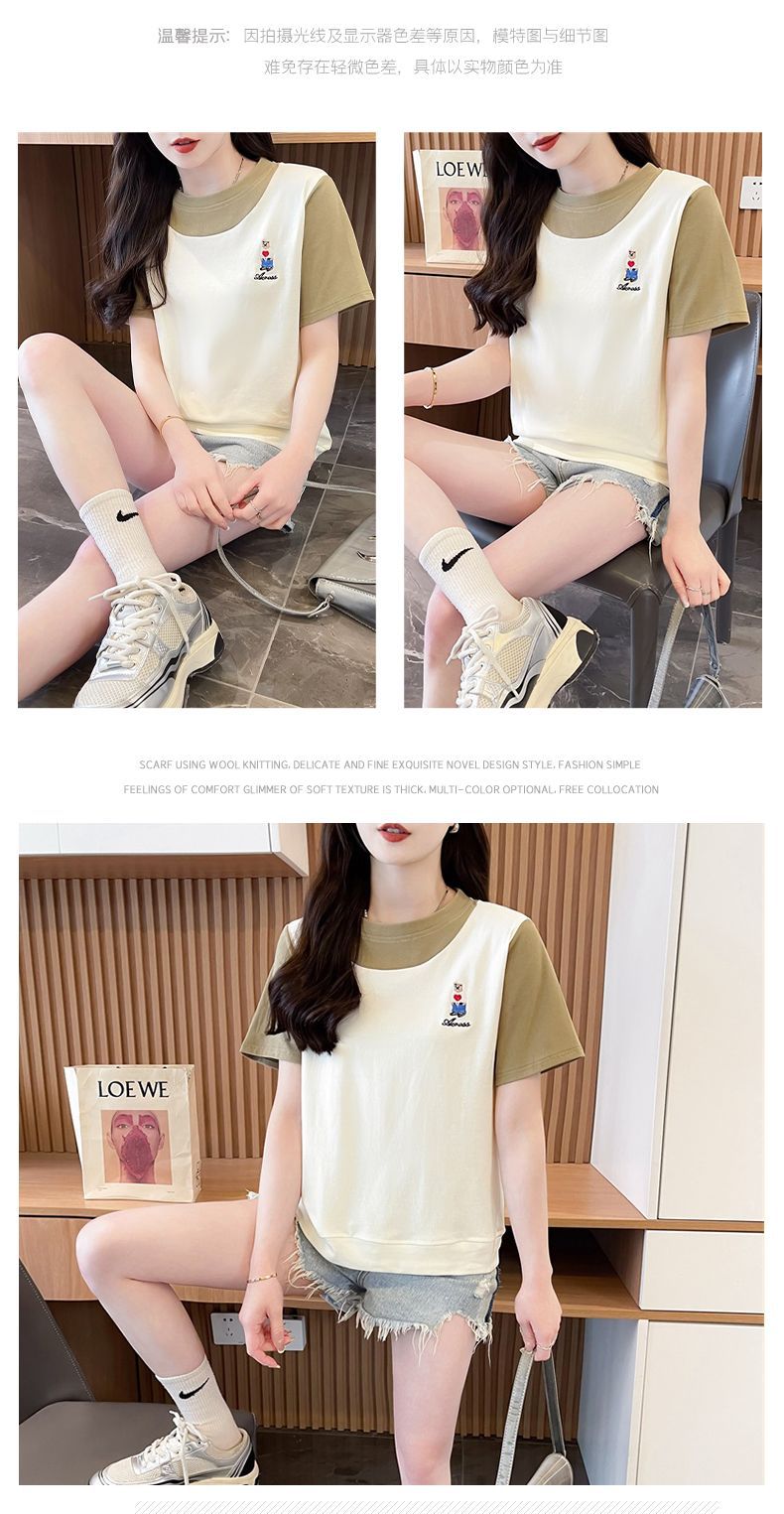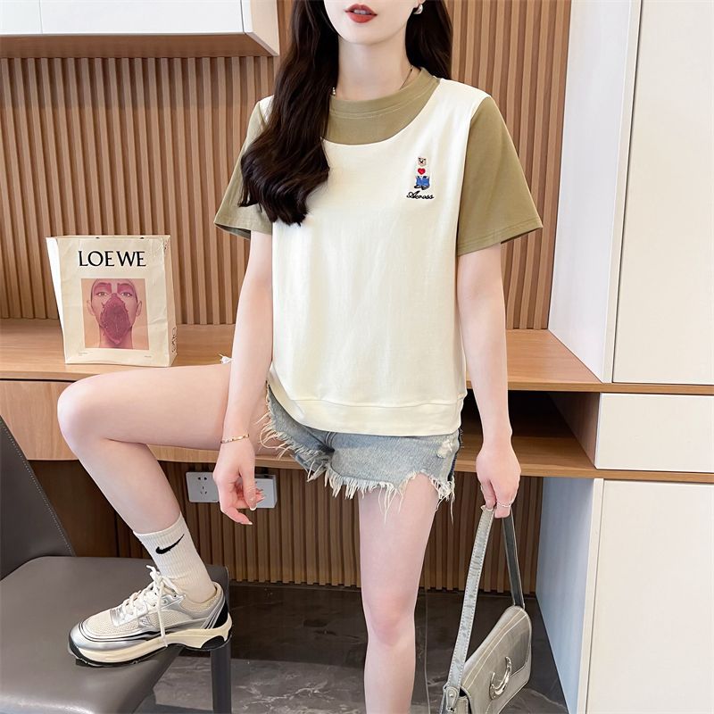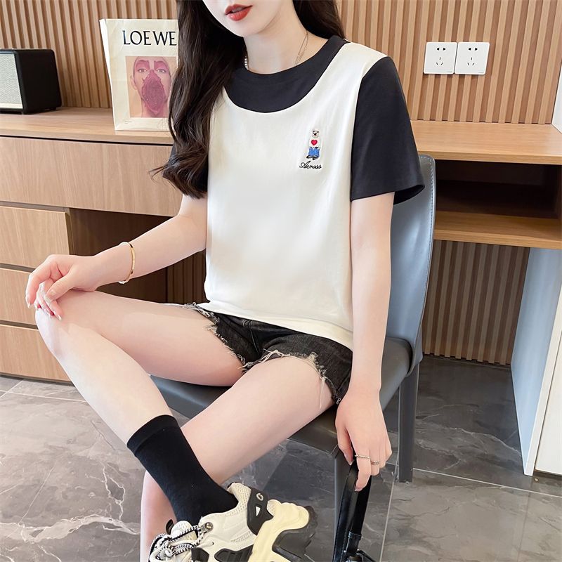 디자인 센스 틈새 반팔 티셔츠 여성 2025 년 새 여름 한국식 느슨한 작은 사람들 컬러 대조 가짜 투피스 탑스토어 가기