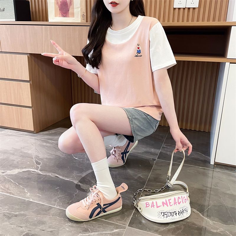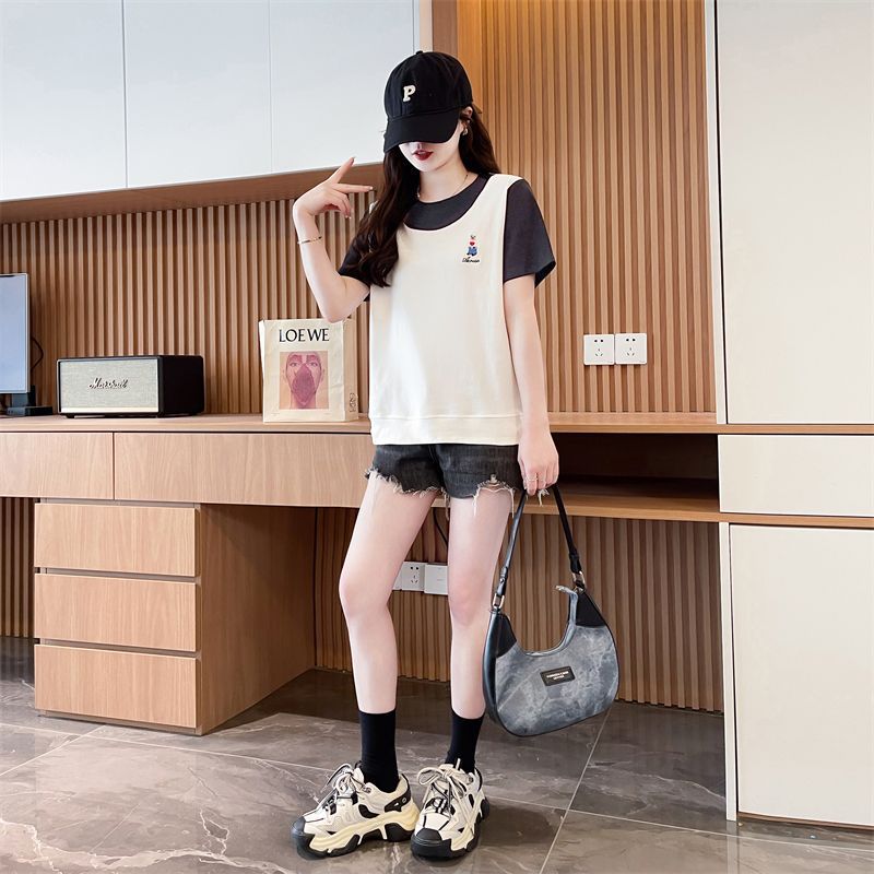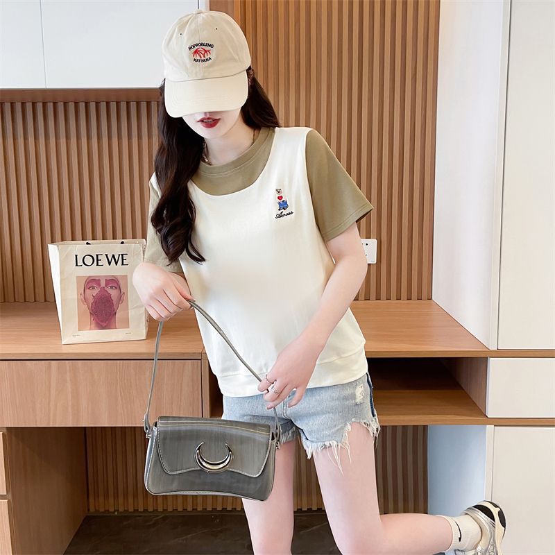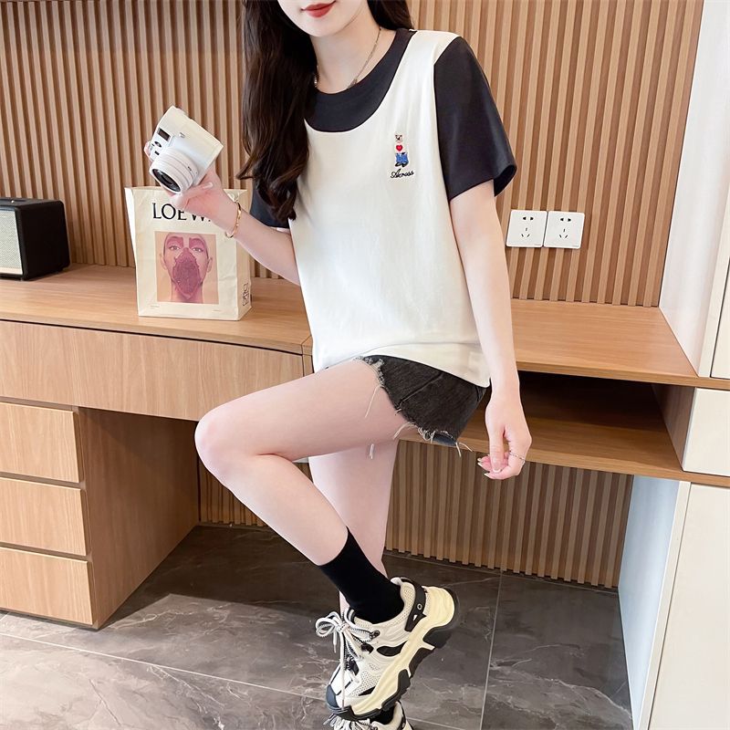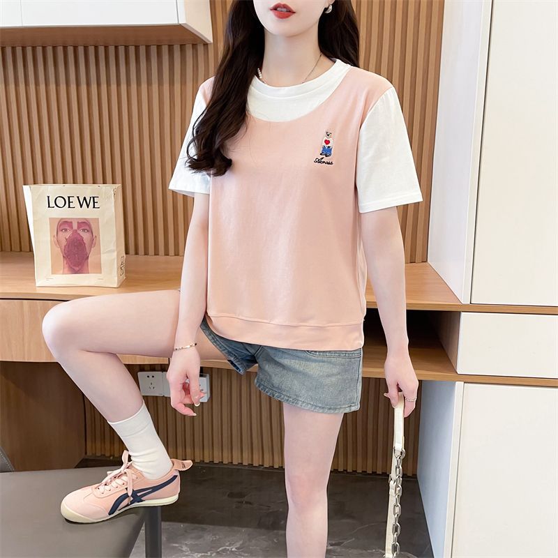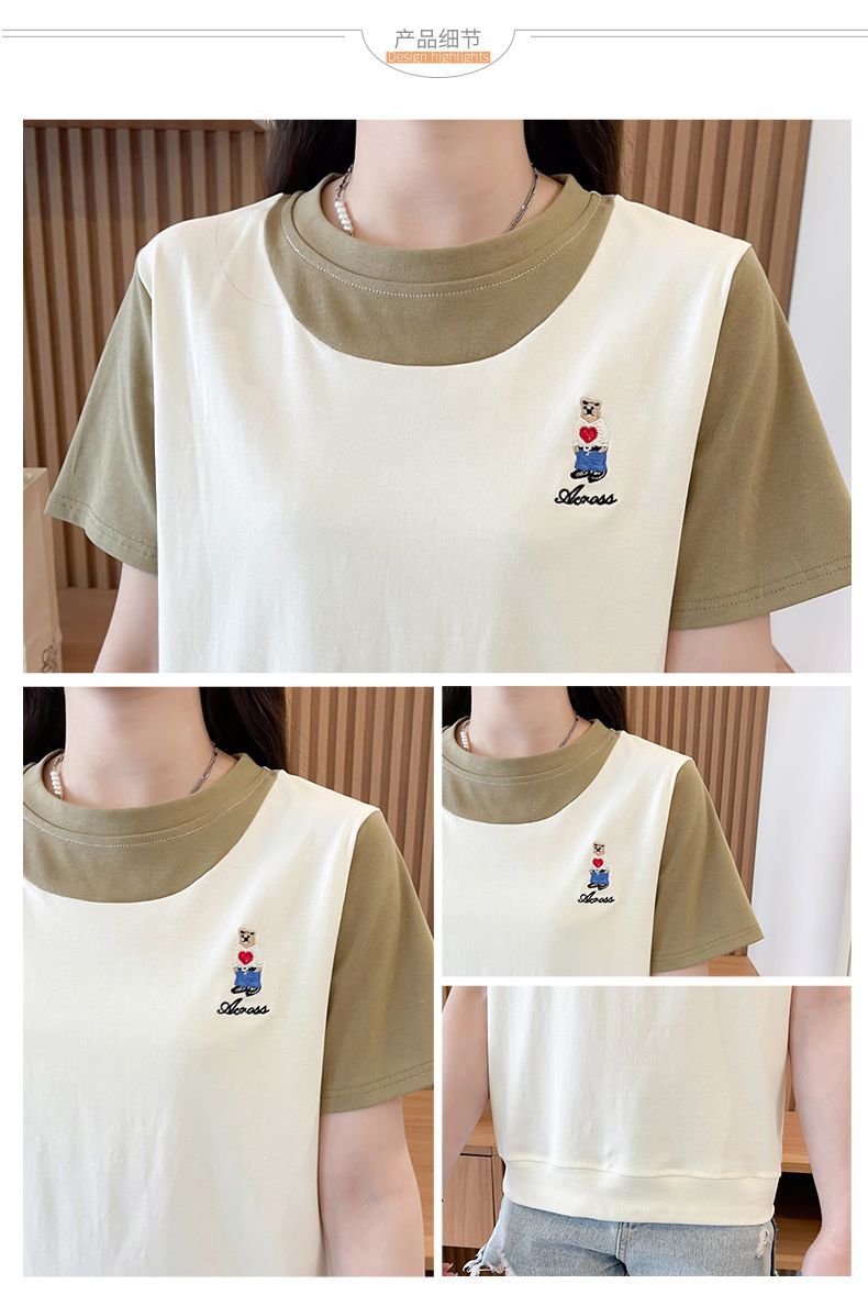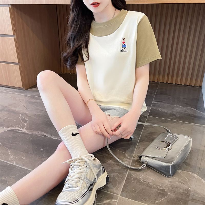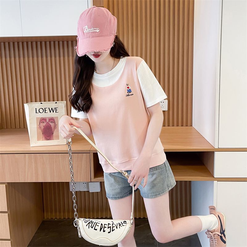 디자인 센스 틈새 반팔 티셔츠 여성 2025 년 새 여름 한국식 느슨한 작은 사람들 컬러 대조 가짜 투피스 탑스토어 가기