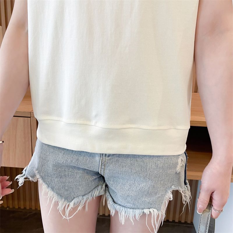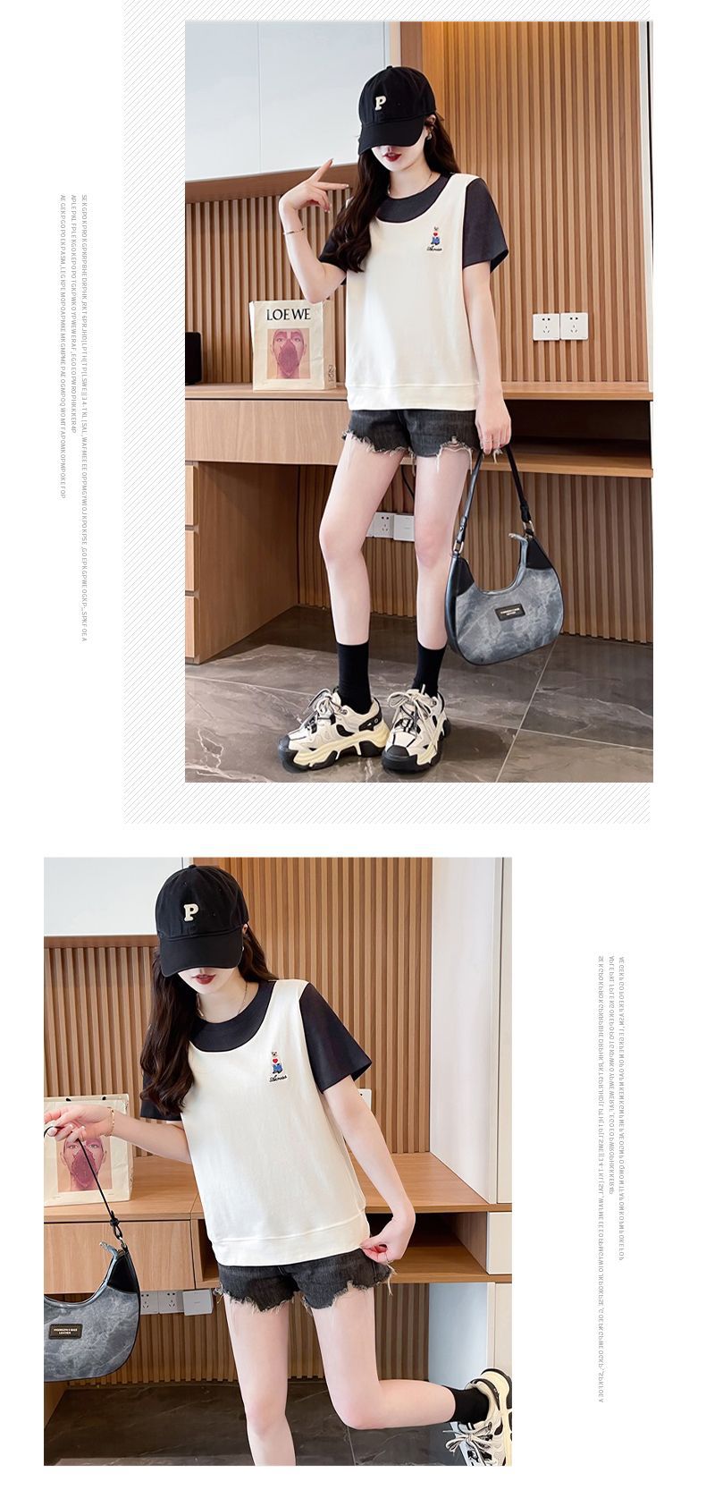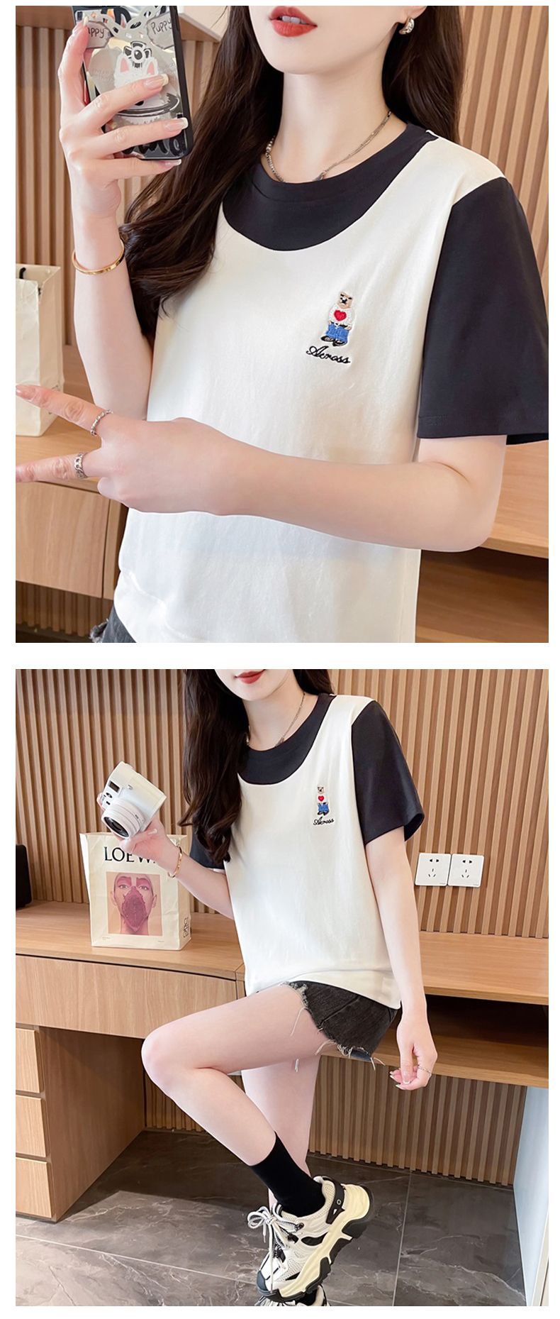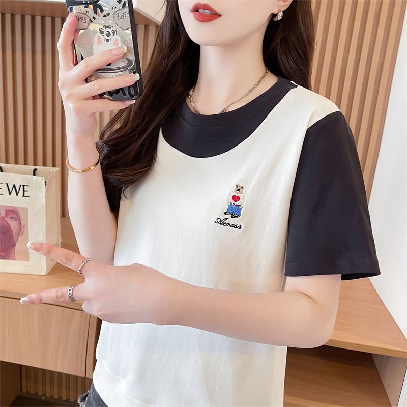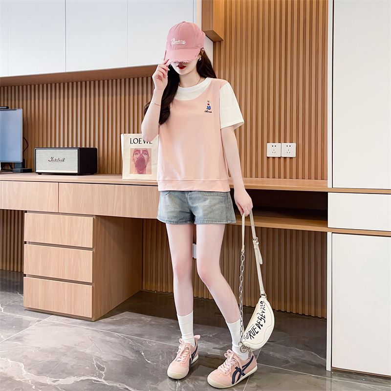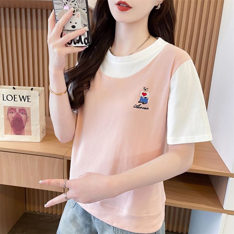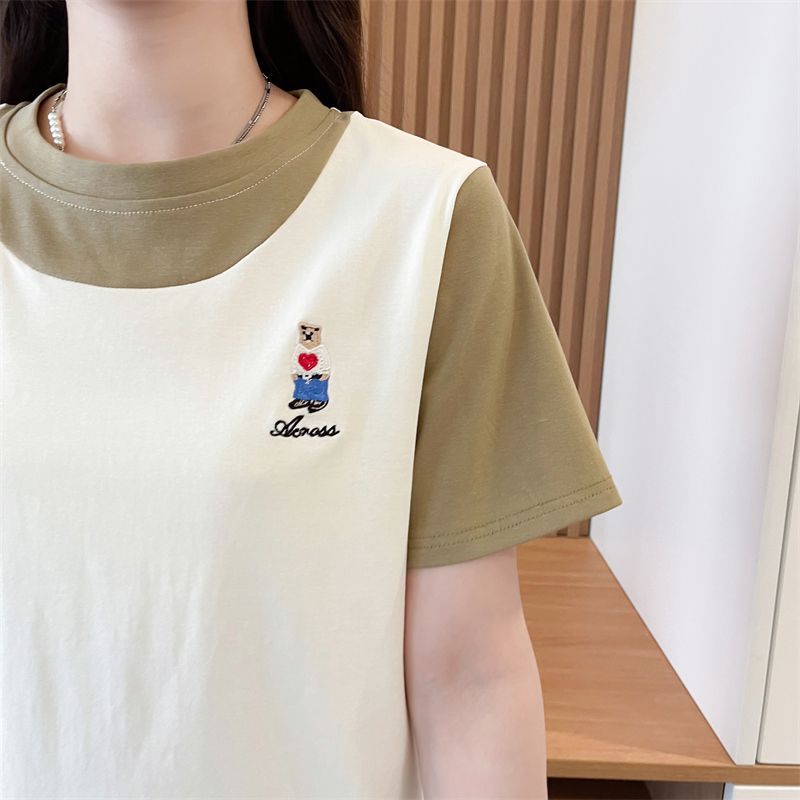 디자인 센스 틈새 반팔 티셔츠 여성 2025 년 새 여름 한국식 느슨한 작은 사람들 컬러 대조 가짜 투피스 탑스토어 가기