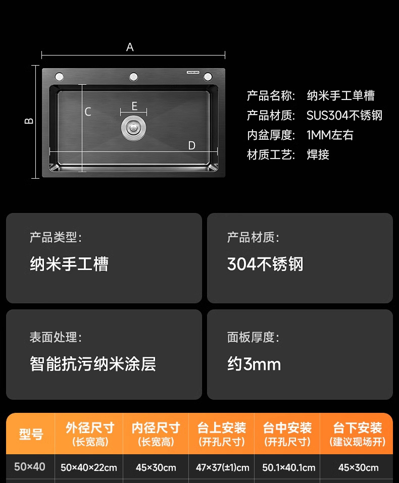 [SF Express] 나노 주방 싱크대 단일 슬롯 두꺼운 304 스테인레스 스틸 식기 세척대 대형 식기 세척대 싱크대