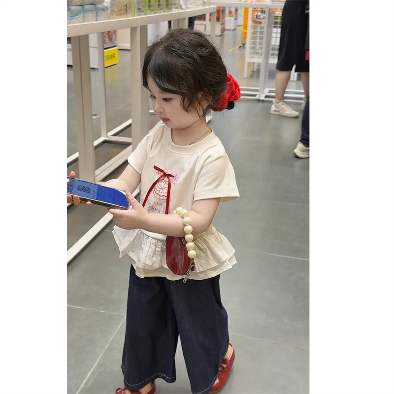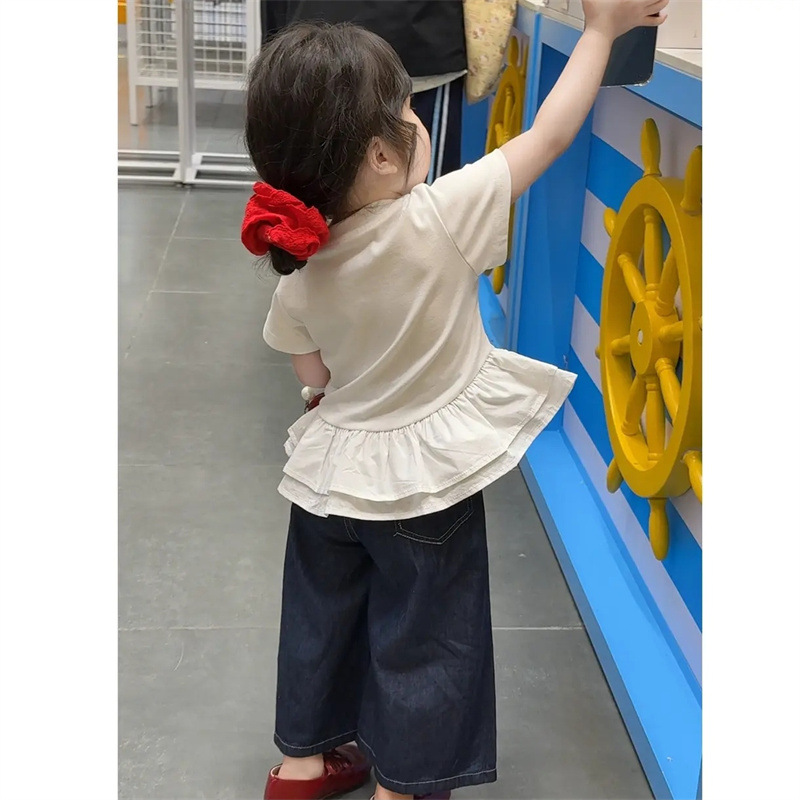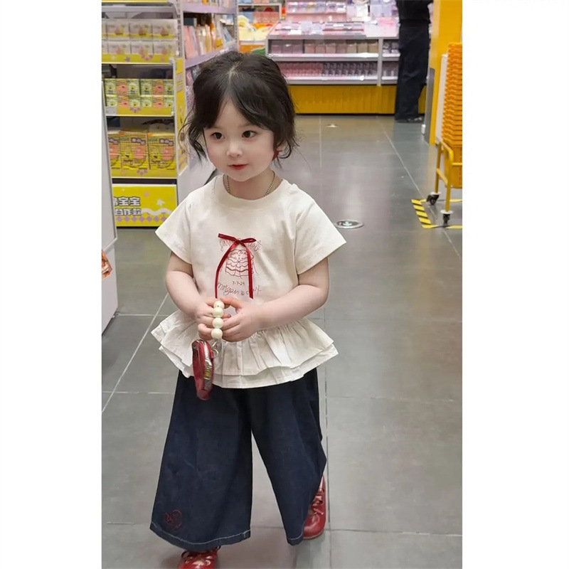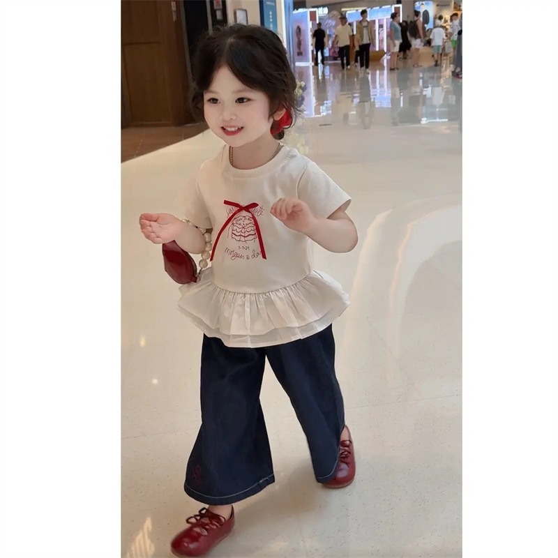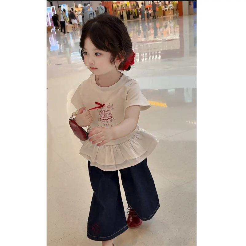 닝리 브랜드 아동복 소녀 여름 티셔츠 새로운 어린 소녀 달콤한 활 더블 레이스 짧은 소매 탑스토어 가기