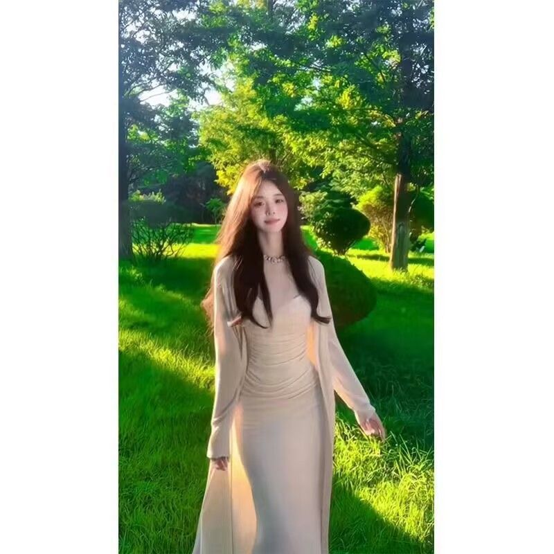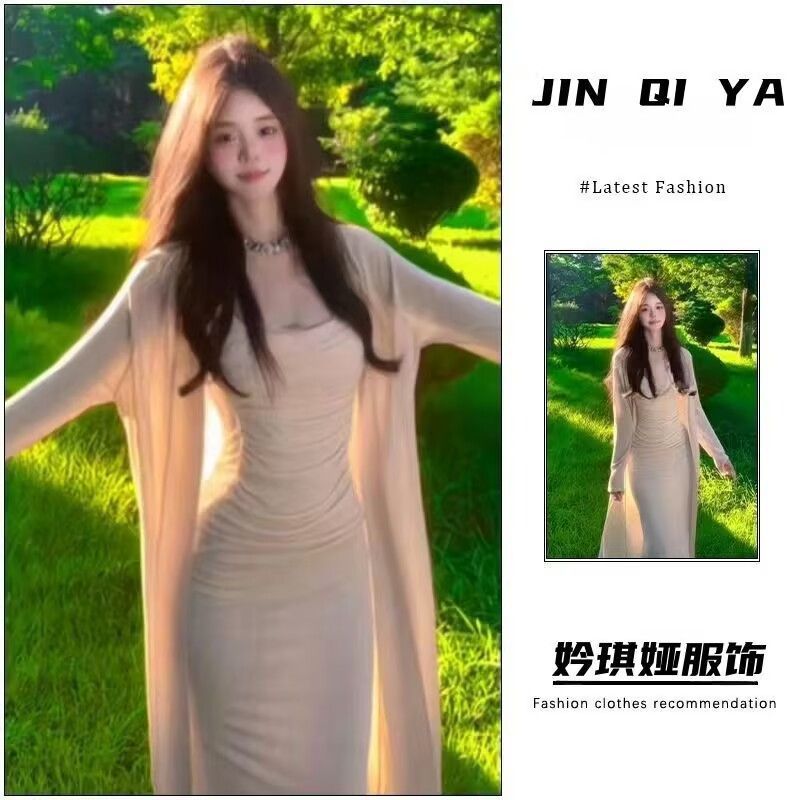 봄 여름 소녀들의 새로운 스타일 섹시하고 성숙한 스타일 슬림핏 서스펜더 힙 롱 스커트 + 롱 니트 스웨터 슈트스토어 가기