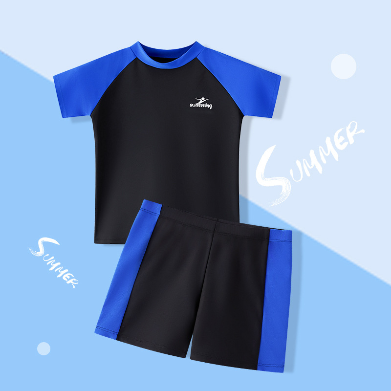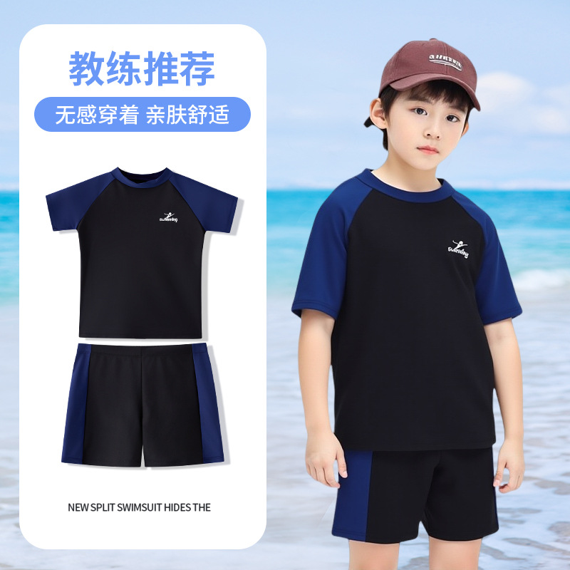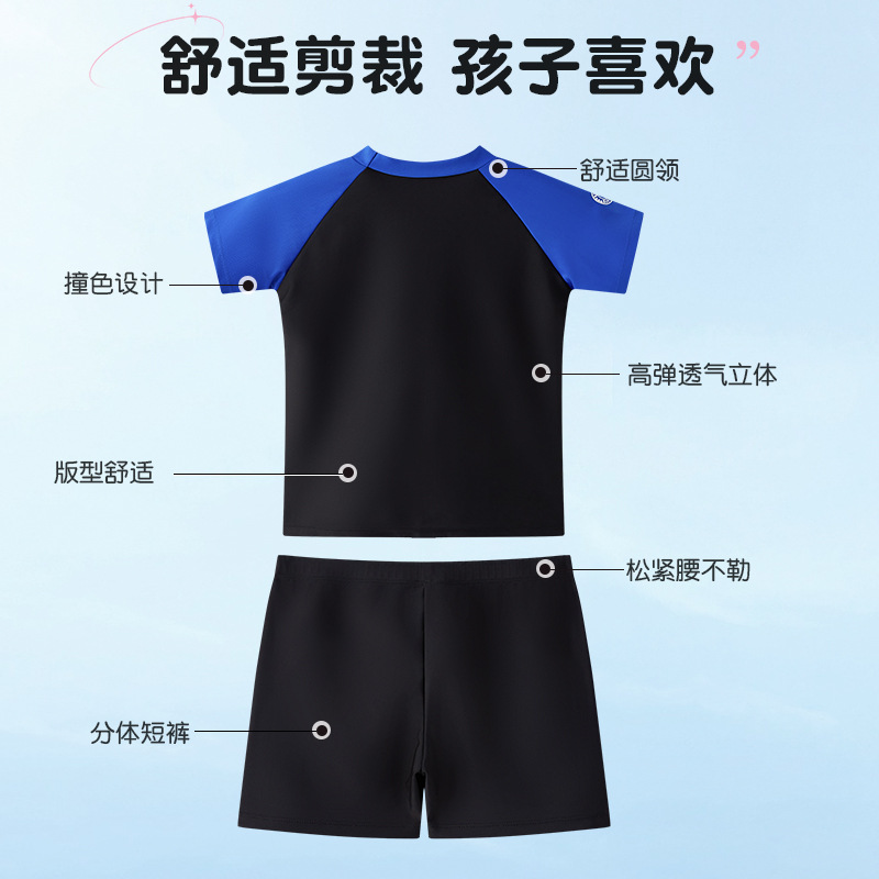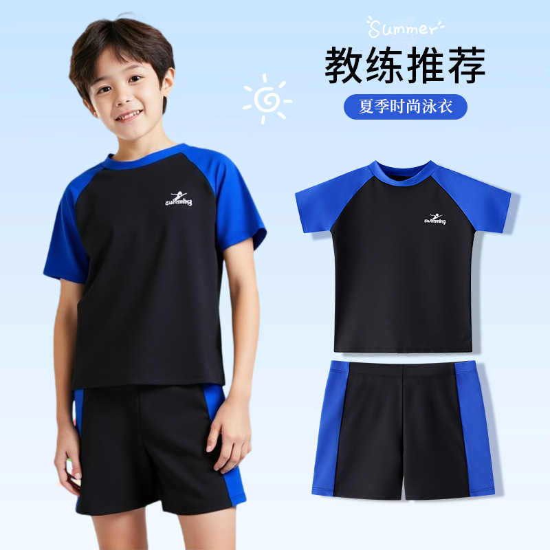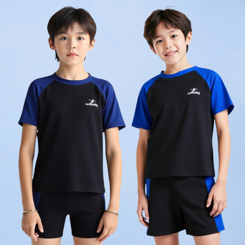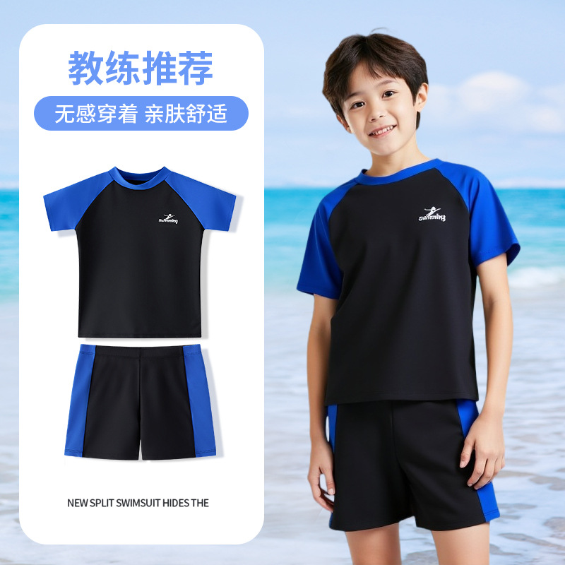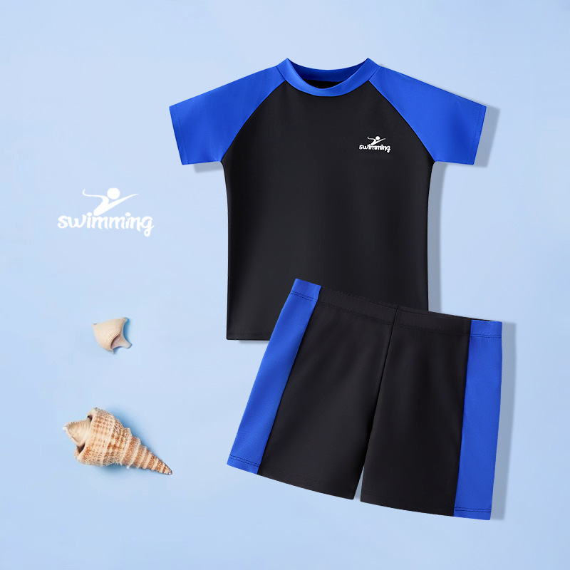 2025 아동 수영복 소년 중대형 아동 스플릿 수영복 세트 베이비 블루 스플라이스 라글란 슬리브 수영복스토어 가기