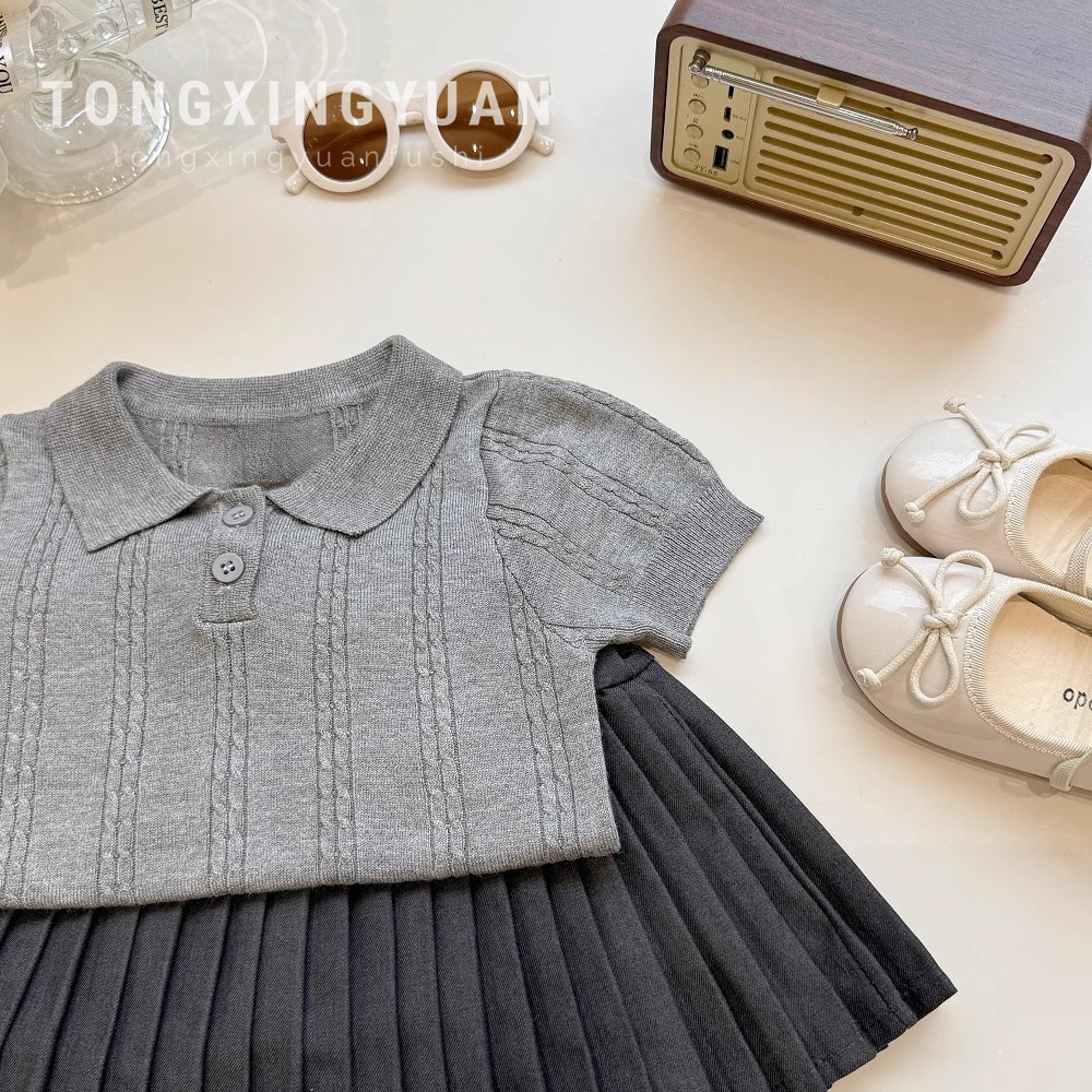 [아카데미스타일] 소녀아동복 2025 새 여름 여성 보물 니트 반팔 폴로 셔츠 어린이 주름 치마 세트