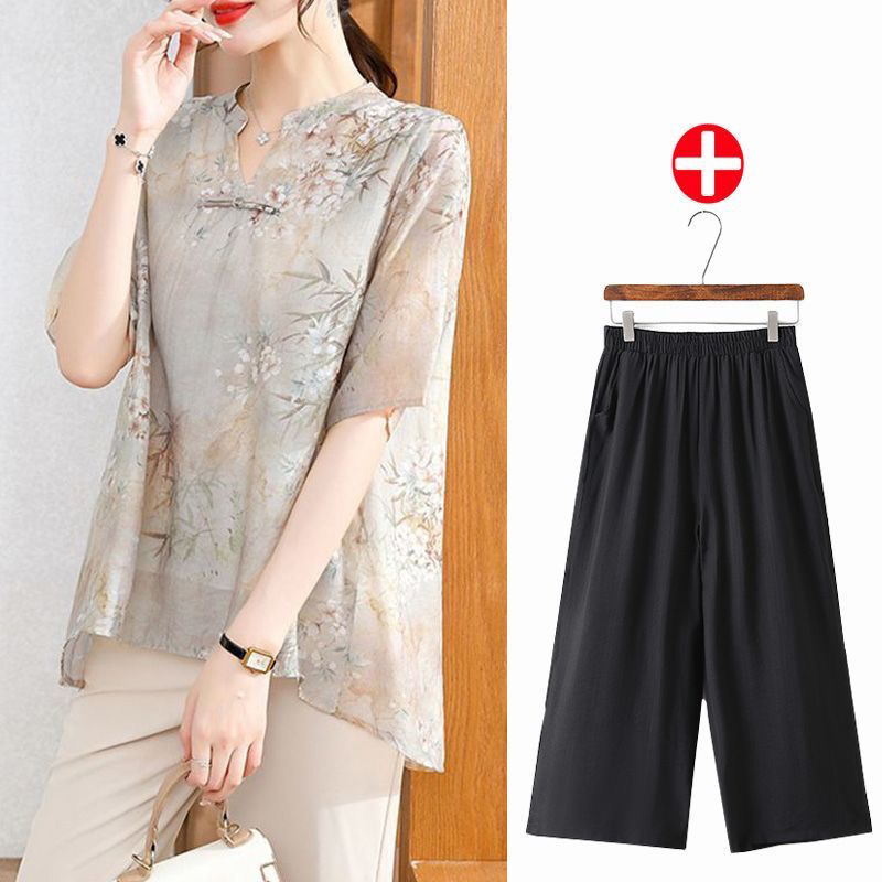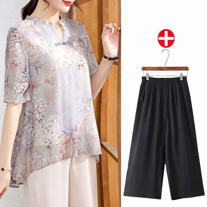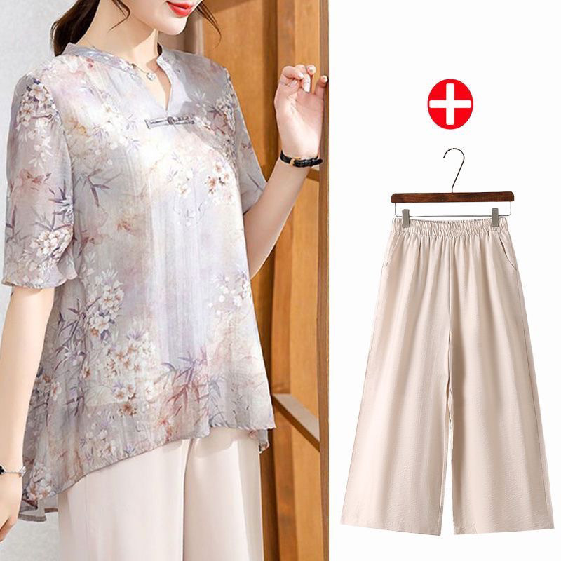 어머니의 날 어머니의 2024 여름 새로운 반팔 쉬폰 셔츠 패션 세트 중년 및 노인 여성 셔츠 탑 옷