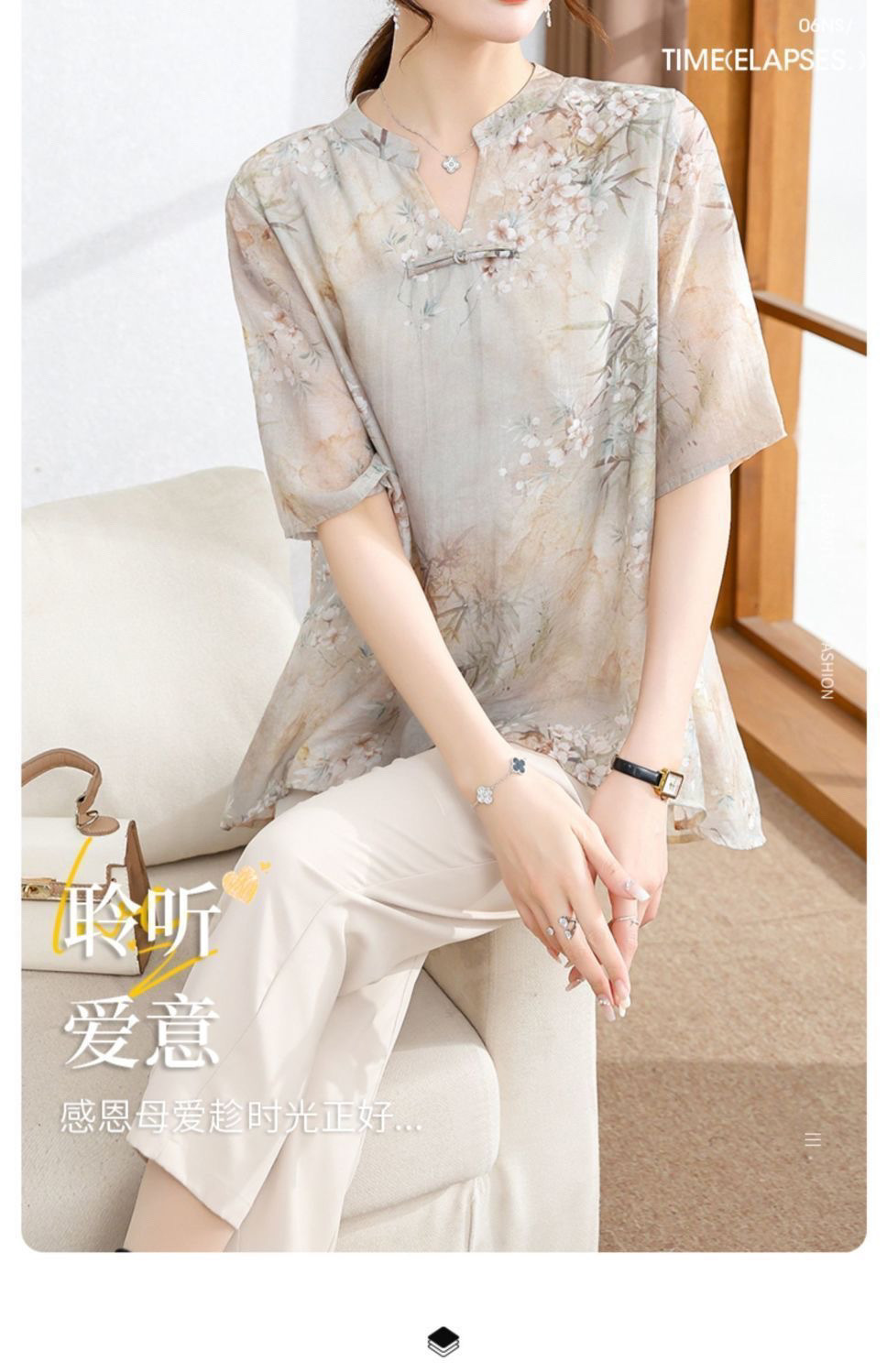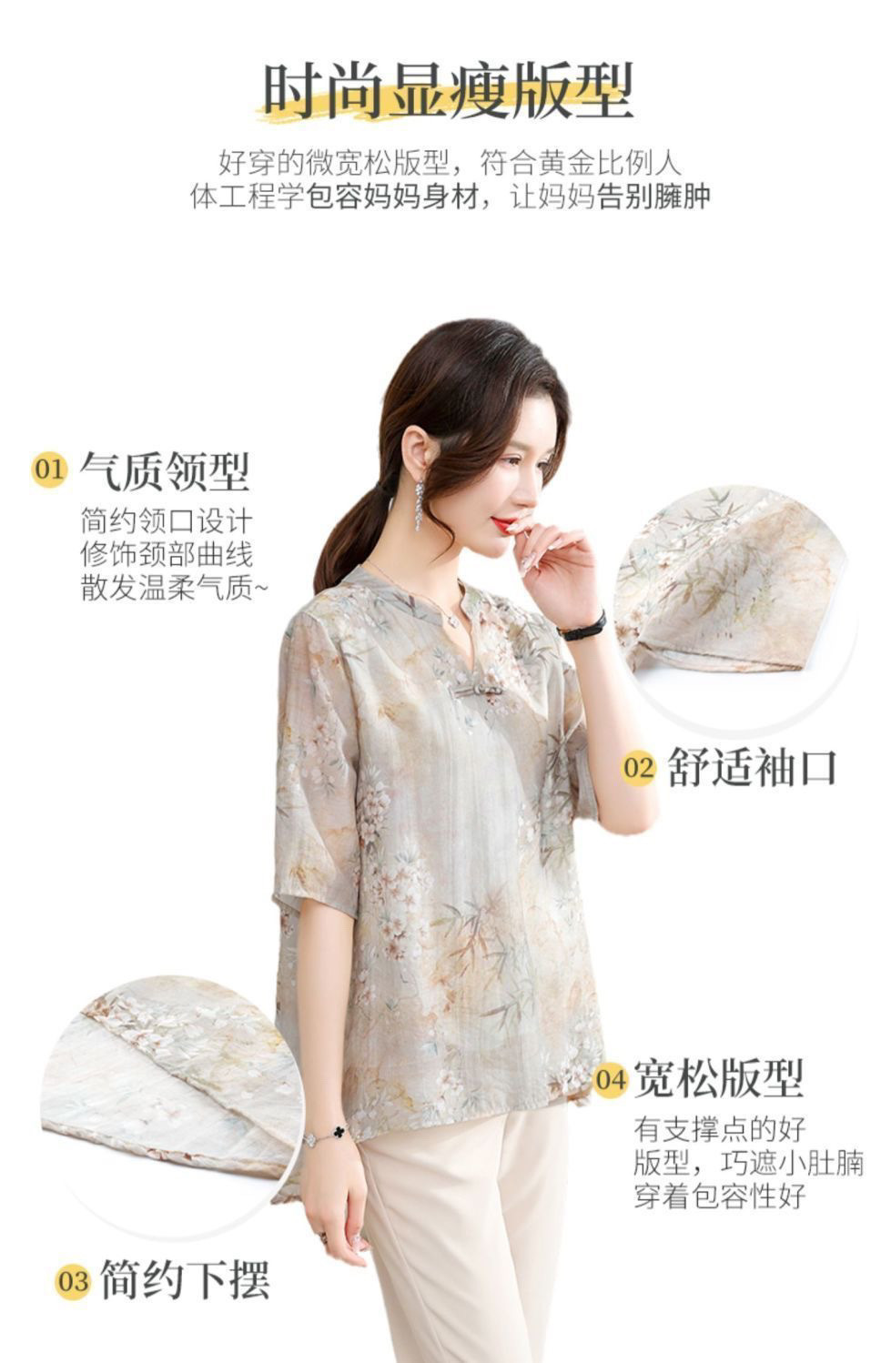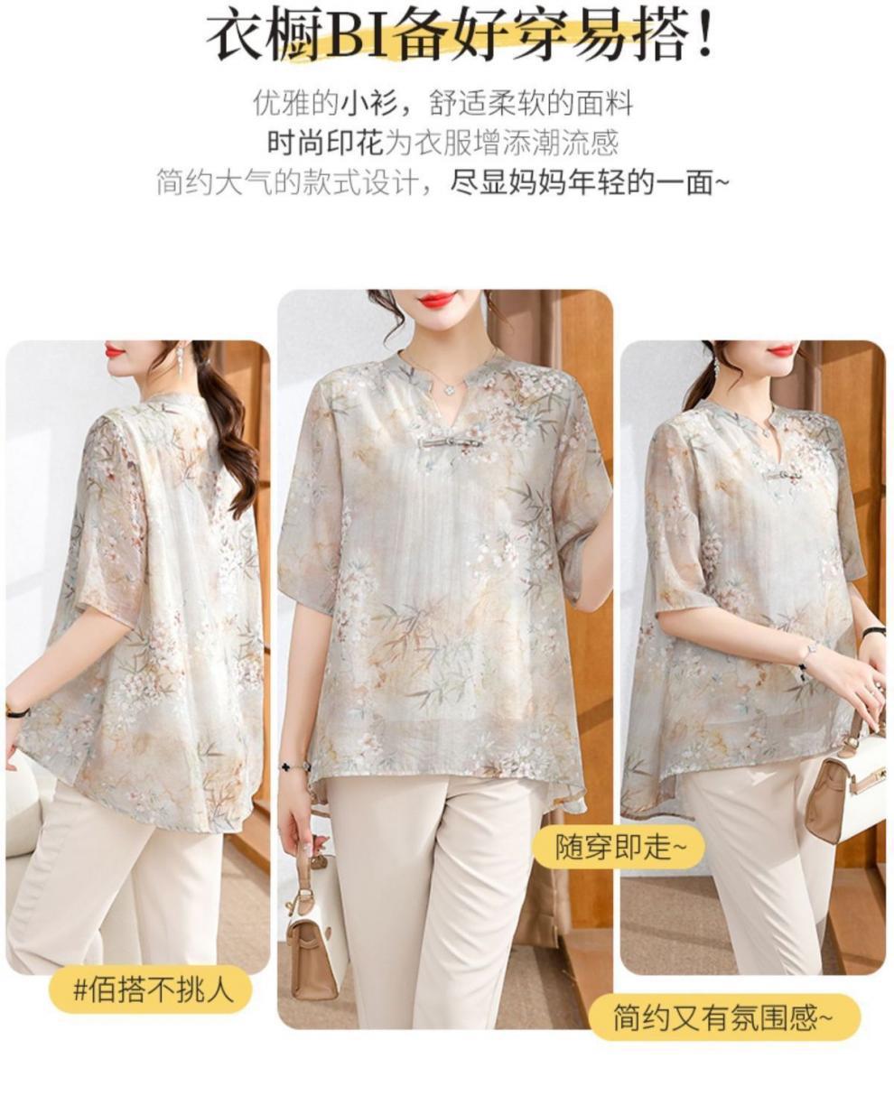 어머니의 날 어머니의 2024 여름 새로운 반팔 쉬폰 셔츠 패션 세트 중년 및 노인 여성 셔츠 탑 옷스토어 가기