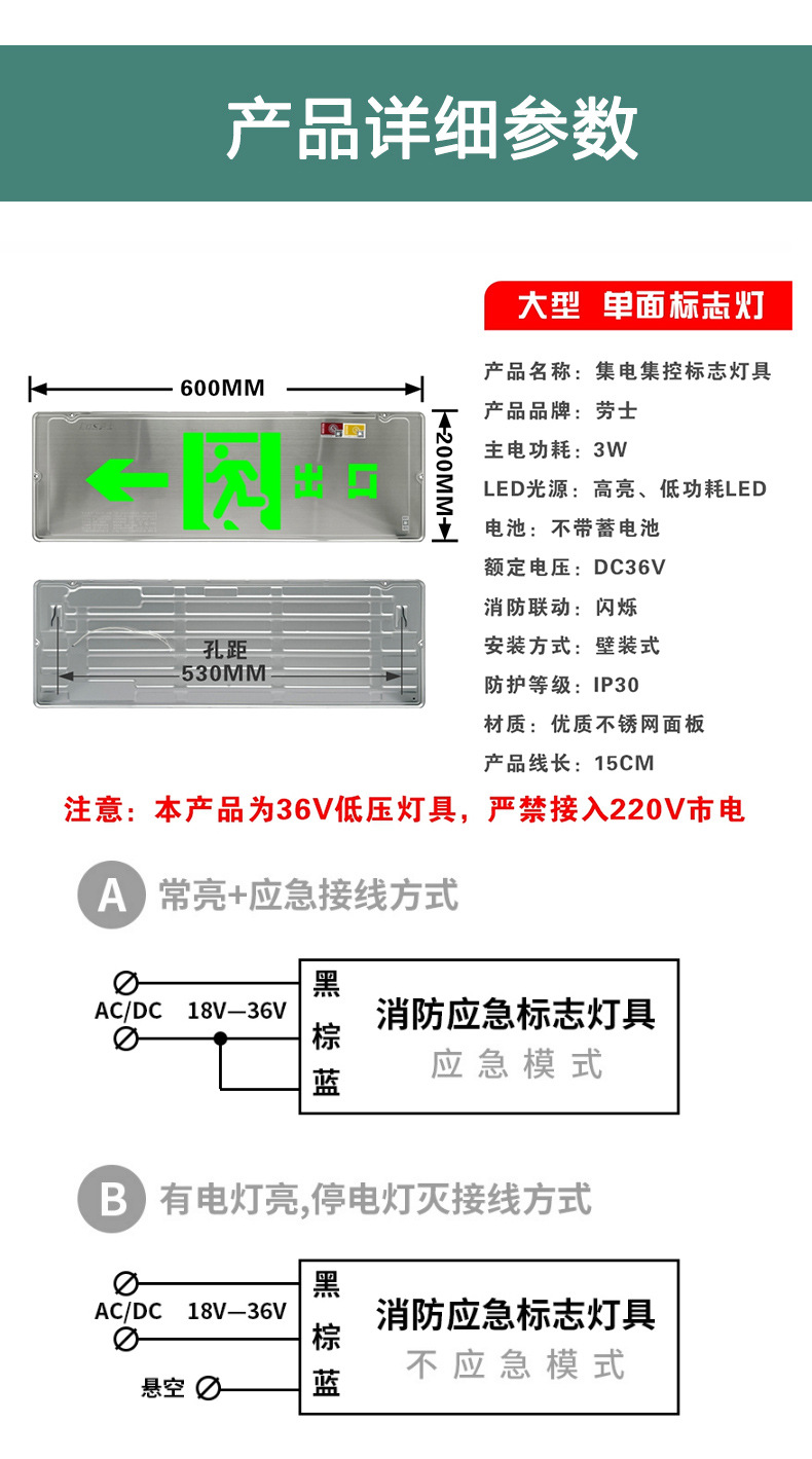 Rosenberg 안전 출구 표시 등 유형 A 중앙 제어 DC36V 공장 복도 화재 비상 대피 표시 등