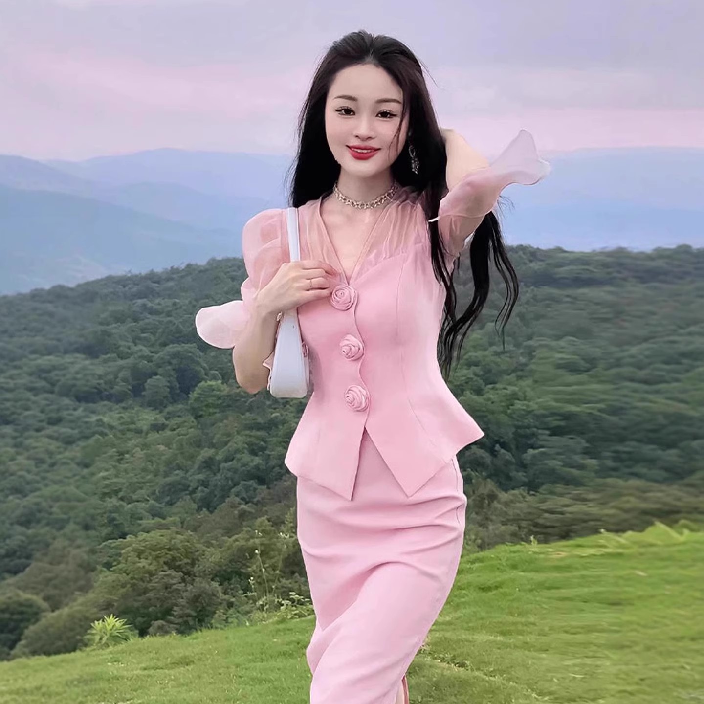2025 봄 신입 허리 탑 스커트 기질 연령 감소 통근 핑크 세트 스커트 여성 세트