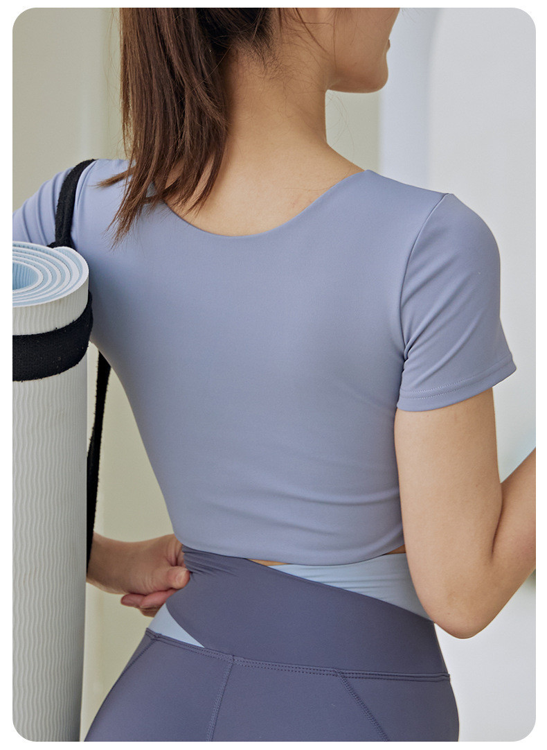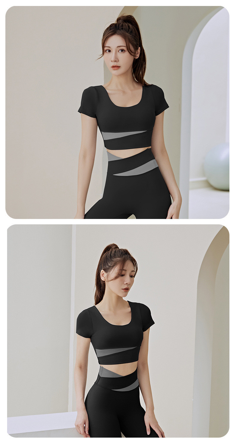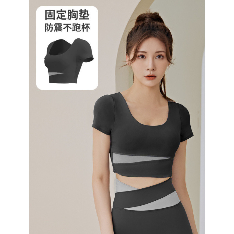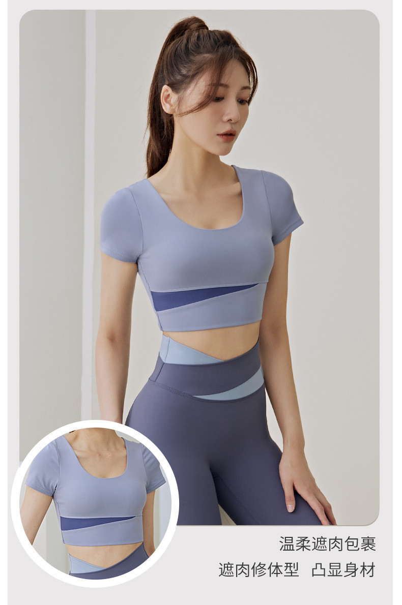 여성을위한 컬러 블록 짧은 요가 착용 스포츠 꽉 가슴 패드 러닝 피트니스 반팔 요가 탑스토어 가기