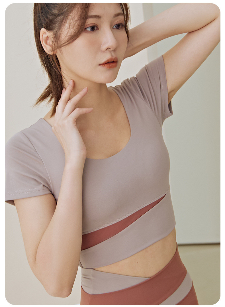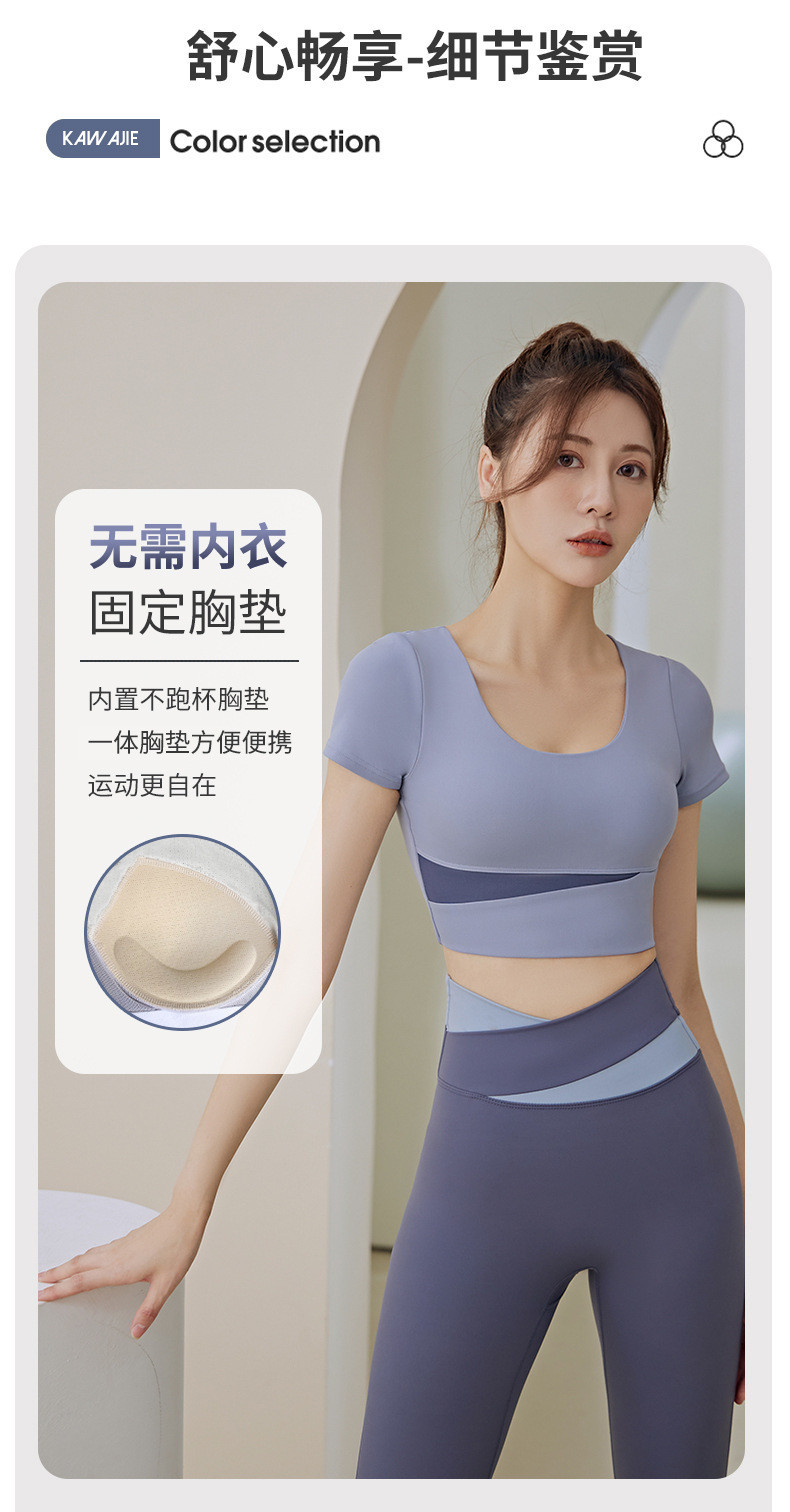 여성을위한 컬러 블록 짧은 요가 착용 스포츠 꽉 가슴 패드 러닝 피트니스 반팔 요가 탑
