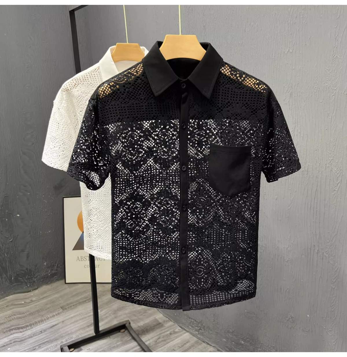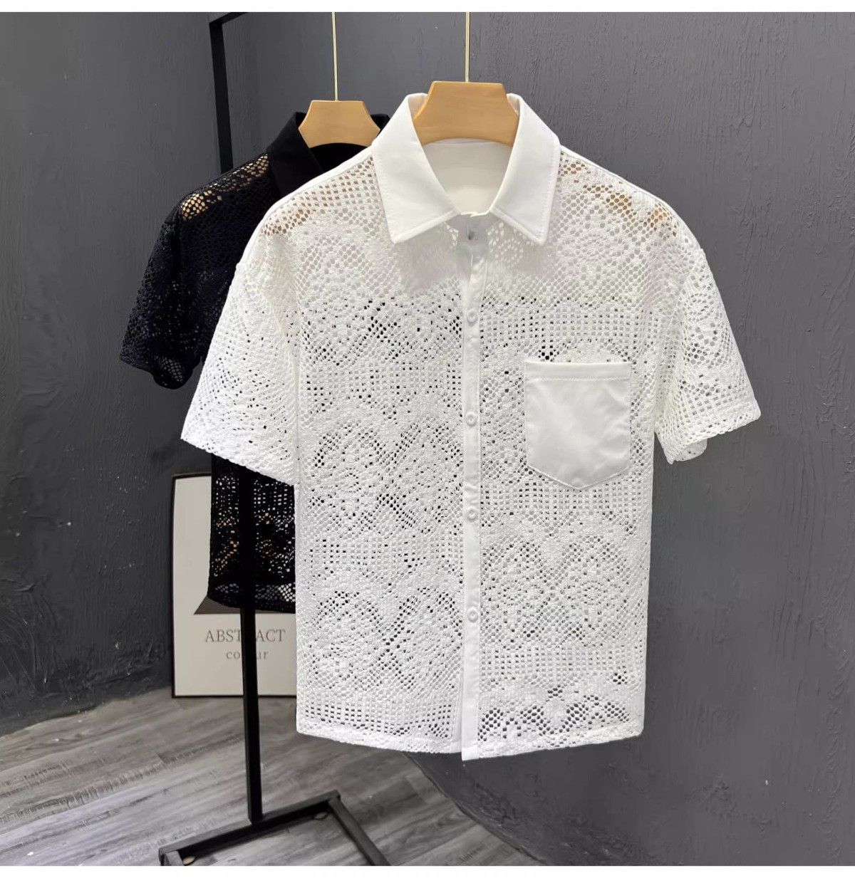 새로운 할로우 디자인 캐주얼 반팔 셔츠 남자 하이 엔드 트렌디 브랜드 뽑은 잘 생긴 셔츠 올매치 느슨한 여름 탑스토어 가기