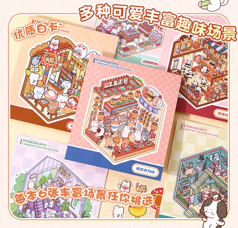 마이크로 스케일 장면 수집이 3d 3 차원 오두막 풍경 스티커 이 핸드북 장식 재료 스티커 책 어린이 장난감스토어 가기