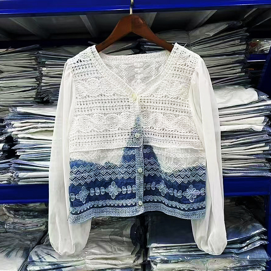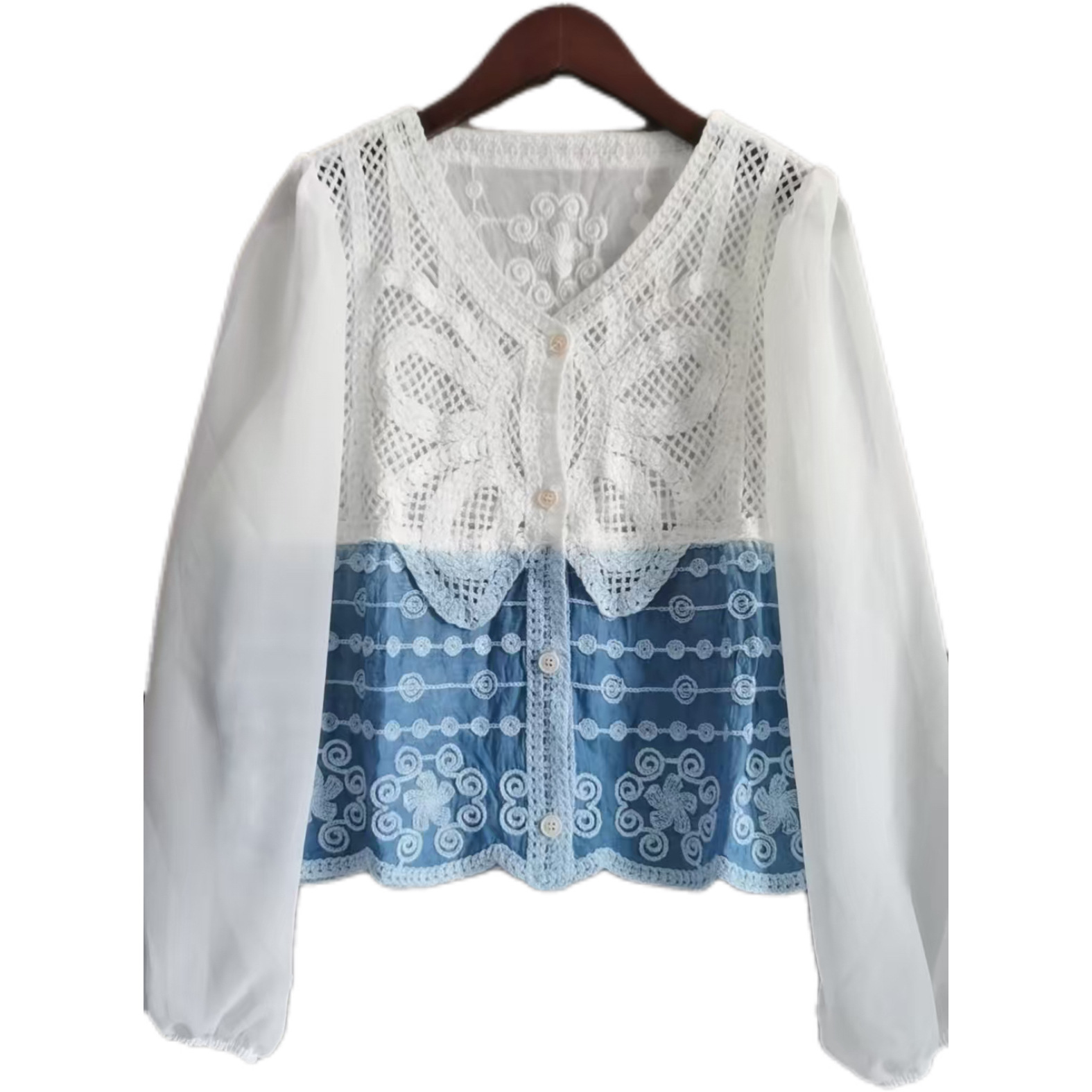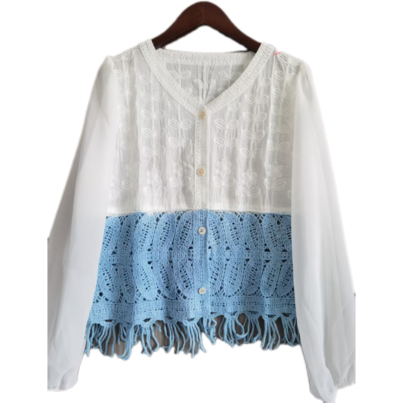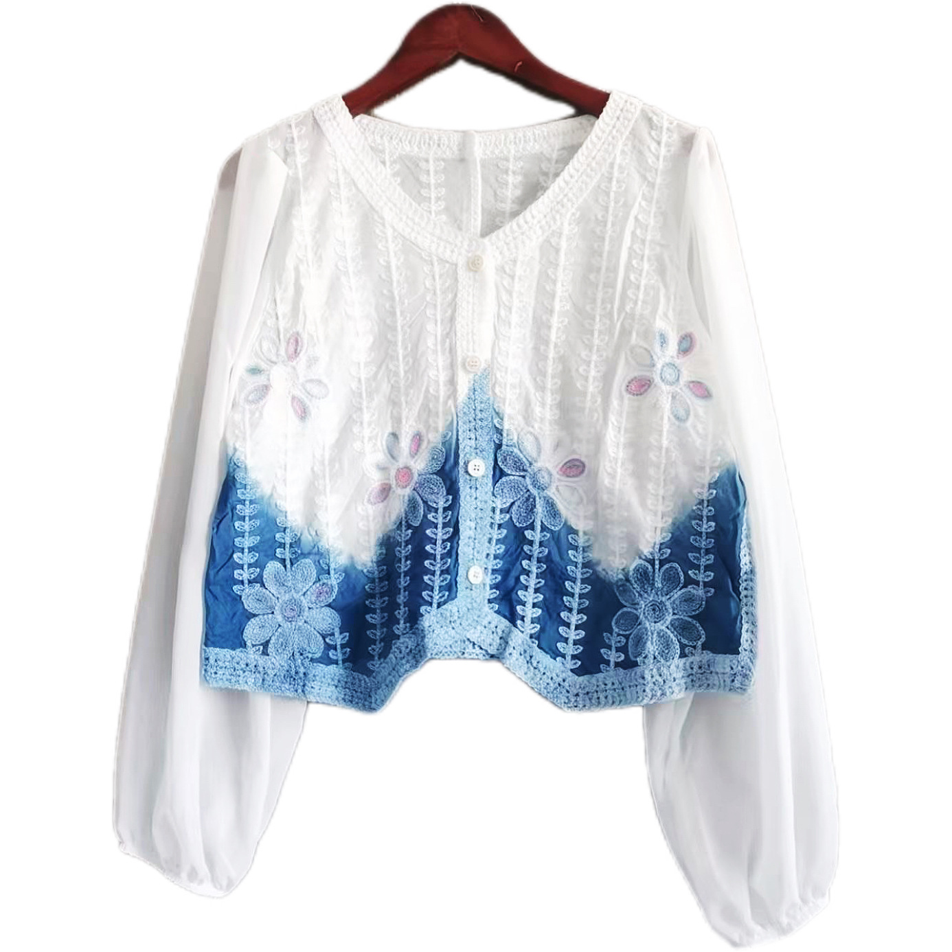 다리 염색 레이스 민족풍 숏 쉬폰 셔츠 여성용 여름 여행 캐주얼 브이넥 긴팔 다용도 자켓스토어 가기