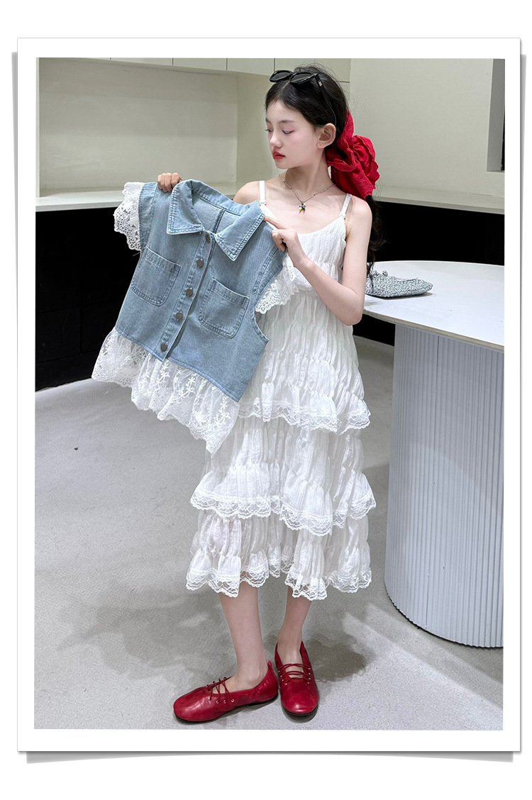 여자 드레스 2025 새로운 여름 어린이 스타일 스커트 여자 데님 조끼 탑 케이크 스커트 여름 드레스