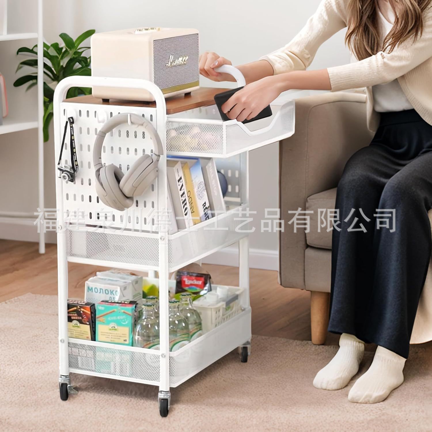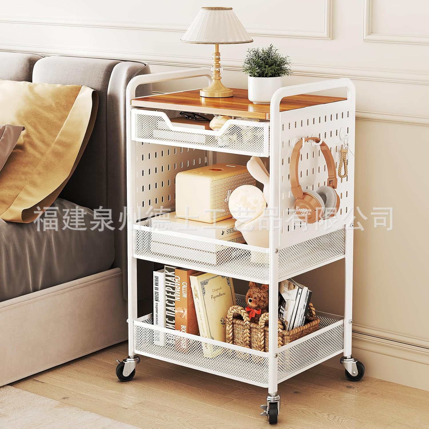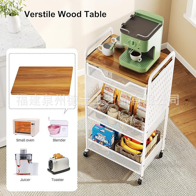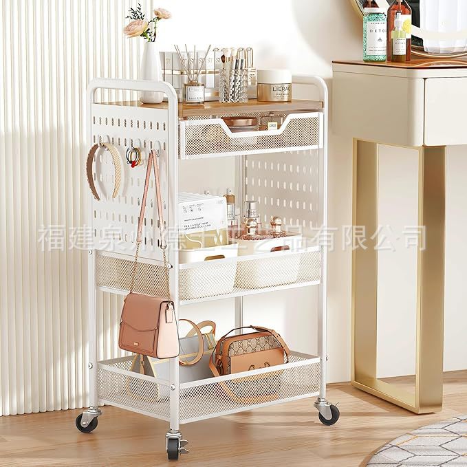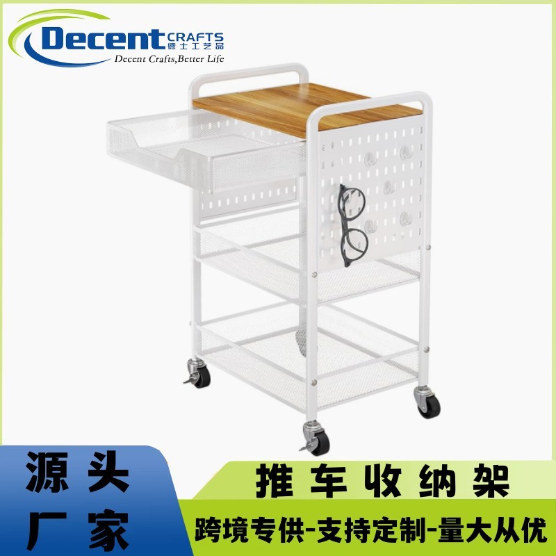 목재 서랍이 있는 바퀴 달린 트롤리가 있는 국경 간 맞춤형 3층 다기능 보관 실내 보관 랙스토어 가기