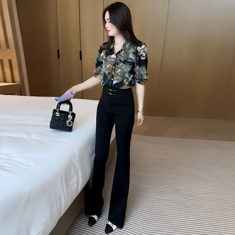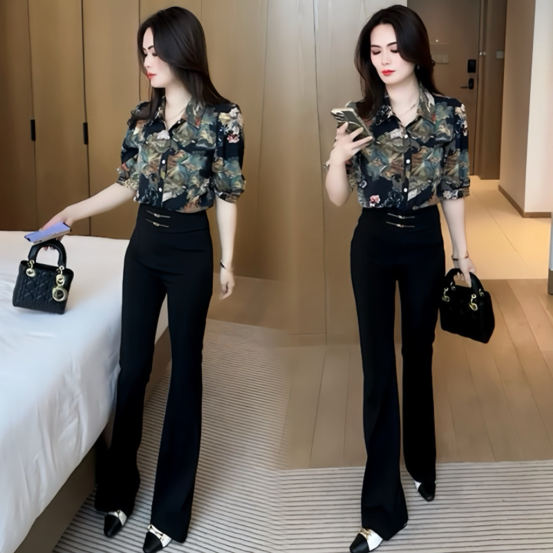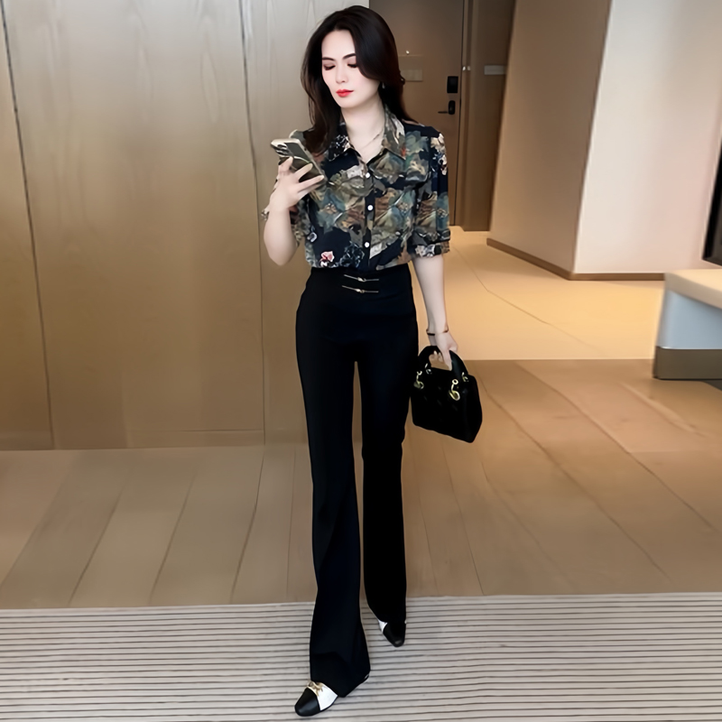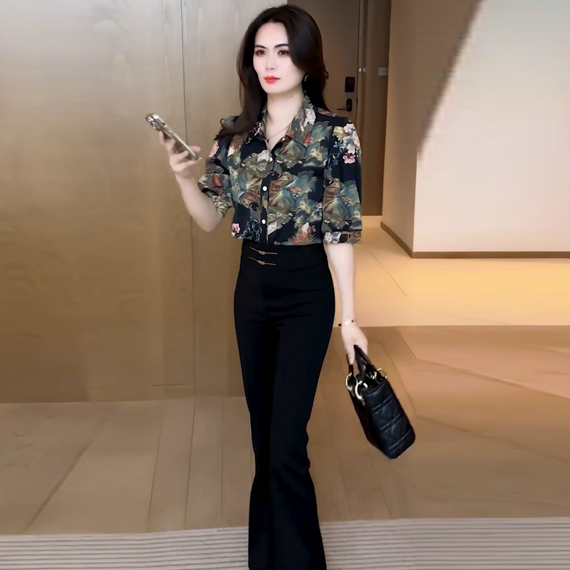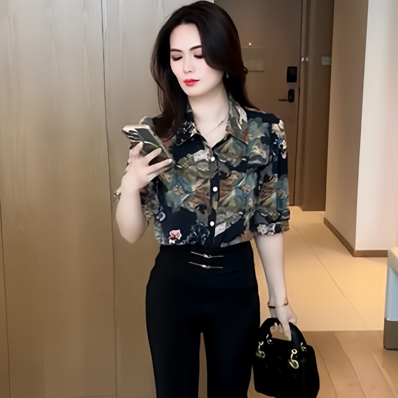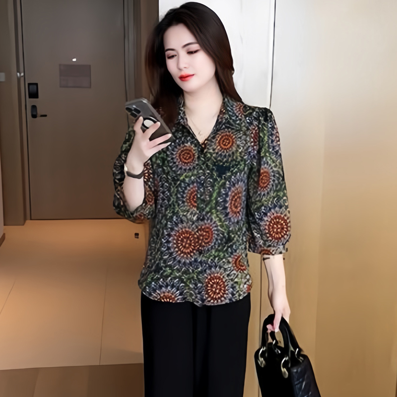 패션 우아한 일곱 소매 셔츠 여성의 2025 여름 새로운 꽃 셔츠 전문 느슨한 슬리밍 탑 옷