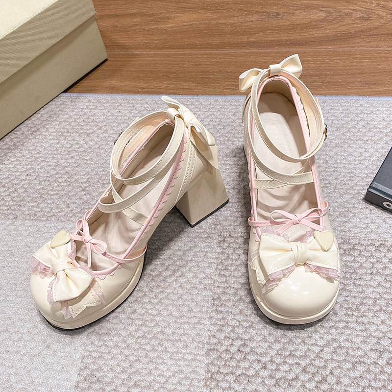 리본이 달린 작은 가죽 신발, 귀여운 메리 제인 신발, 2025 새로운 스타일의 로리 여성의 달콤한 레이스 엣지 두꺼운 굽 버클 가죽 신발스토어 가기