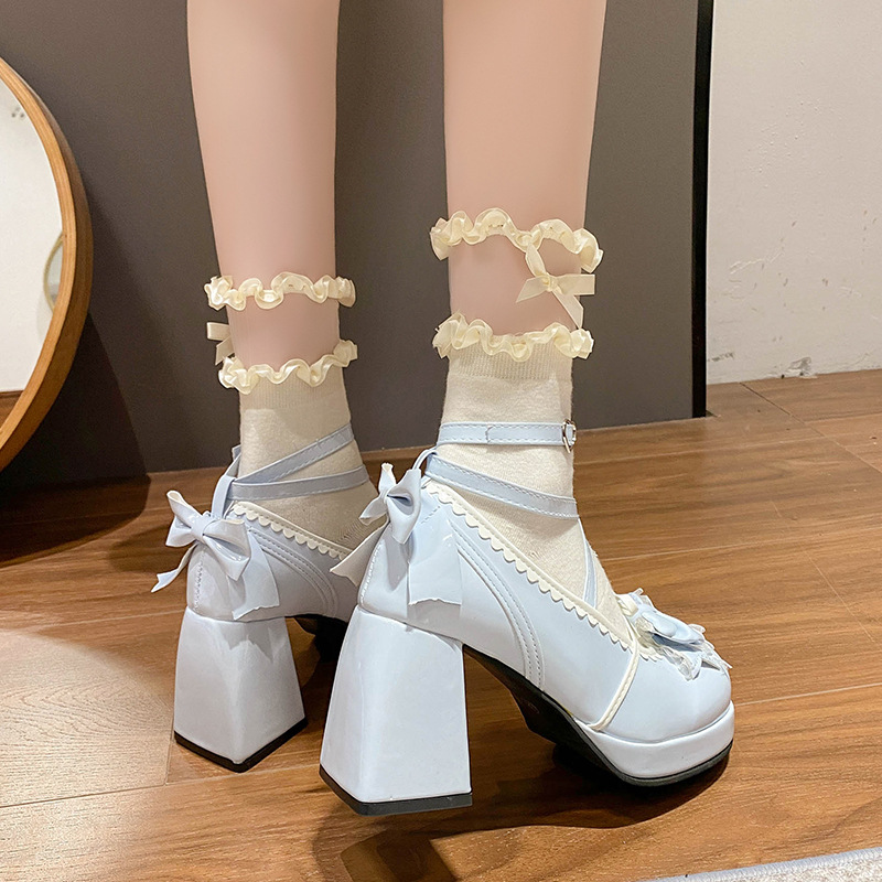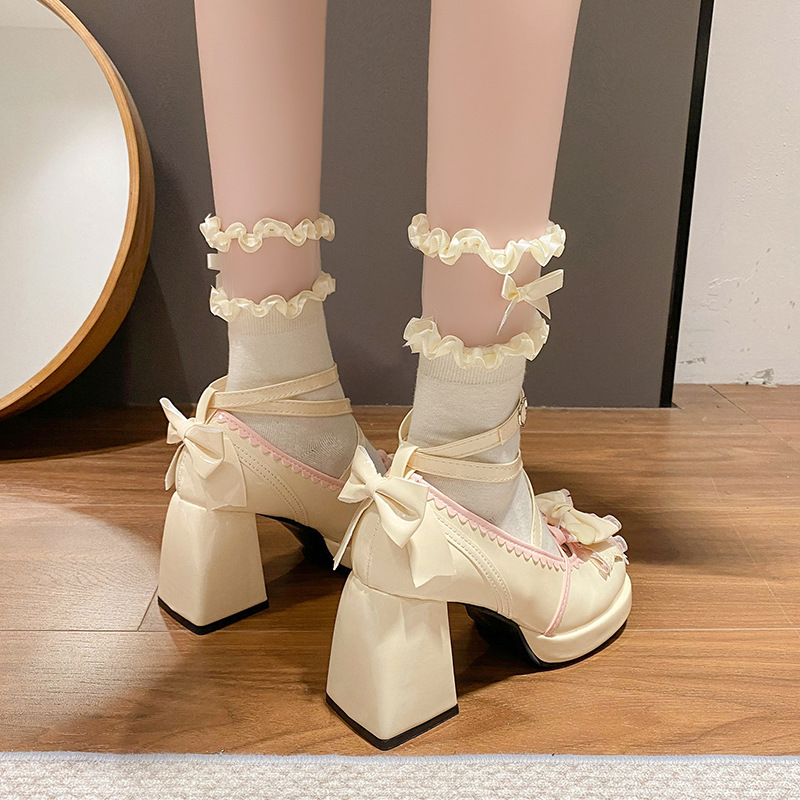 리본이 달린 작은 가죽 신발, 귀여운 메리 제인 신발, 2025 새로운 스타일의 로리 여성의 달콤한 레이스 엣지 두꺼운 굽 버클 가죽 신발