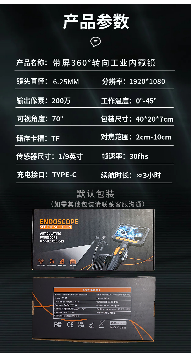 • 스크린 2M을 갖춘 산업용 조향 내시경(메모리 카드 제외)