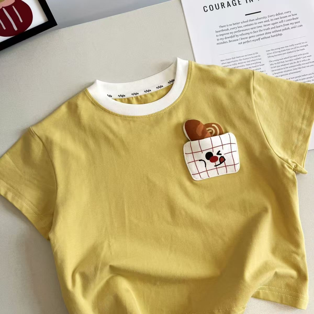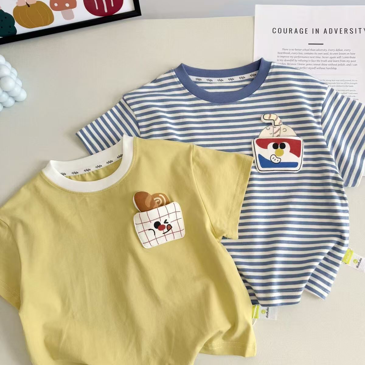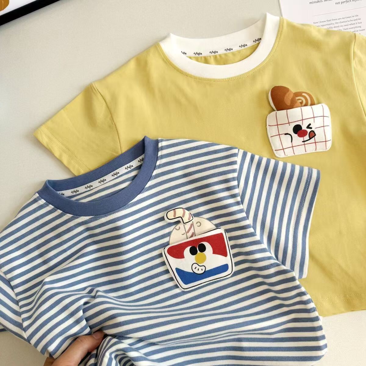 여름 2025 새로운 만화 외국 스타일 귀여운 입체 줄무늬 남성과 여성의 어린이 아기 반팔 티셔츠 탑스토어 가기