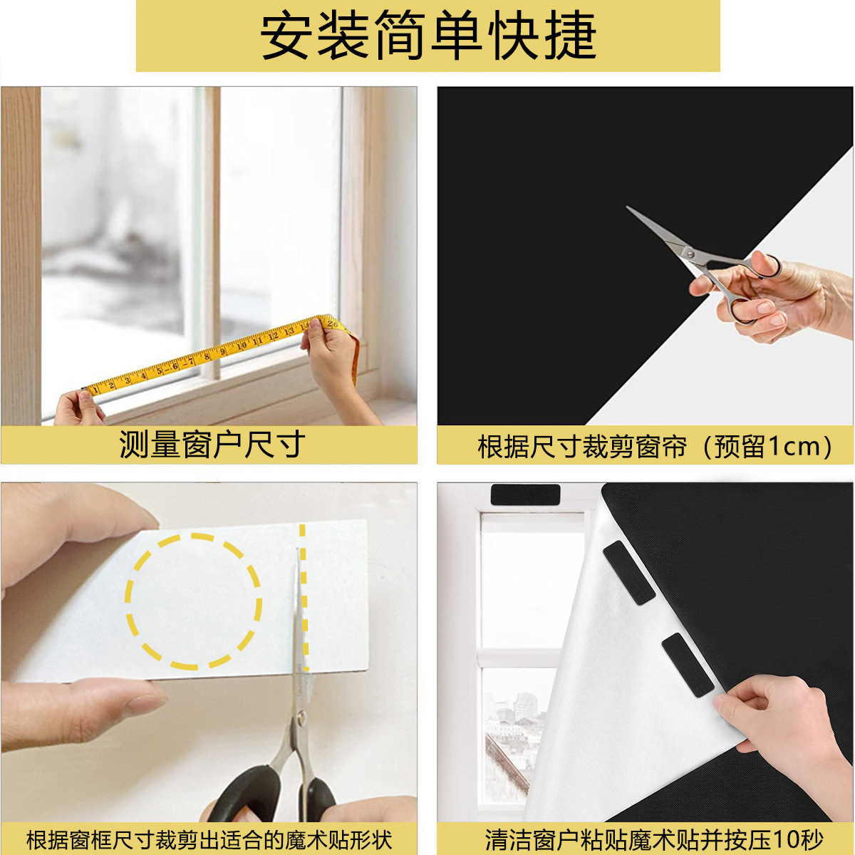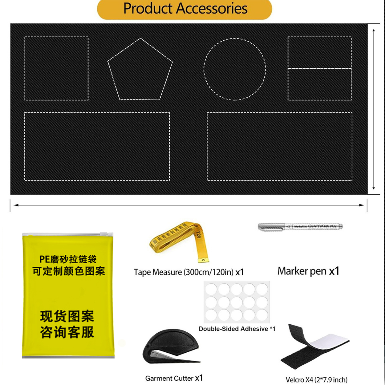 • 한 세트(노란색 가방 + 접착제 15개 * 1개 + 미터 자 3개 * 1개 + 벨크로 5개 * 20개 * 4쌍 + 커터 * 1 + 펜 * 1 + 차광 천