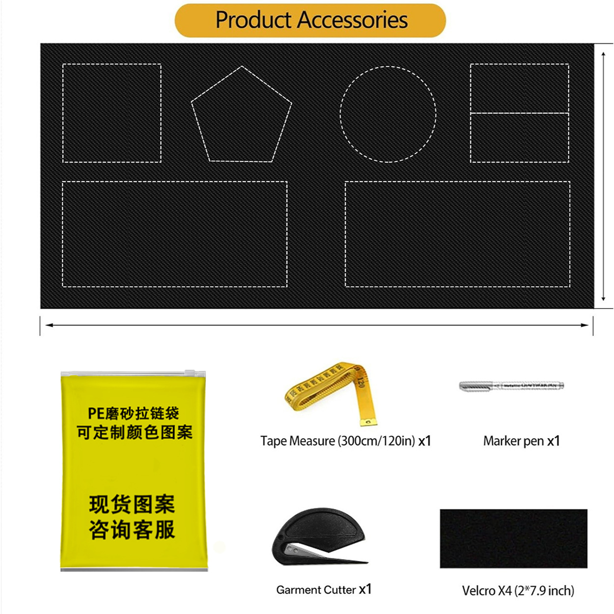 • 한 세트 (노란색 가방 + 3미터 자 * 1 + 5 * 20 벨크로 * 4 쌍 + 커터 * 1 + 펜 * 1 + 차광 천)