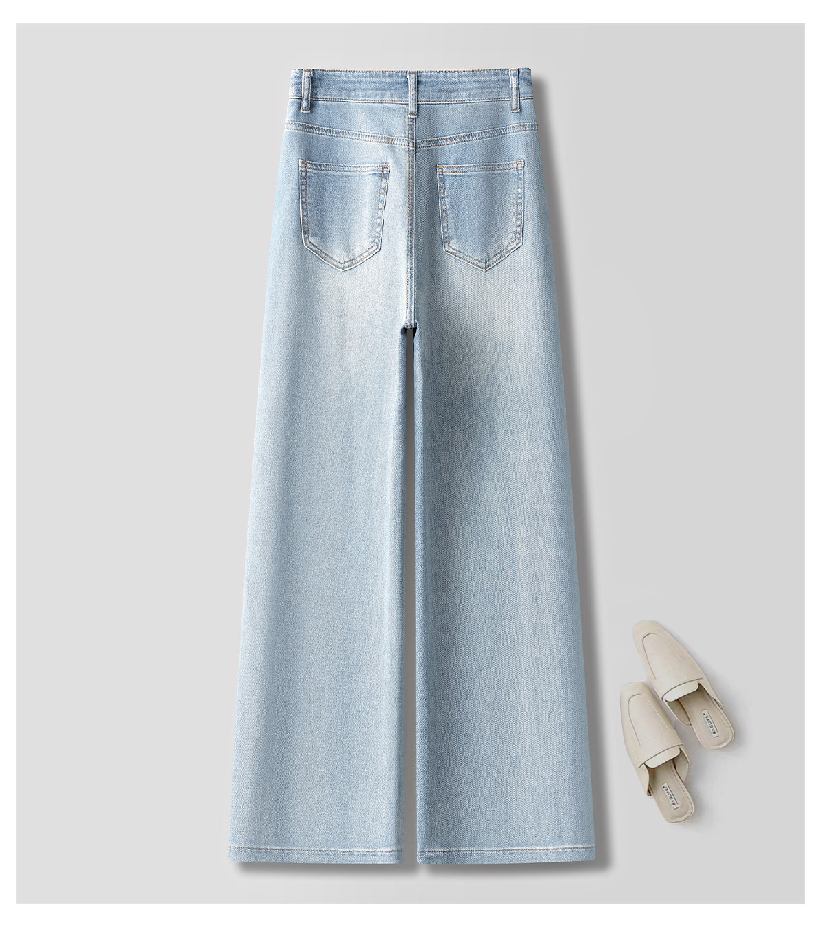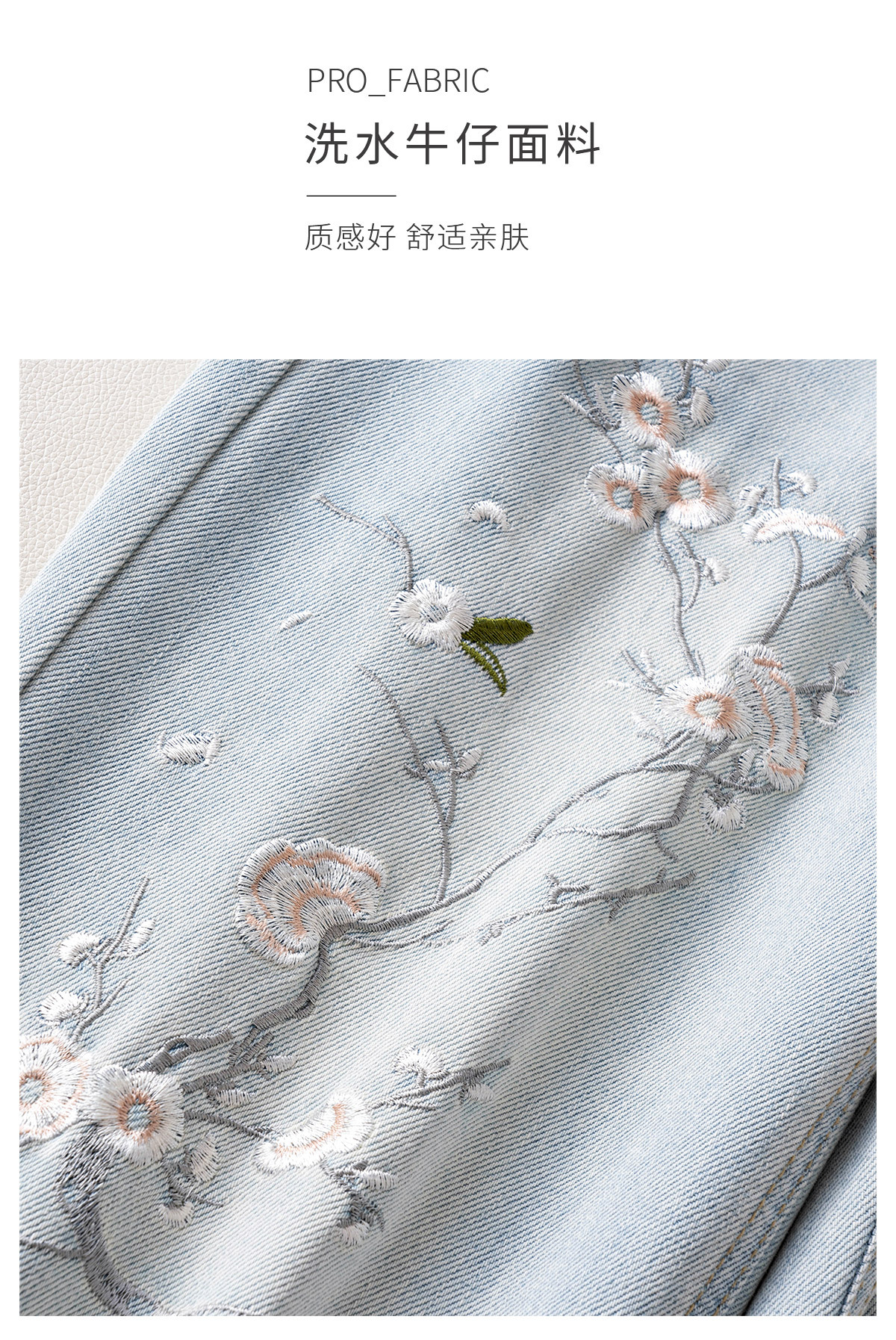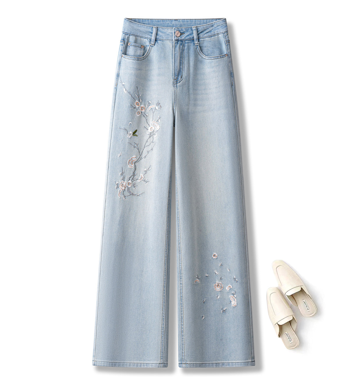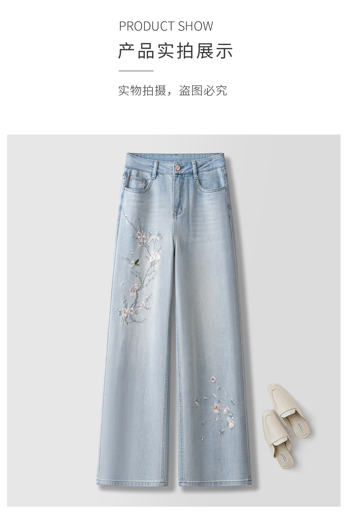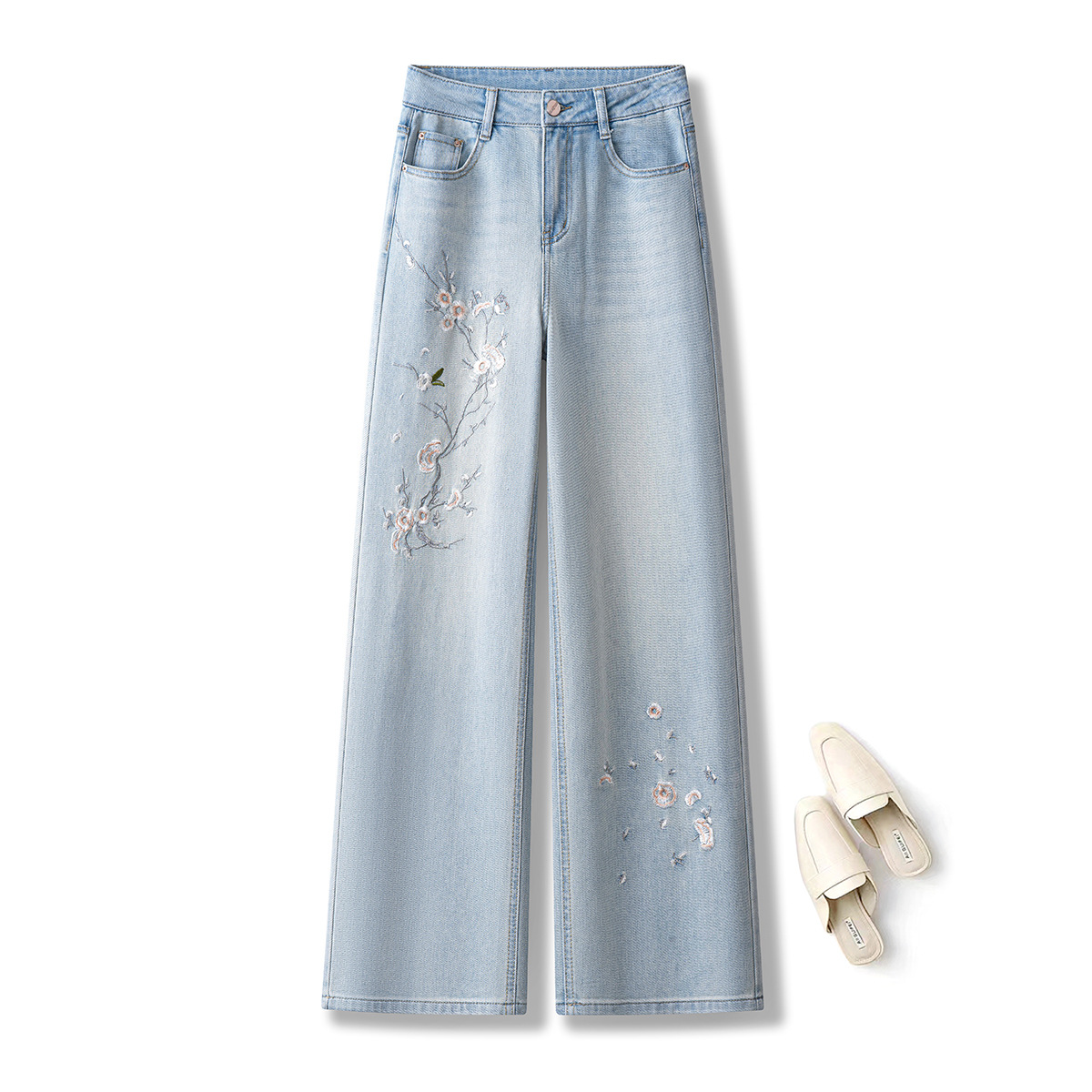 여성을위한 중국 스타일 수 놓은 와이드 레그 청바지 2025 새로운 슬림 루즈 스트레이트 바지 하이 웨이스트 캐주얼 바지