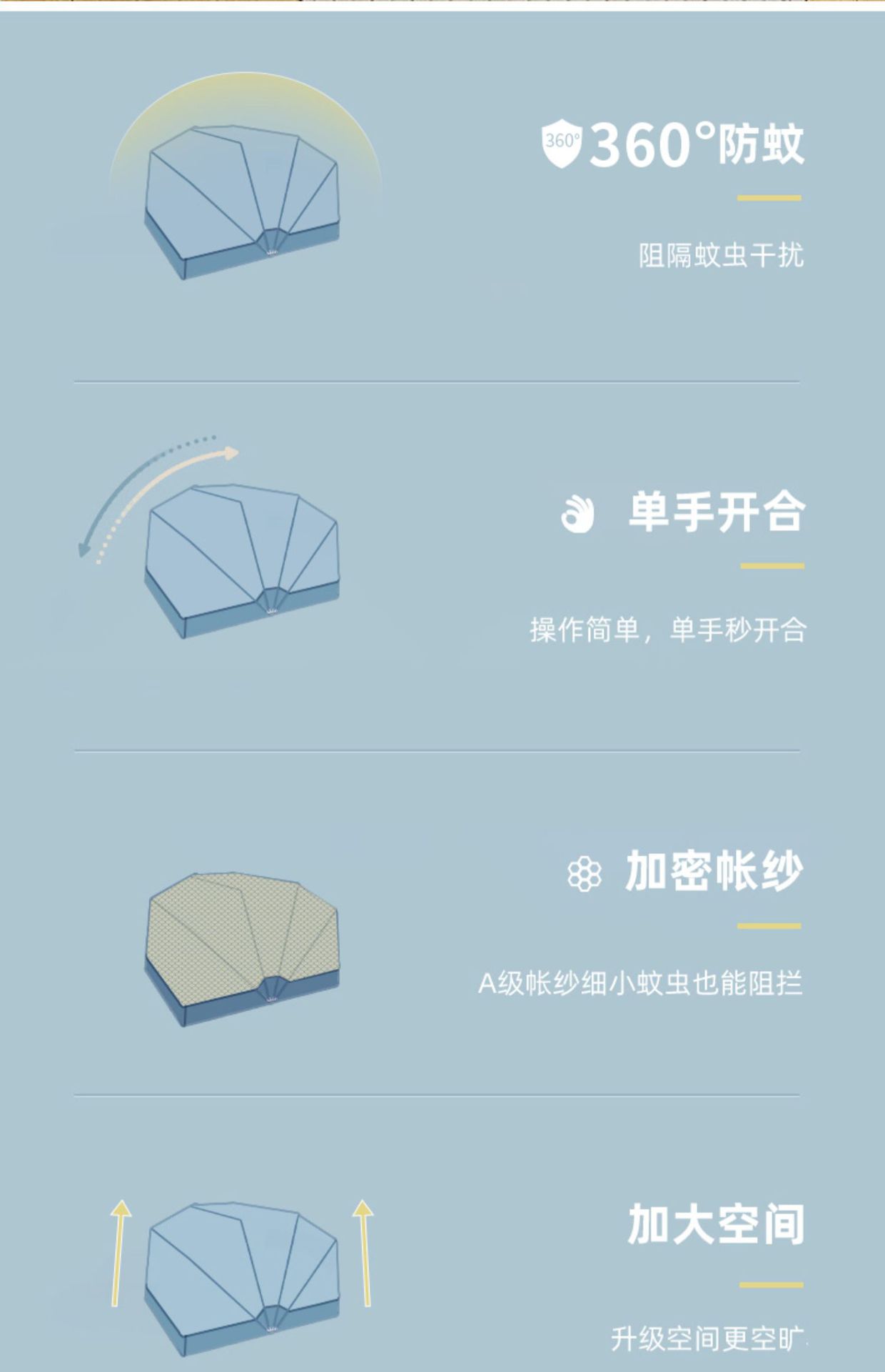 • 폭 0.9m 침대 [모기장 폭 80x 길이 190cm] 설치가 필요 없고 접기가 쉽습니다.