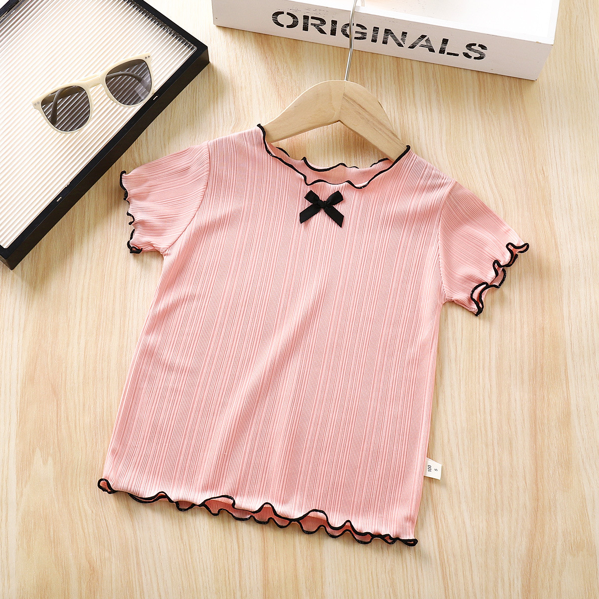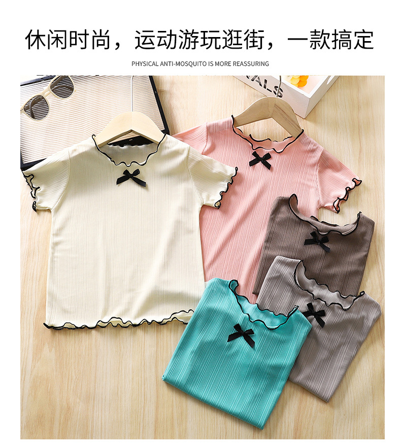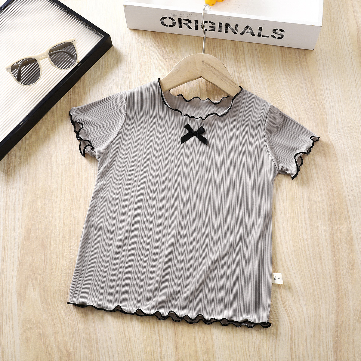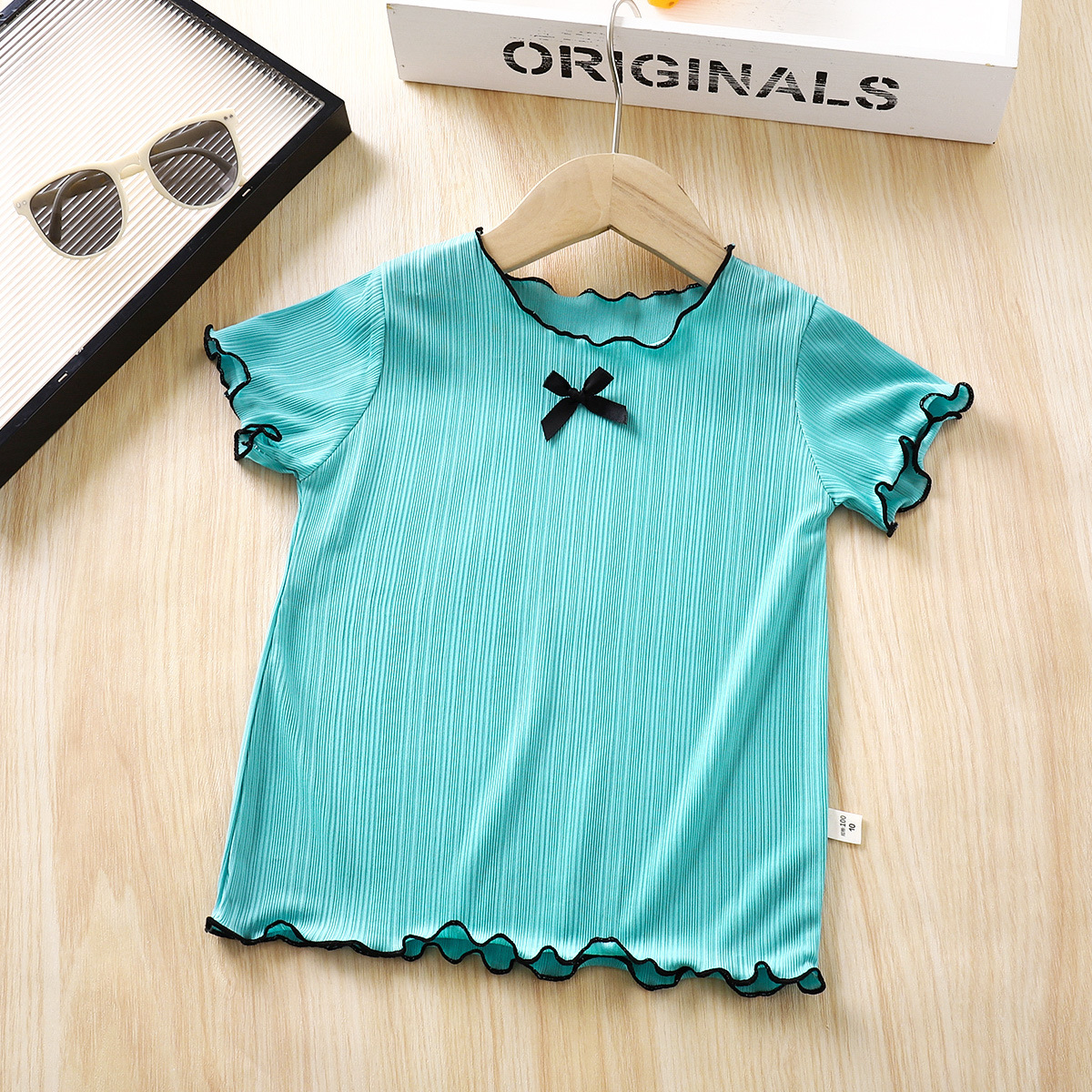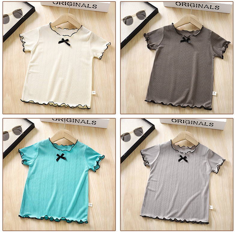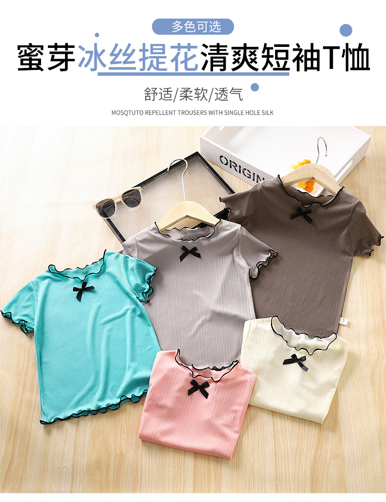 여름 얇은 여자 티셔츠 한국 둥근 목 귀 테두리 반팔 여름 새 스타일 아기 소녀의 서양식 아이스 실크 탑