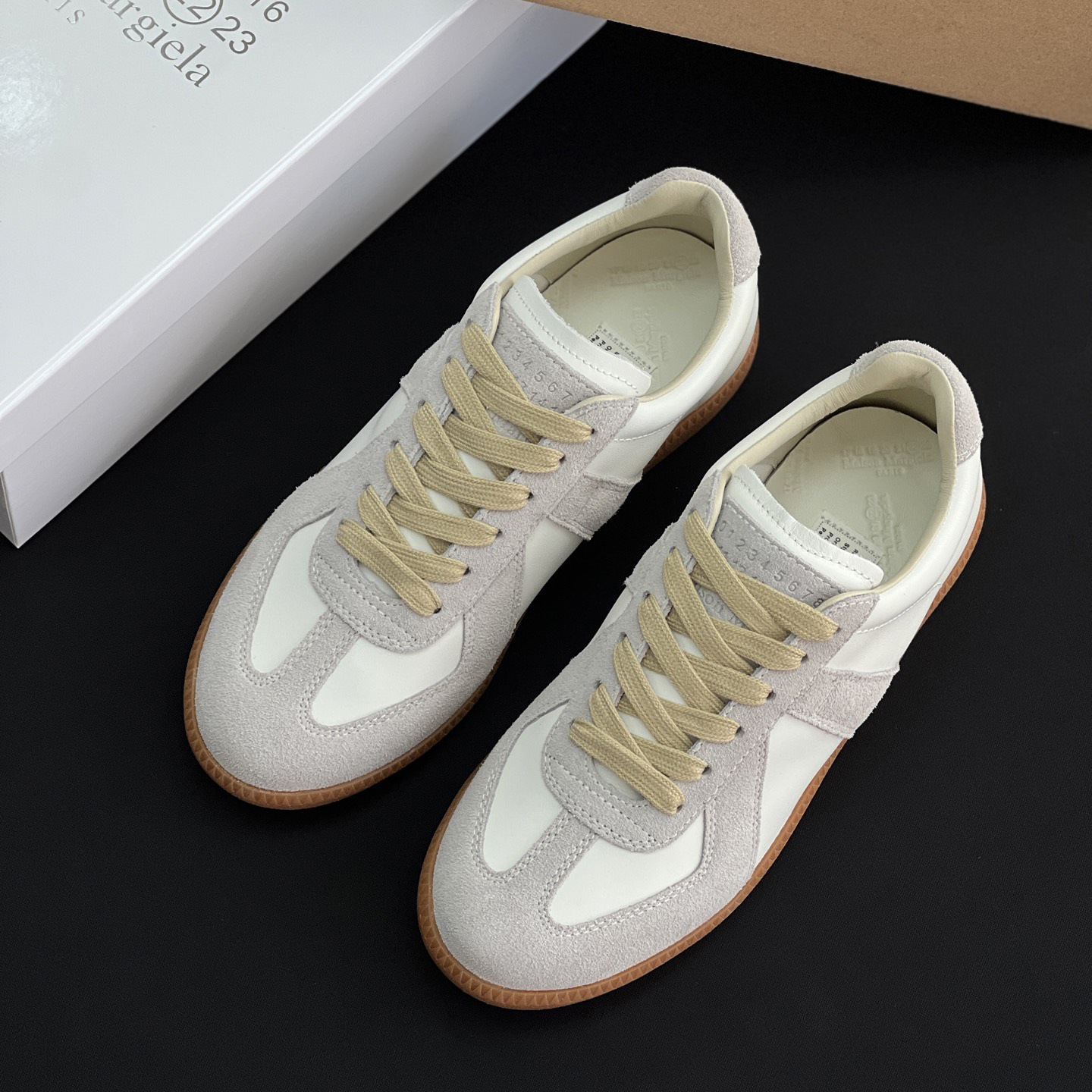 灰白拼接的设计+黄色的橡胶底
