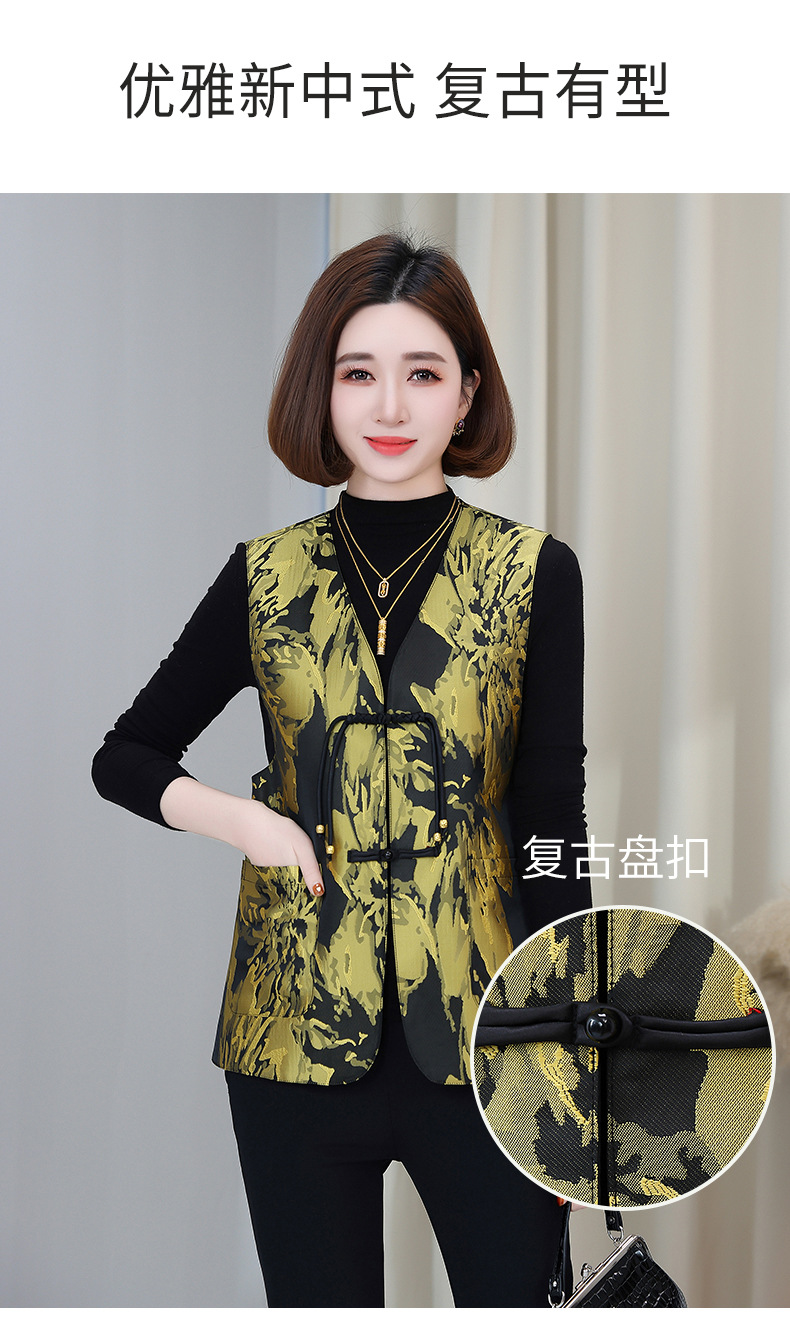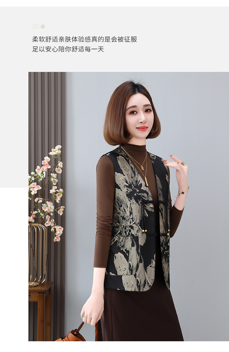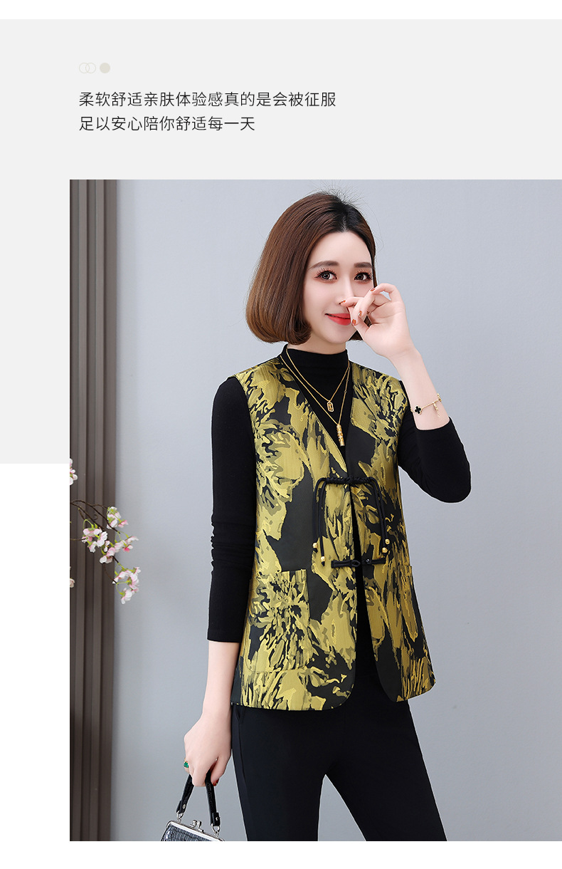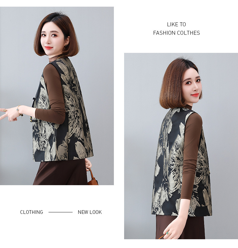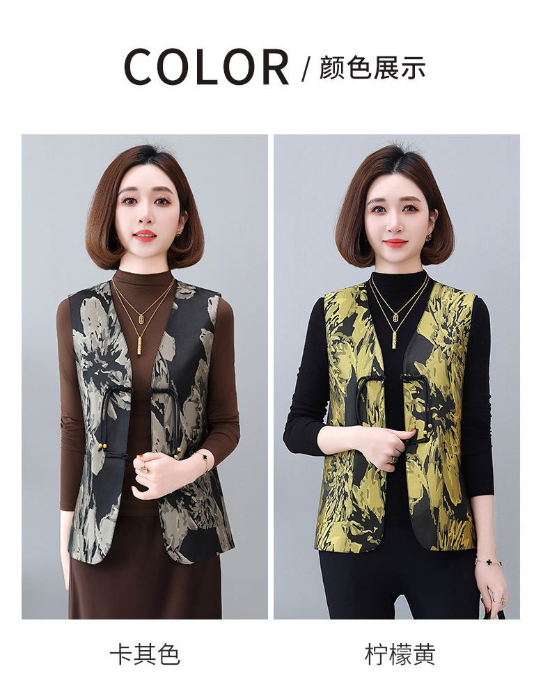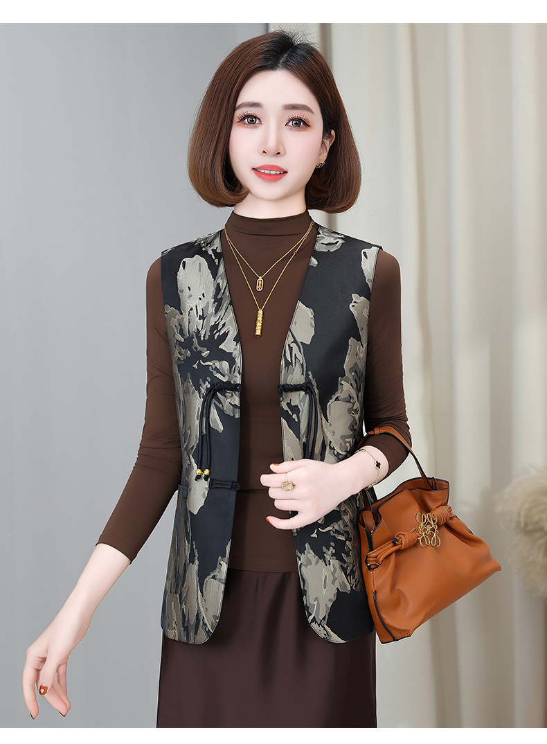 새로운 중국 스타일 국가 스타일 조끼 여성의 하이 엔드 봄과 가을 인쇄 바느질 휴가 어깨 빈티지 버클 술 콜라리스 여성 조끼스토어 가기