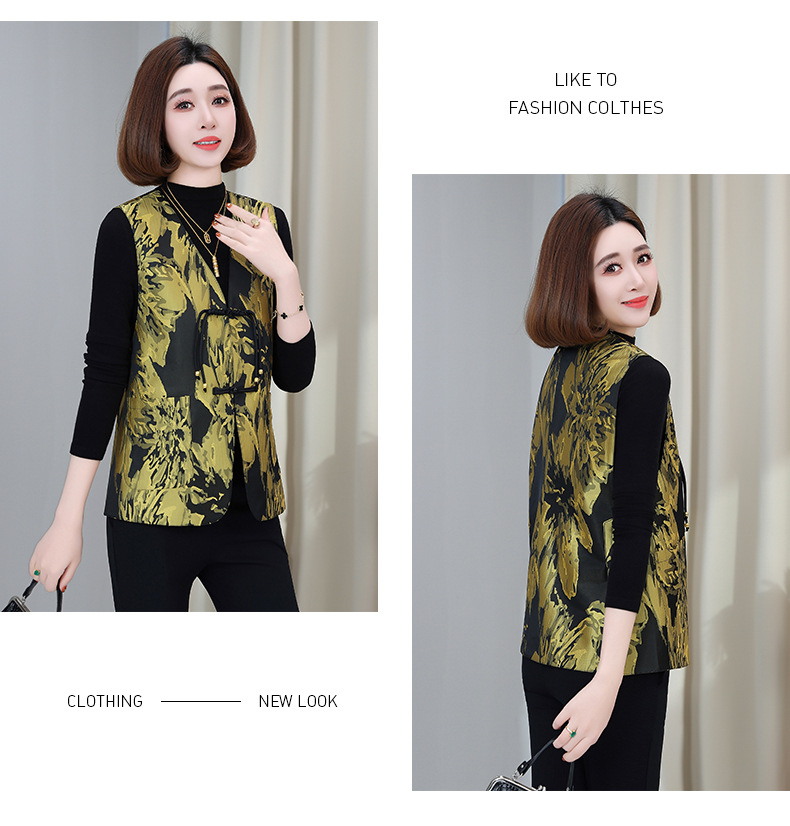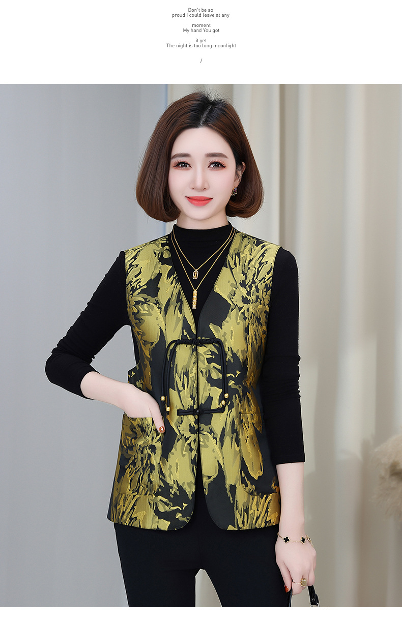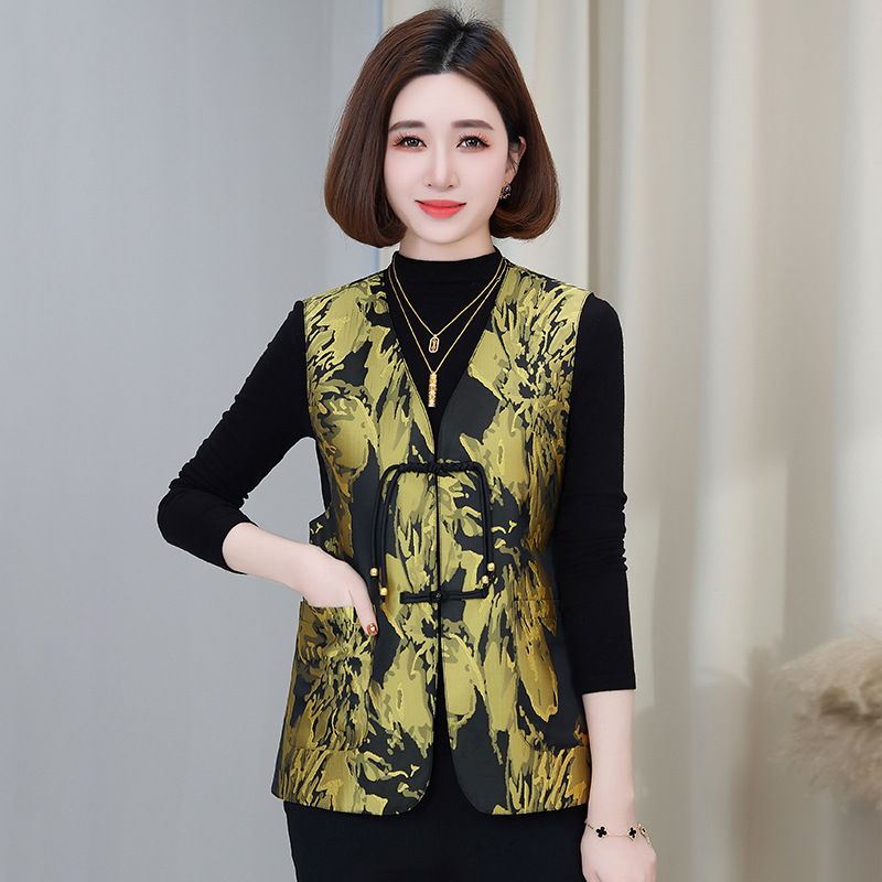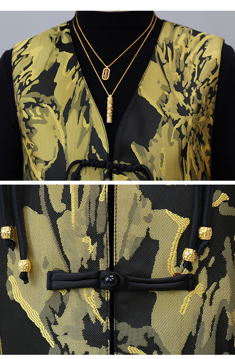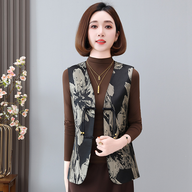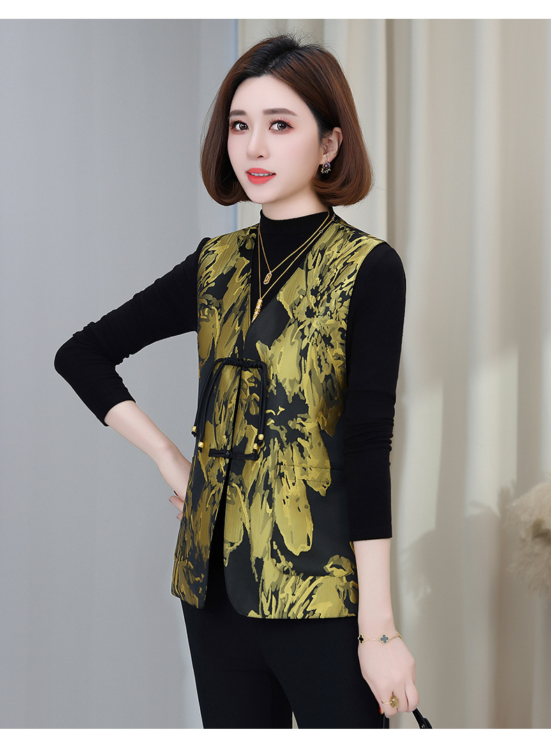 새로운 중국 스타일 국가 스타일 조끼 여성의 하이 엔드 봄과 가을 인쇄 바느질 휴가 어깨 빈티지 버클 술 콜라리스 여성 조끼스토어 가기
