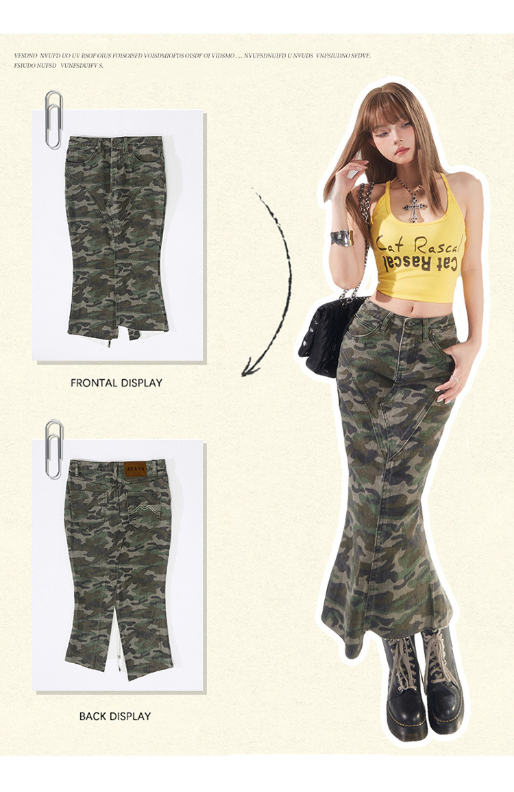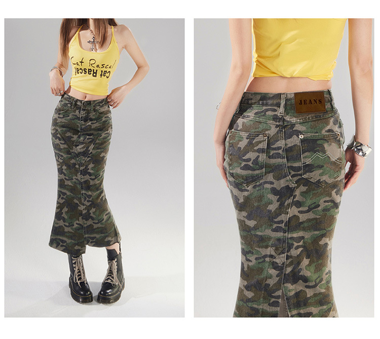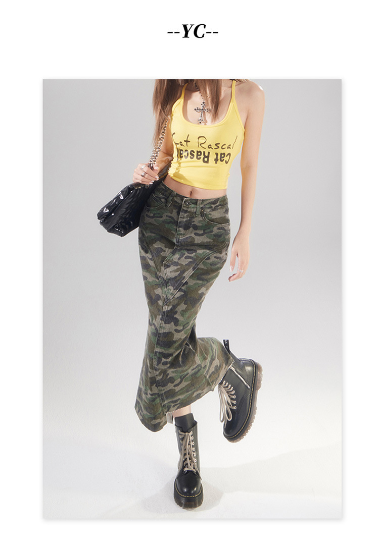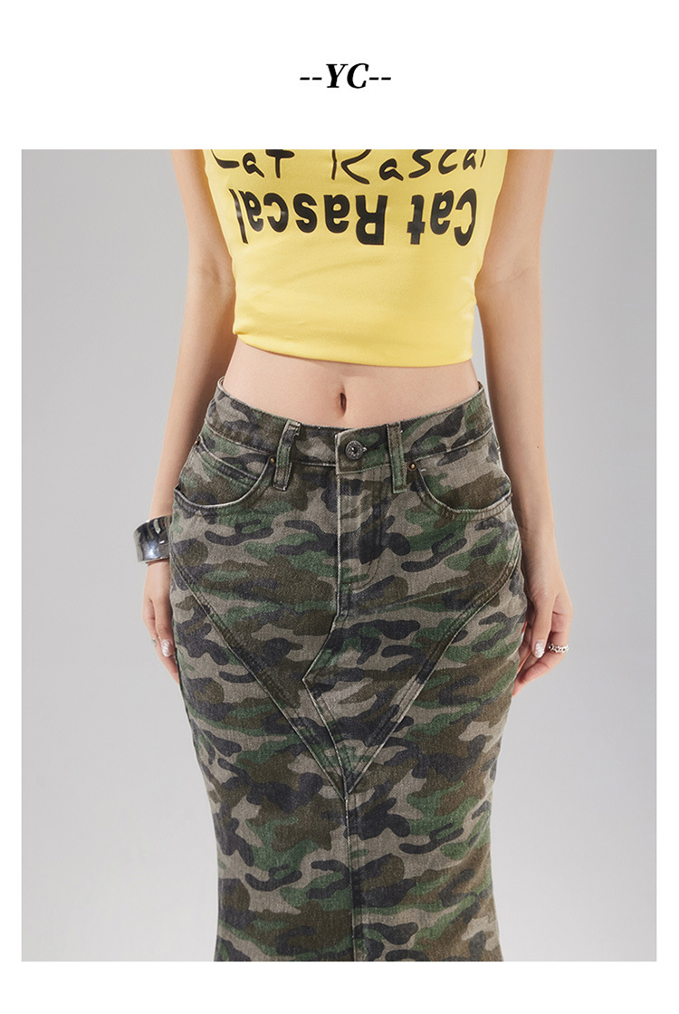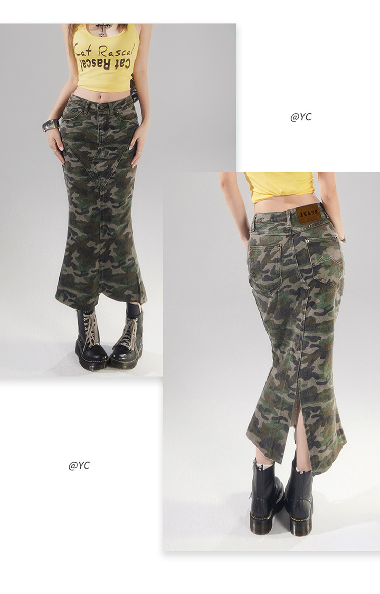 YC & 미국 레트로 높은 허리 스파이스 소녀 위장 스커트 틈새 피쉬 스커트 올 매치 슬림 핏 슬림 데님 스커트