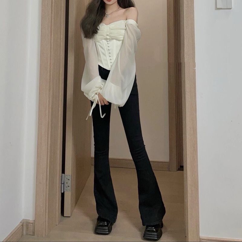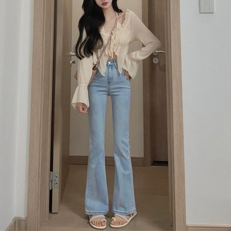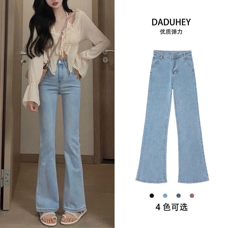 라이트 블루 마이크로 라 청바지 여성의 가을 2022 년 새로운 높은 허리 슬림 스트레이트 튜브 유연한 경적 바지