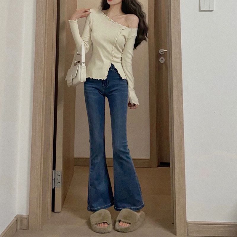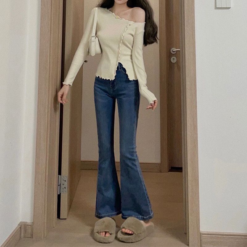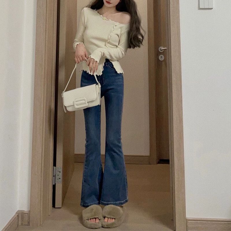 라이트 블루 마이크로 라 청바지 여성의 가을 2022 년 새로운 높은 허리 슬림 스트레이트 튜브 유연한 경적 바지스토어 가기