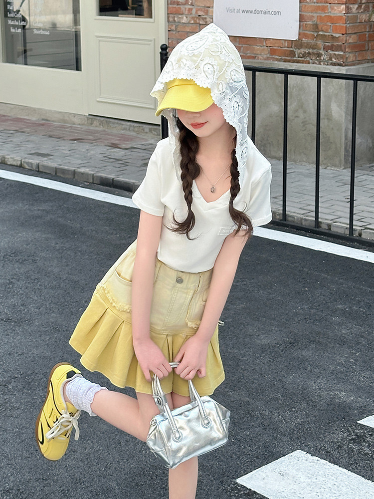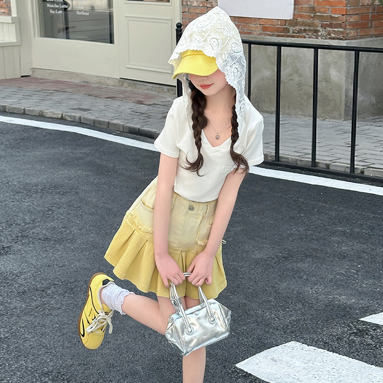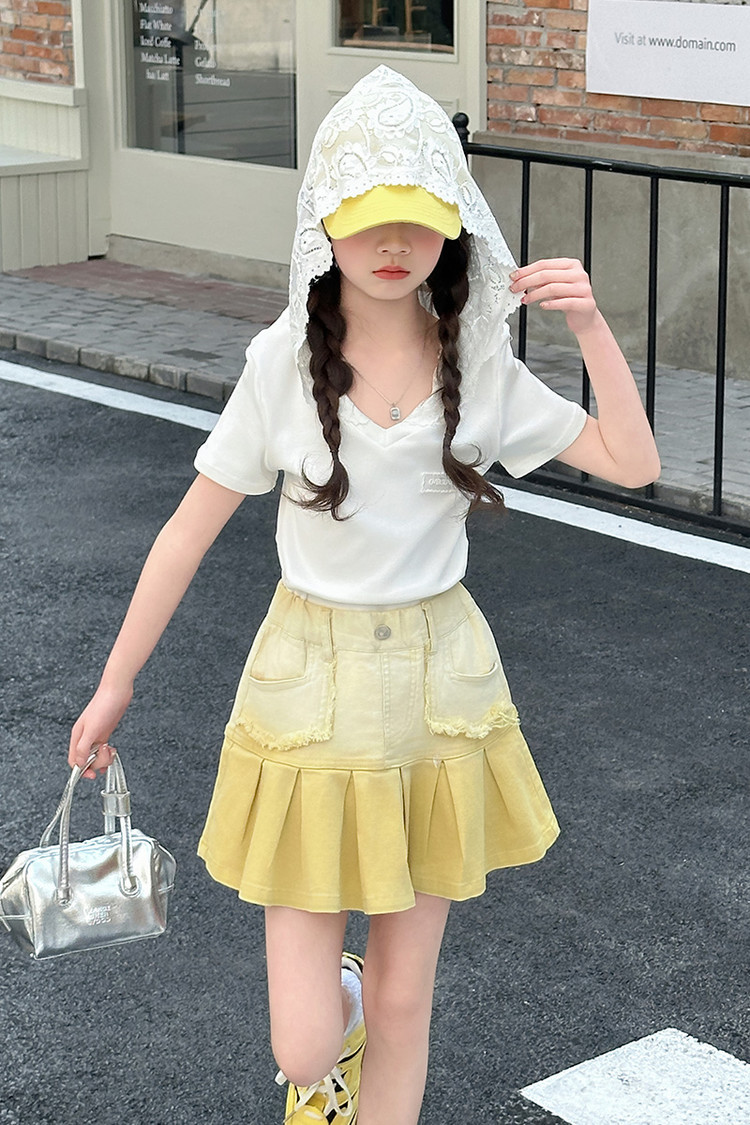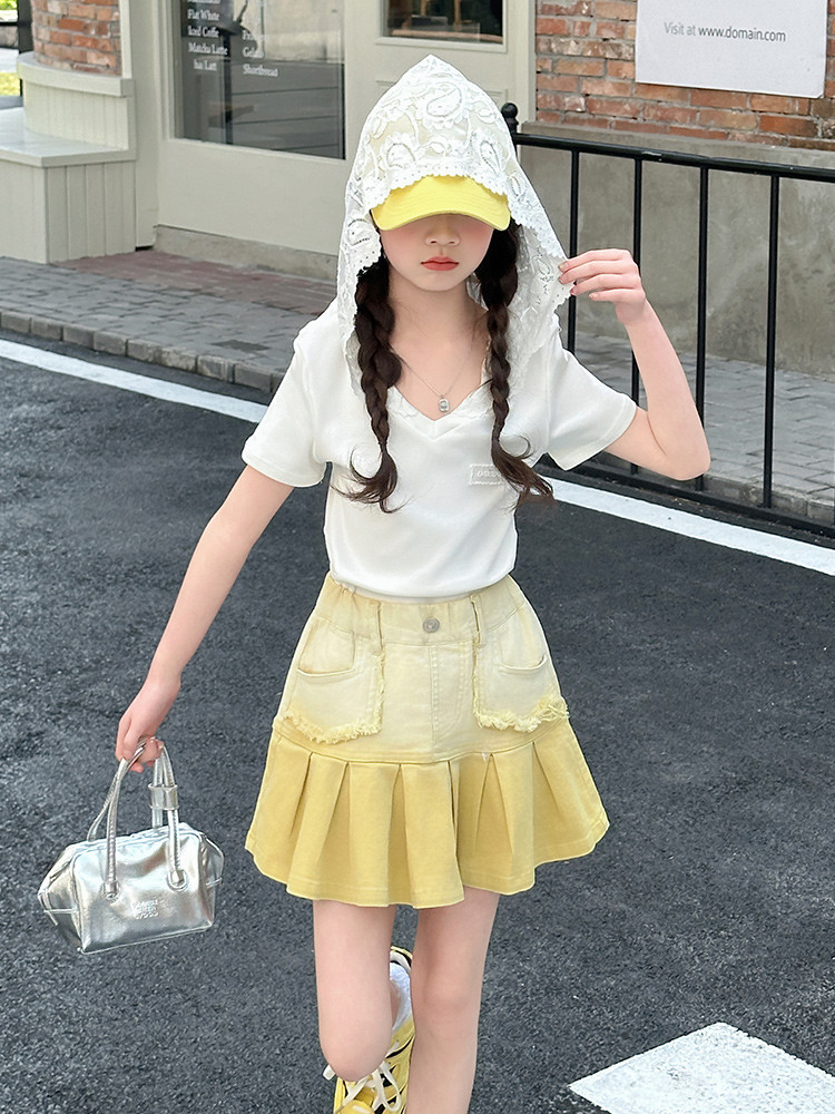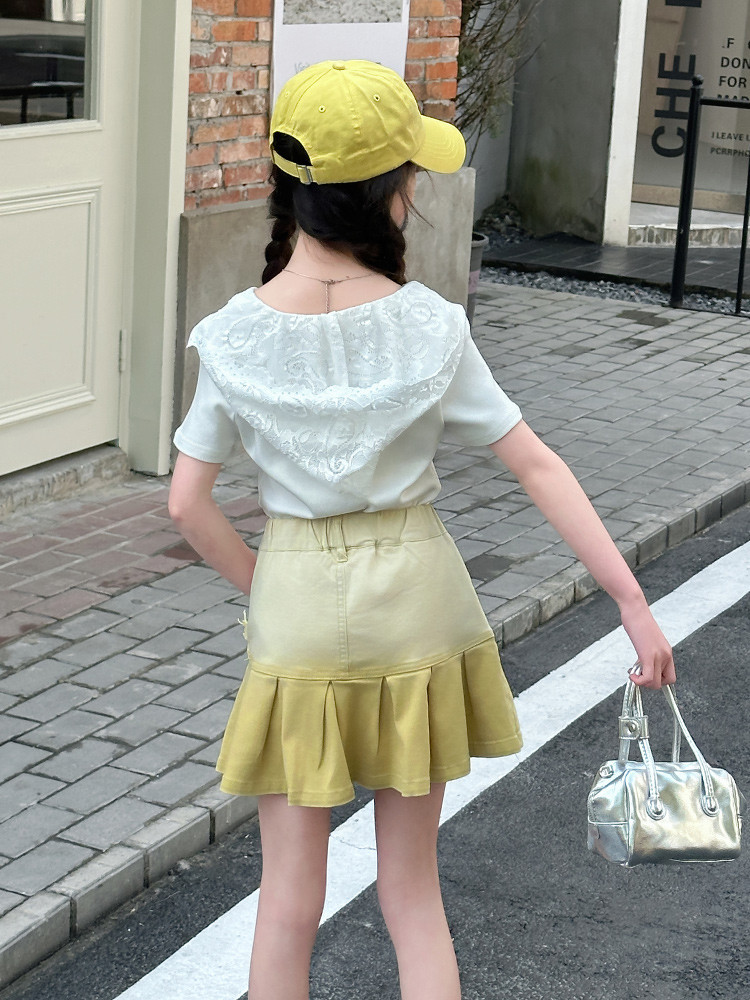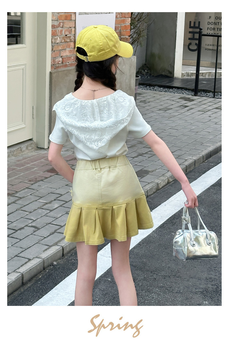 여자 여름 한국 스타일 레이스 후드 반팔 티셔츠 원피스 원피스 여성 빅 어린이 여름 원피스 짧은 치마 아동용 스커트 티셔츠