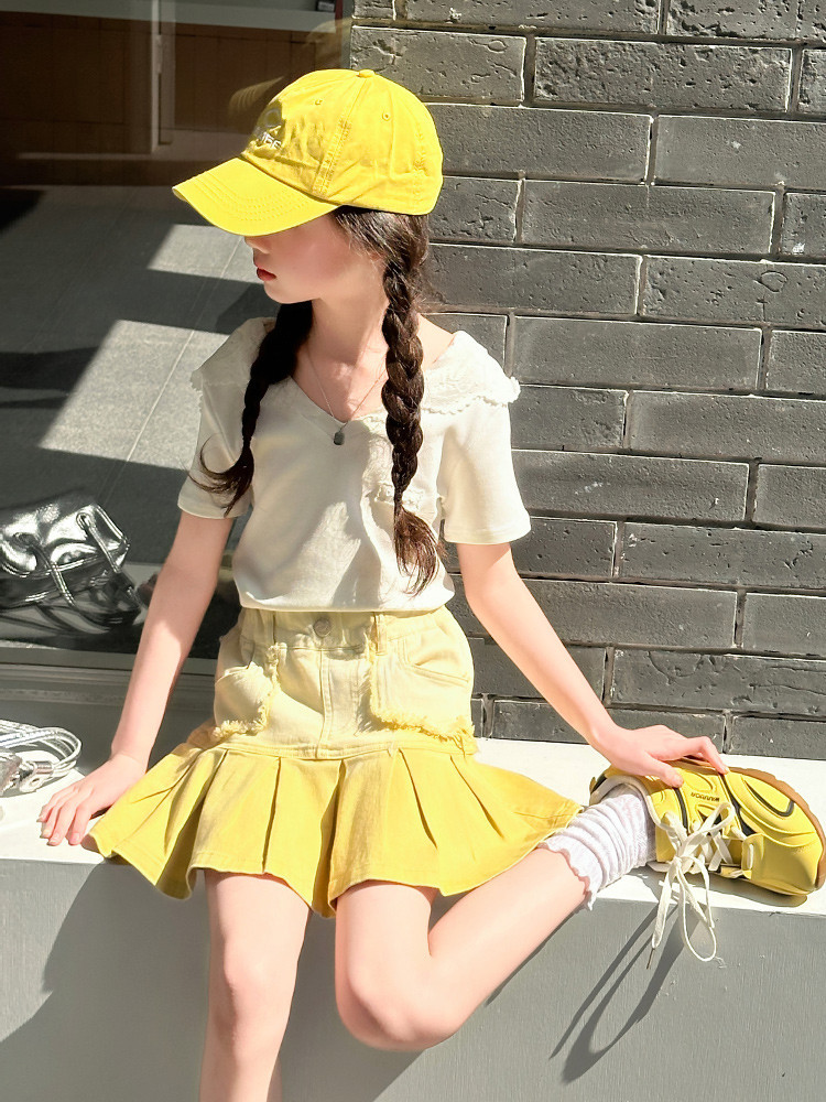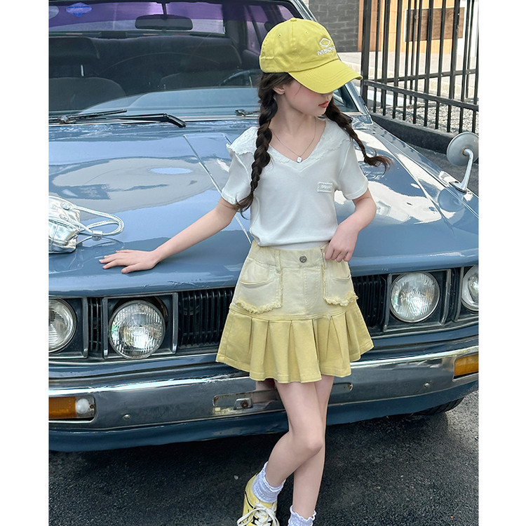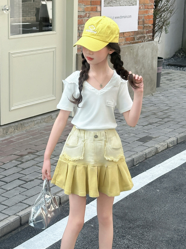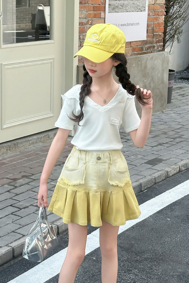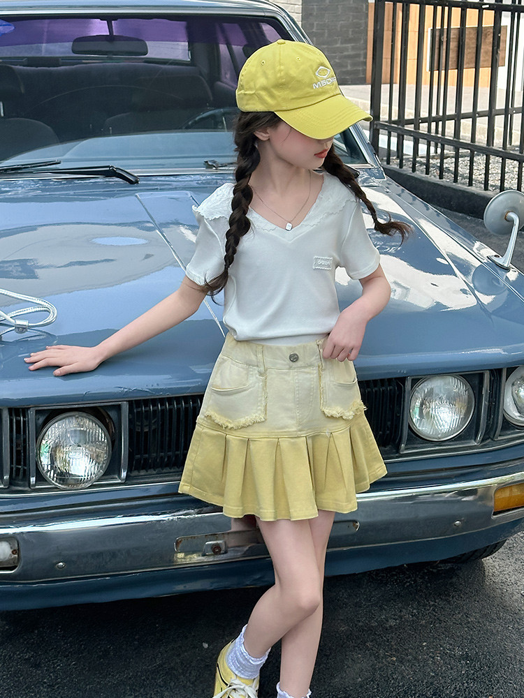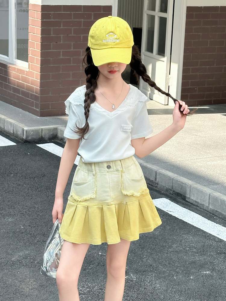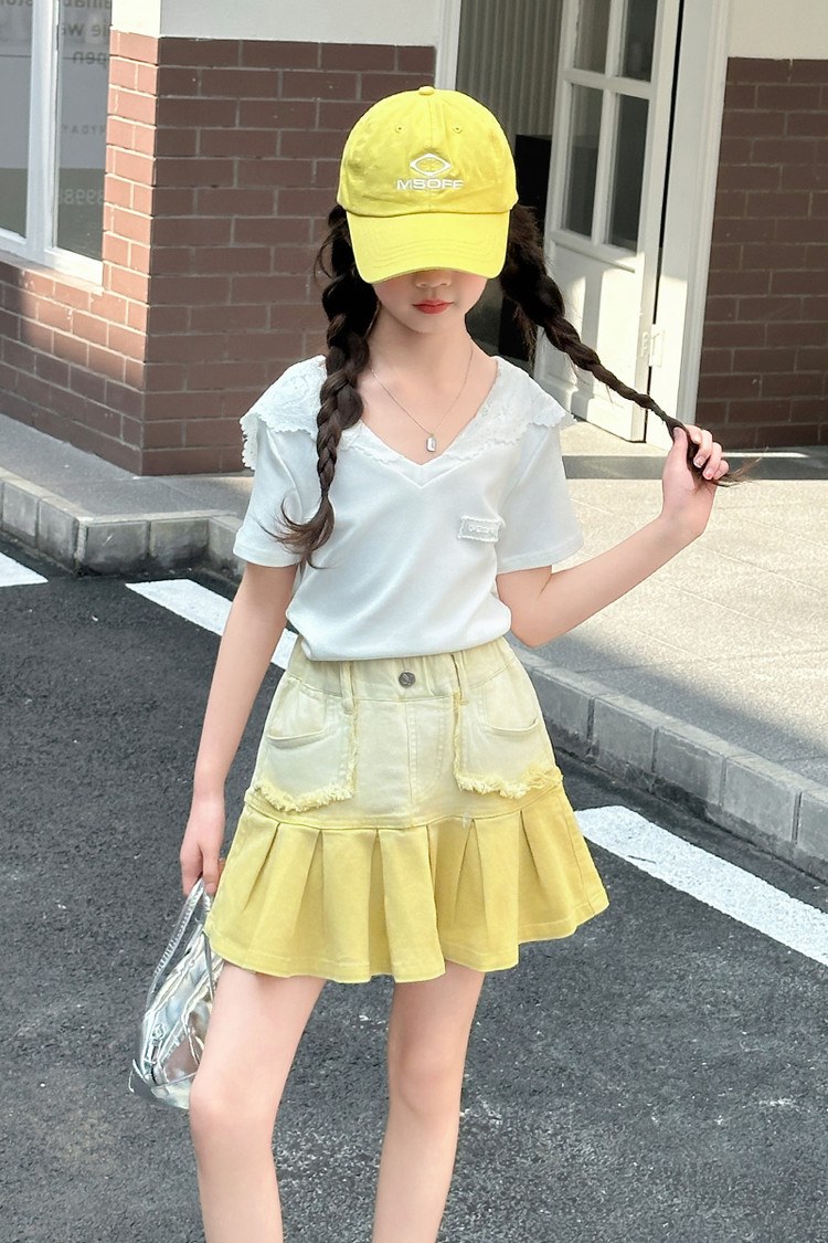 여자 여름 한국 스타일 레이스 후드 반팔 티셔츠 원피스 원피스 여성 빅 어린이 여름 원피스 짧은 치마 아동용 스커트 티셔츠