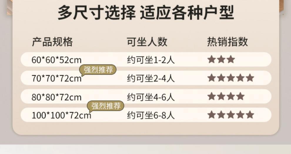 • 원래 색상 두꺼워진 80X80 측면 [설치가 필요 없고 보관이 용이함] 테이블 높이 72CM