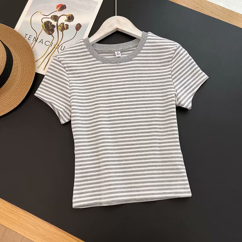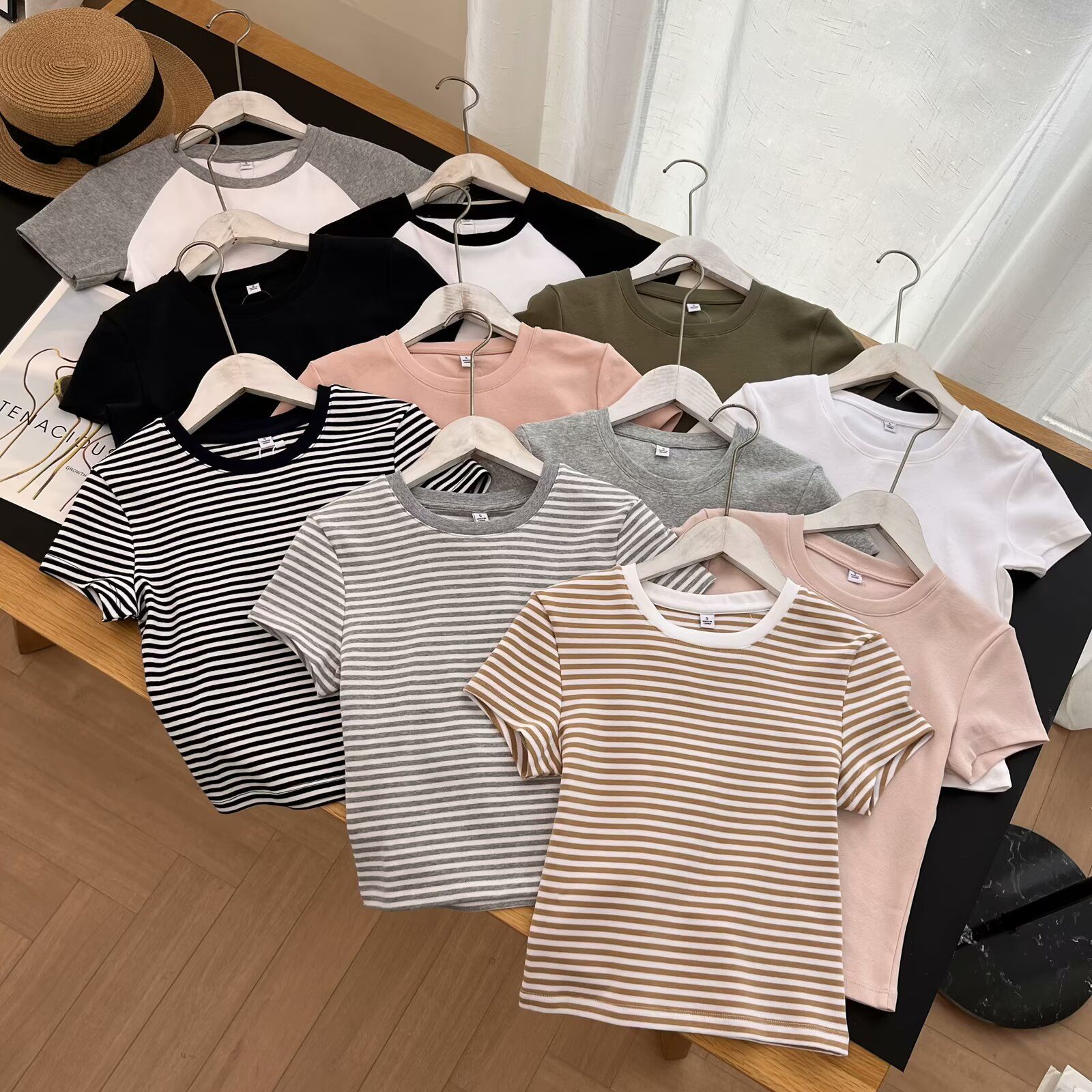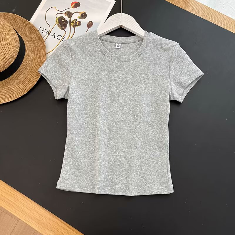 여성용 라운드 넥 짧은 티셔츠 반팔 미니 T 슬림 바닥 다목적 뜨거운 소녀 25 봄 여름 새로운 스타일 m474410스토어 가기