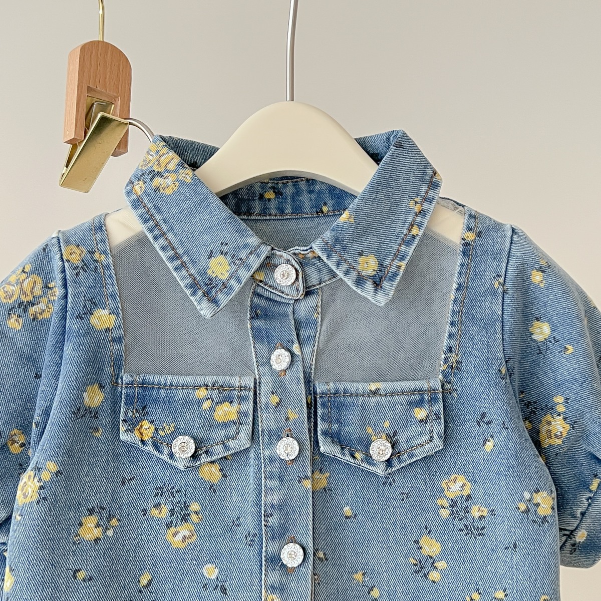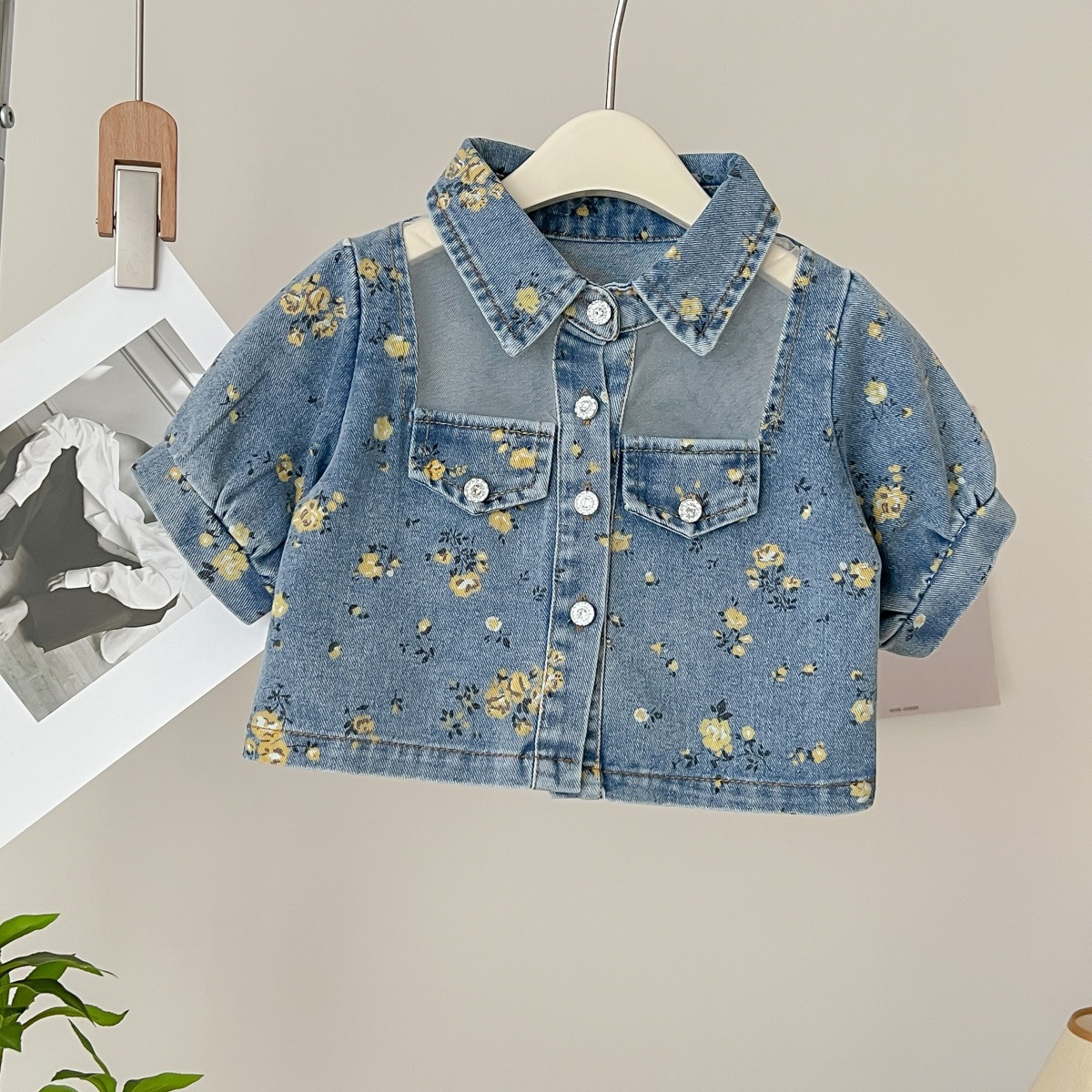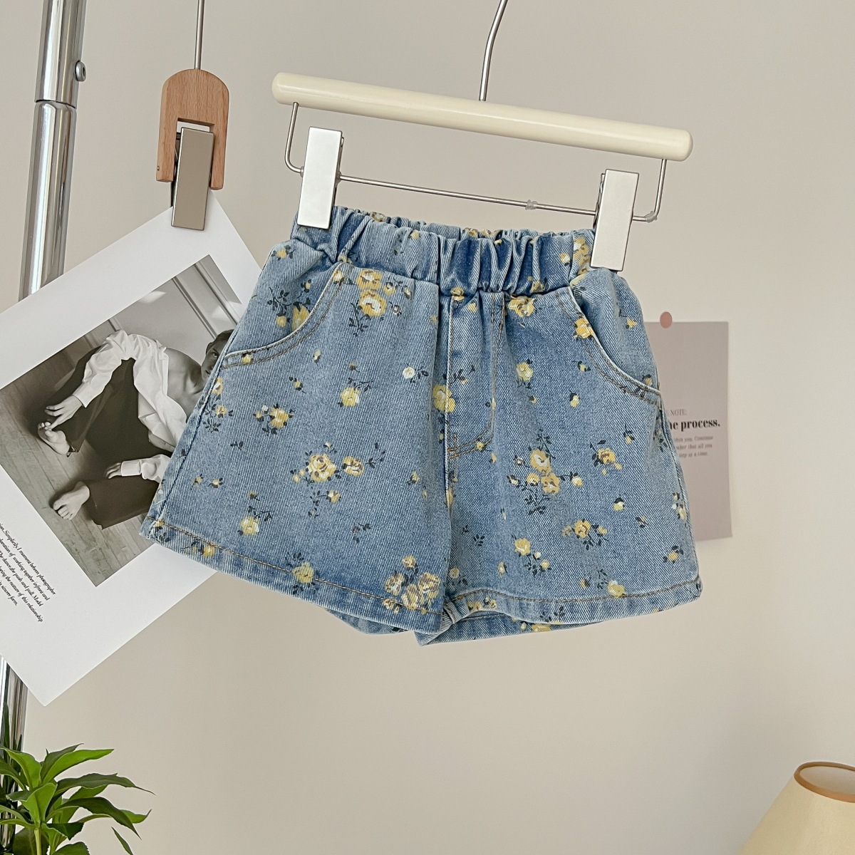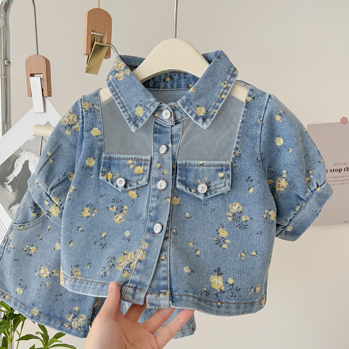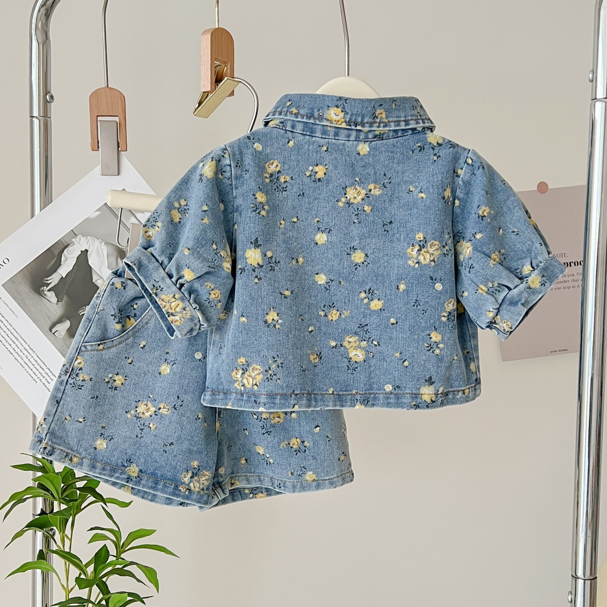 중소형 아동복을 위한 여름 한국식 아동복, 트렌디한 프린트 데님 반바지, 반팔 바지 정장, 아동복스토어 가기