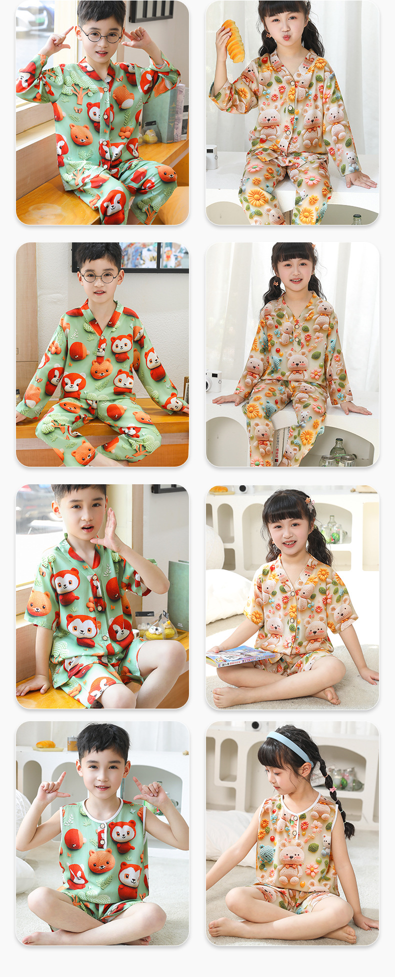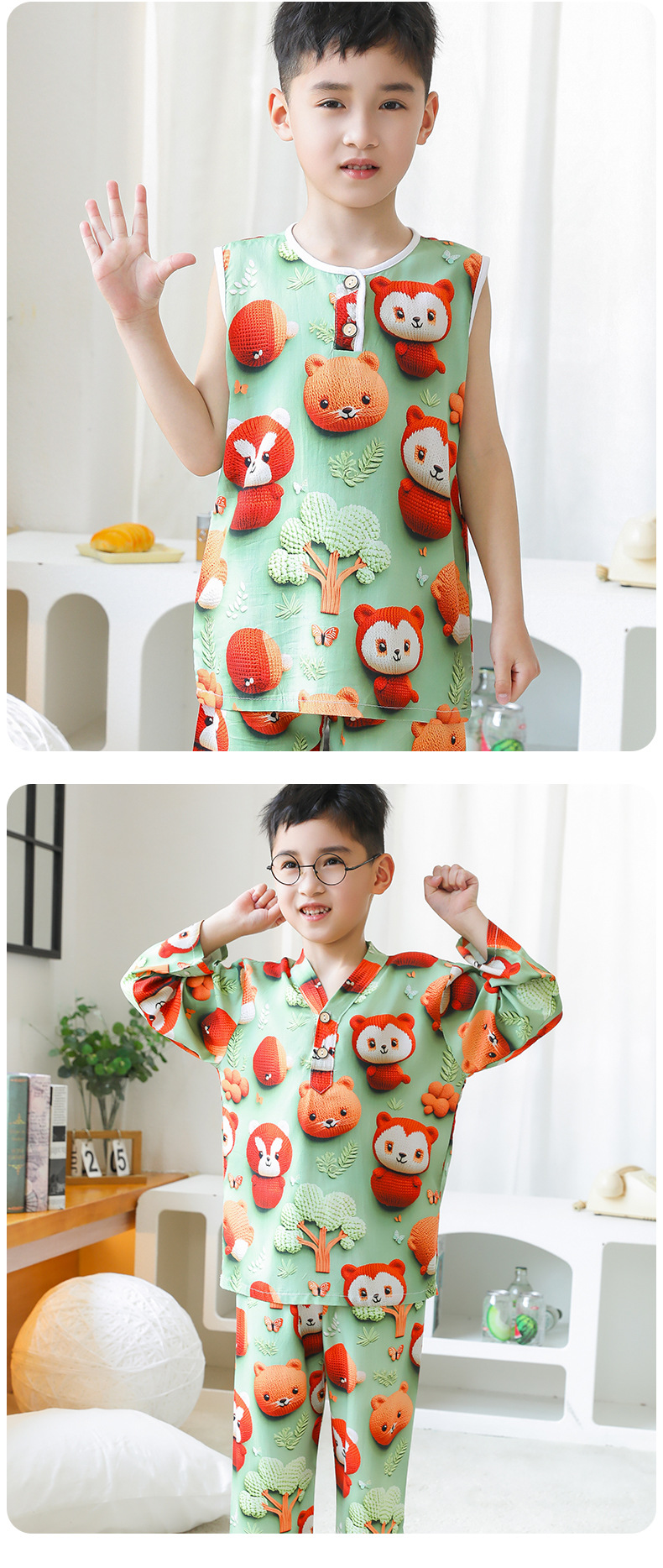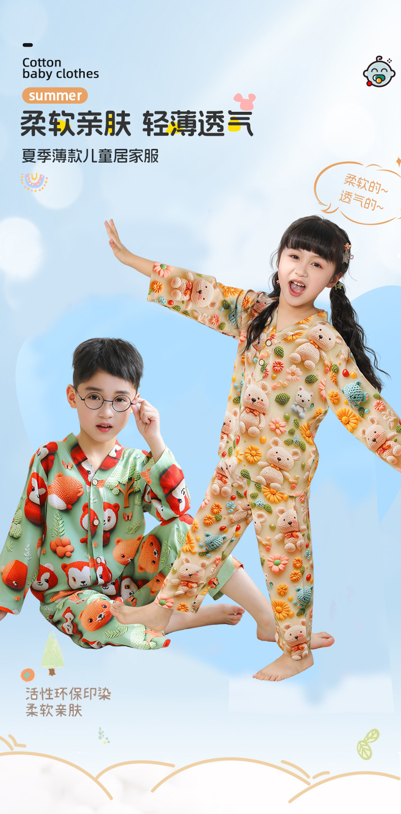 어린이 잠옷 여름 얇은 긴 소매 5D 코튼 실크 홈 의류 소년 소녀 용 에어컨 세트